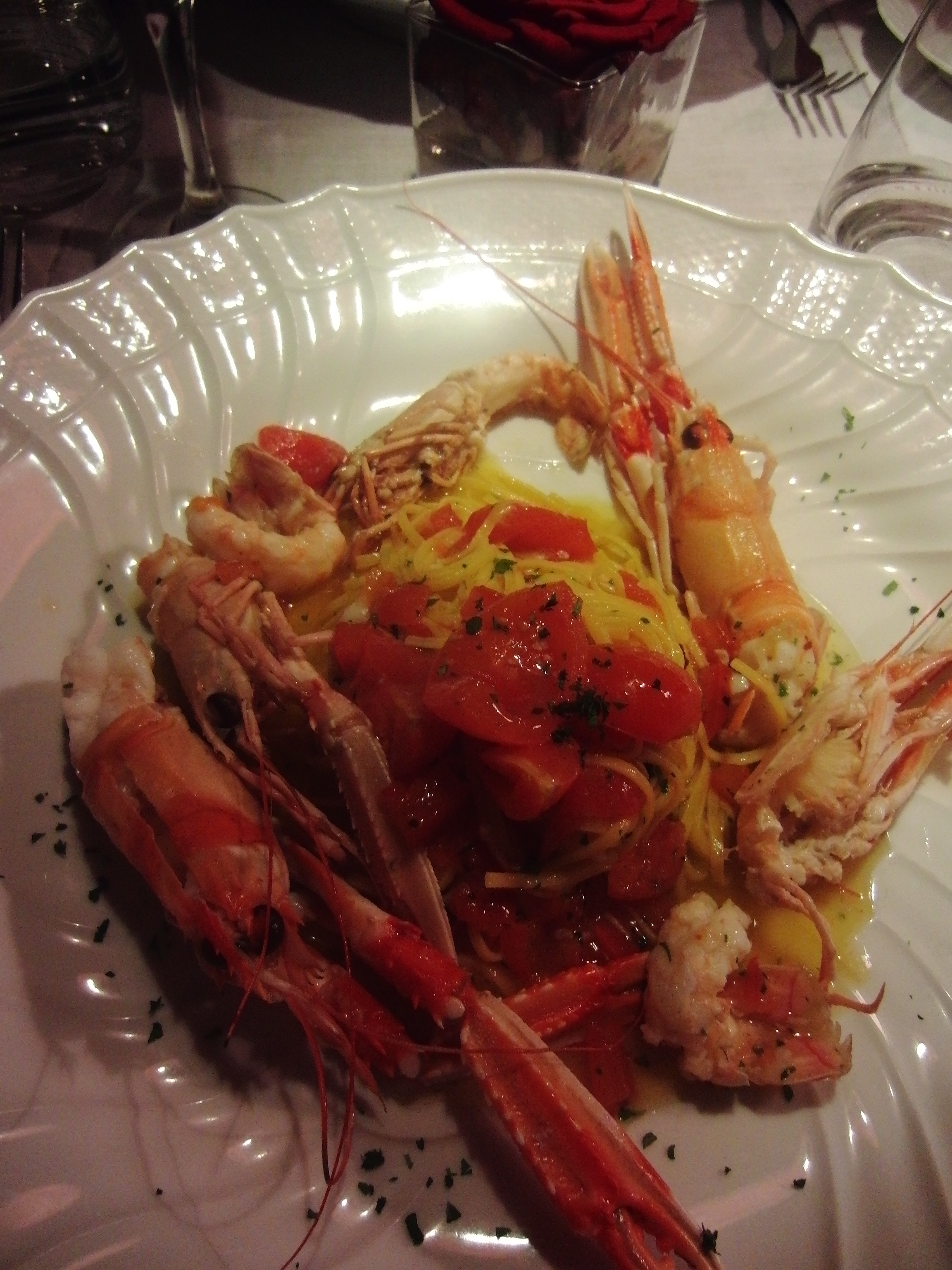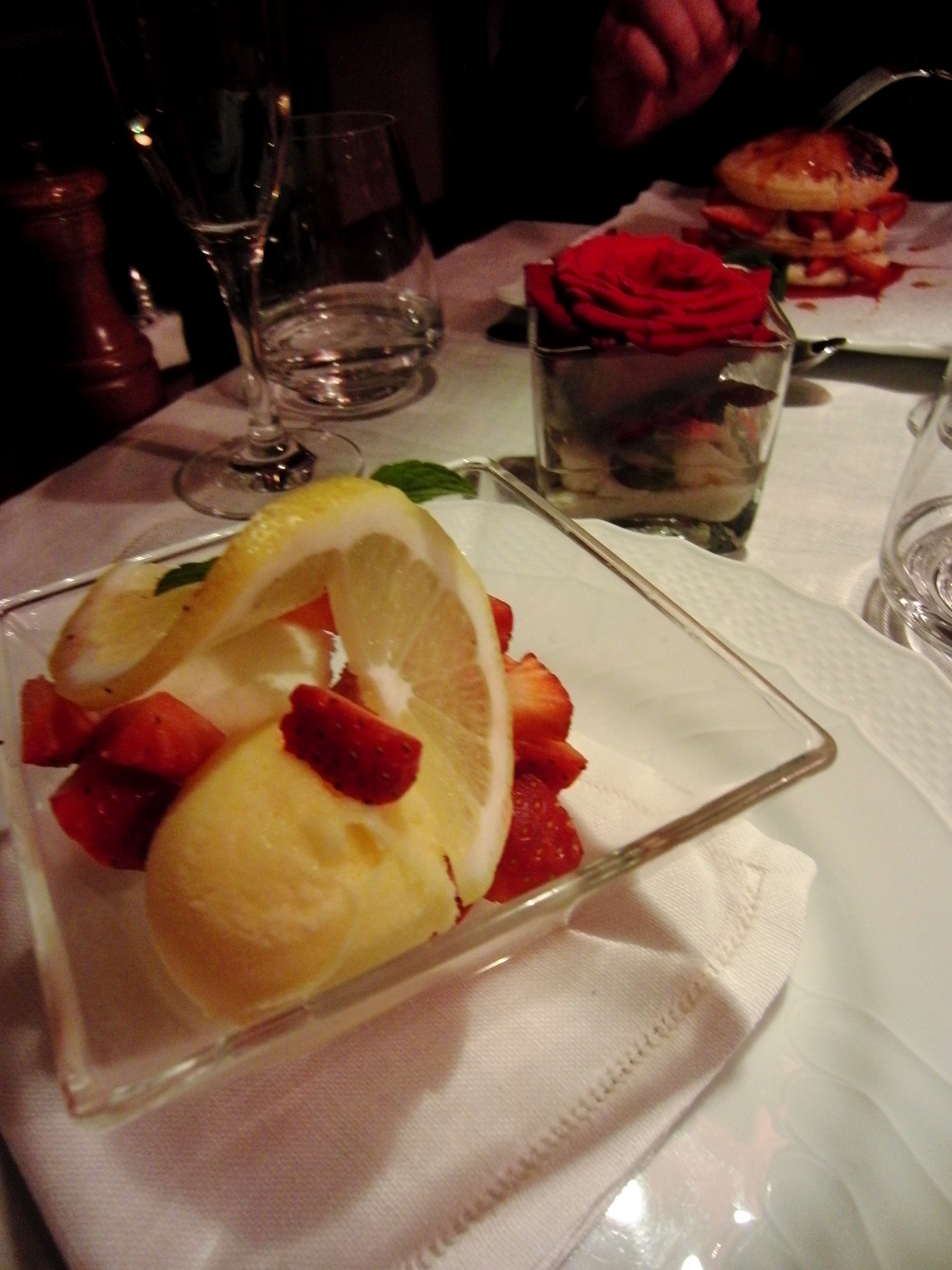 A morning spent in the restaurant’s kitchen was rewarded with a cozy dinner for two in the evening. Christian, my new Italian gentleman friend, and a fantastically sarcastic one at that, invited me to a late cena at the scene of my gourmet lezione (Italians eat quite late), We spent a drawn out meal going back and forth between English and Italiano and savoring each others’ beautifully presented dishes on stunning tableware. I regretfully did not photograph Christian’s gnocchi, but I did manage to take a few snapshots of the plates you see here. Above, homemade pasta with mixed seafood. Below, a strawberry foglie and my lean choice of fruit sorbet (positively boring in comparison to Christian’s foglie but prettily presented nevertheless).
