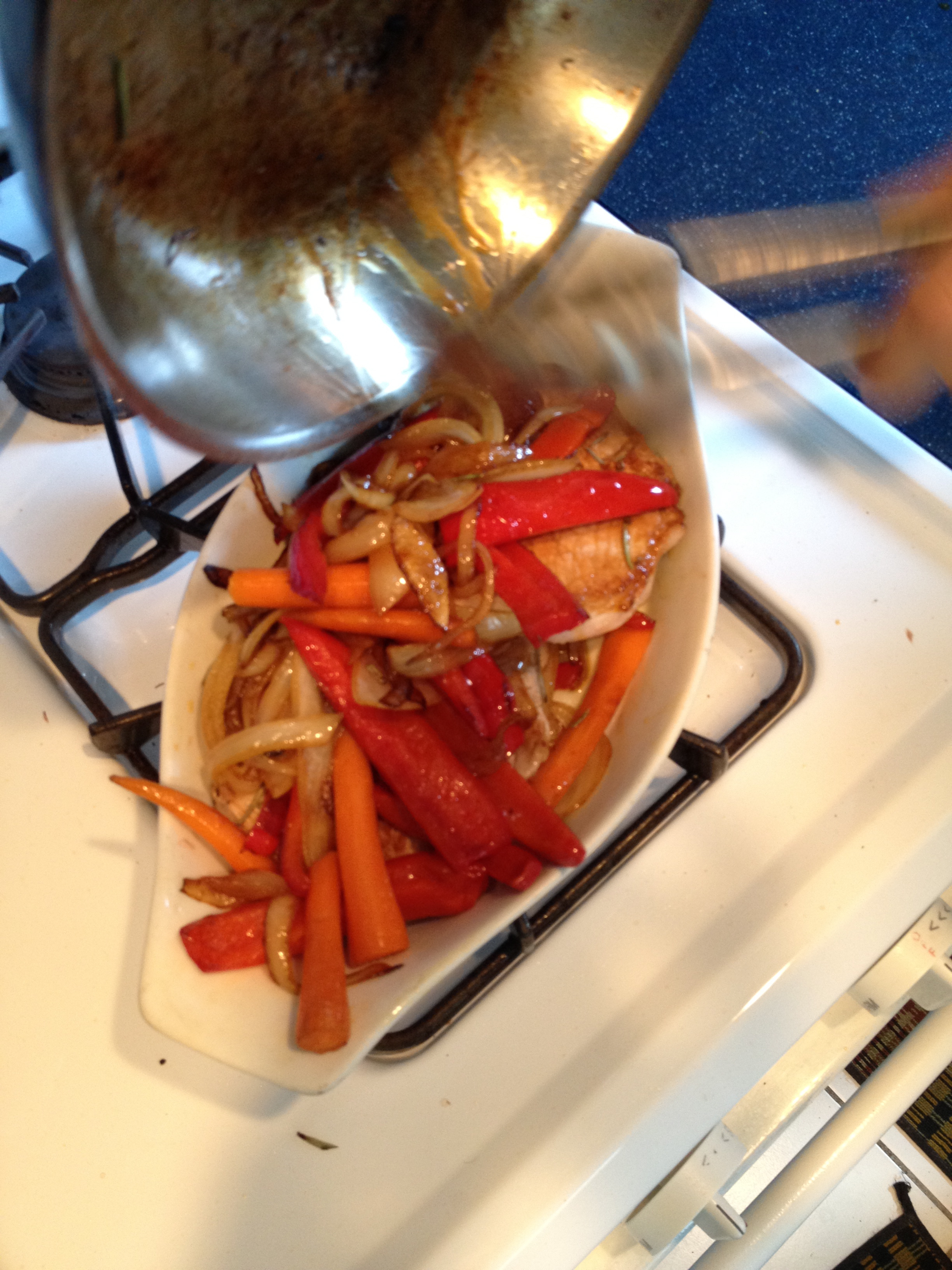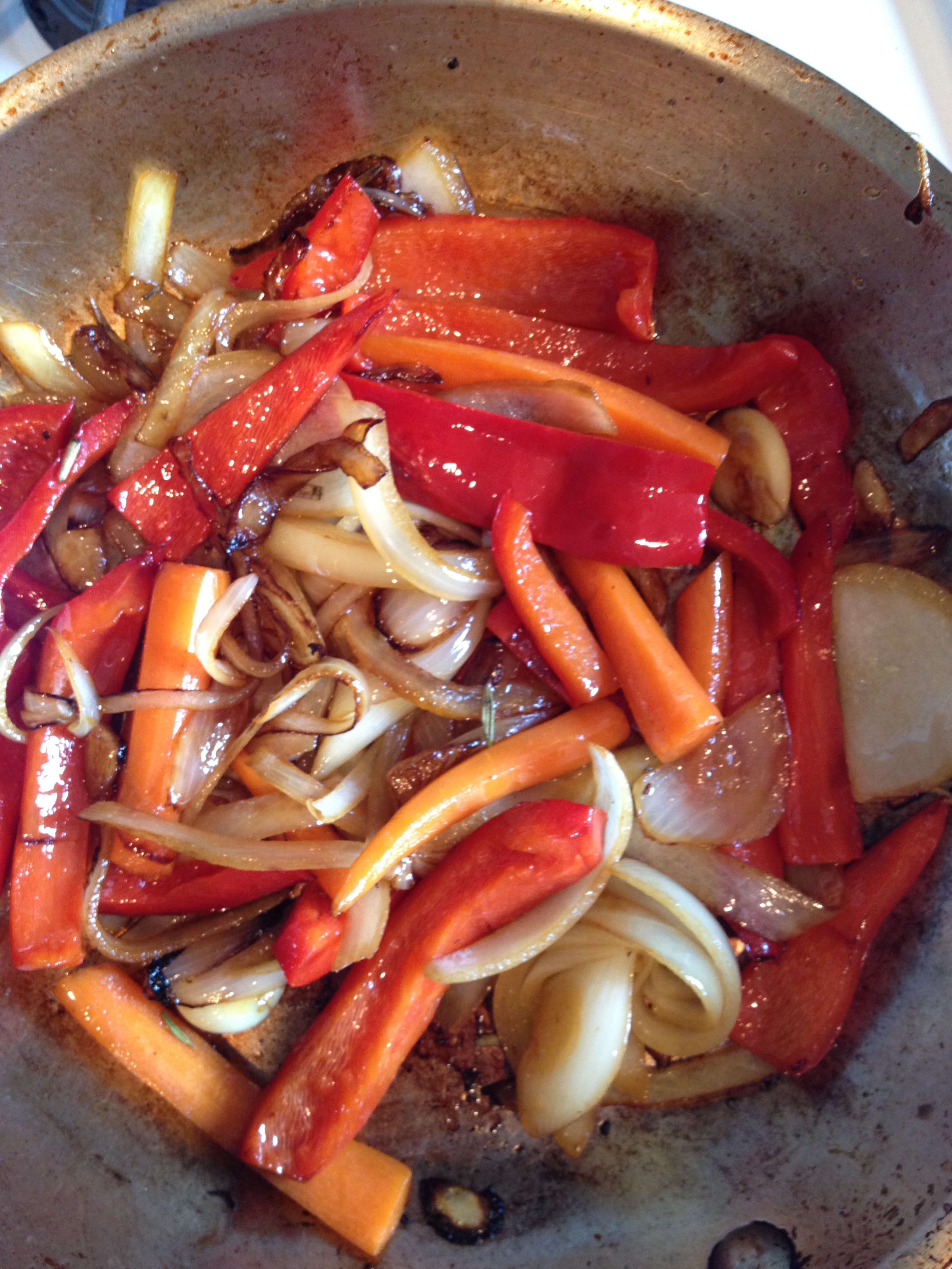 Preheat the oven to 350 degrees. Heat a large skillet over medium heat. Drizzle a little olive oil into the pan. Cut the onion in half, then, with the flat side face-down on the cutting board, slice the onion lengthwise. When the oil is hot, toss the onion into the pan. Let the onions cook down a bit so that they release their juices and become tender. Once tender, toss in the carrot and pepper strips. Stir occasionally. Cook until the vegetables are just tender. Put them in a baking dish and cover with aluminum foil to keep warm.