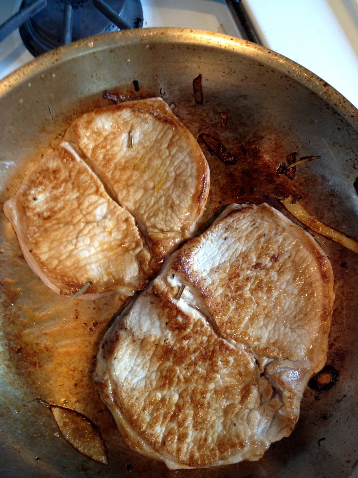 Season the pork loins with salt, pepper, and a little rosemary. Drizzle the pan with a little more oil, and put the loins in the hot pan. Cook until each side is golden, a few minutes on each side.