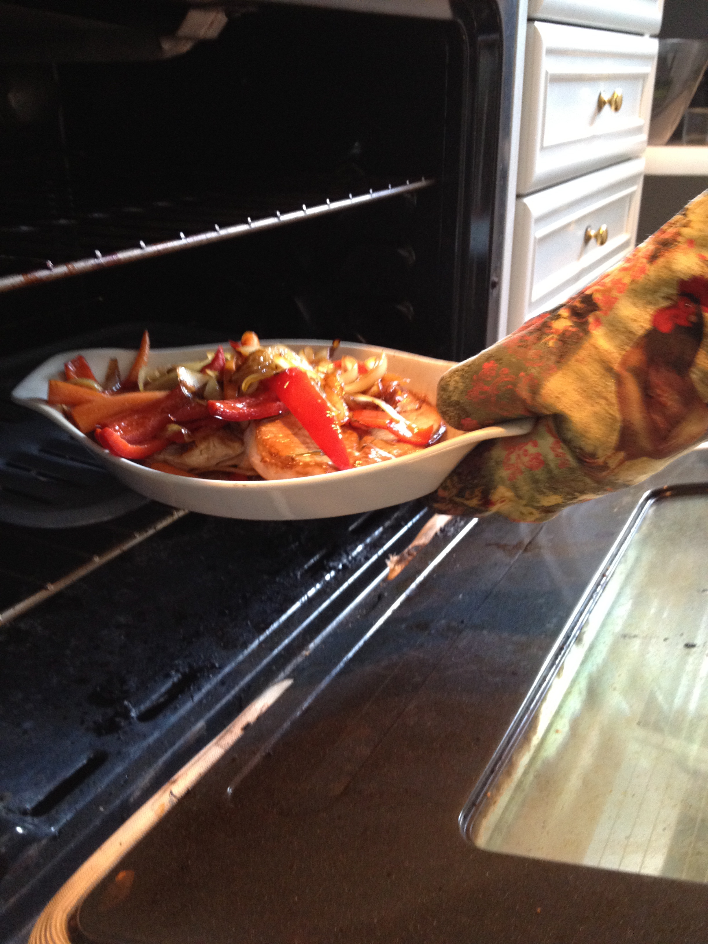 Put the loins in the bottom of the baking dish that you had put the vegetables in. Place the vegetables on top of the loins, and roast for about 20 minutes, until the loins are cooked through. Make sure not to overcook them as that will dry them out and they will be very tough.