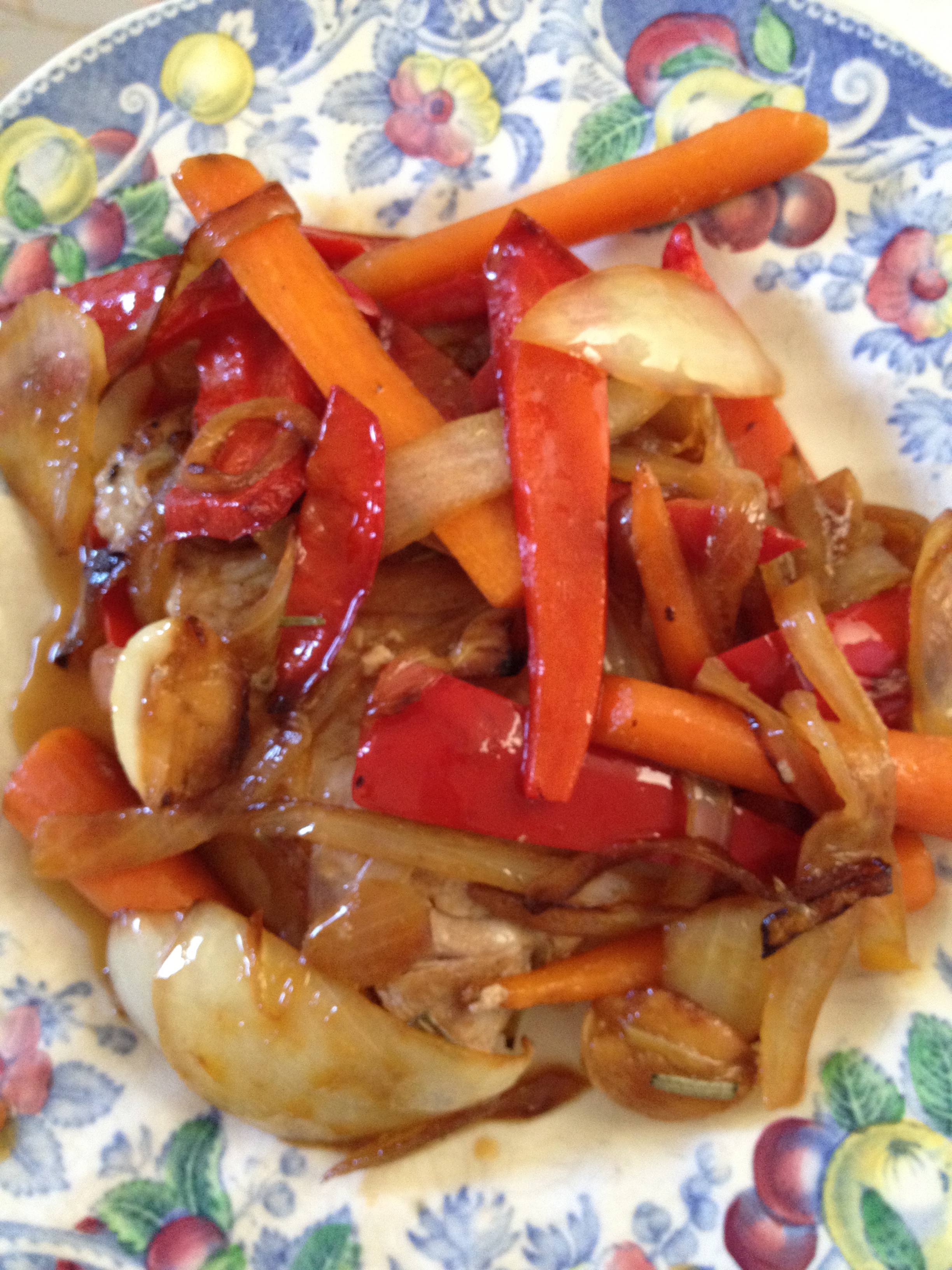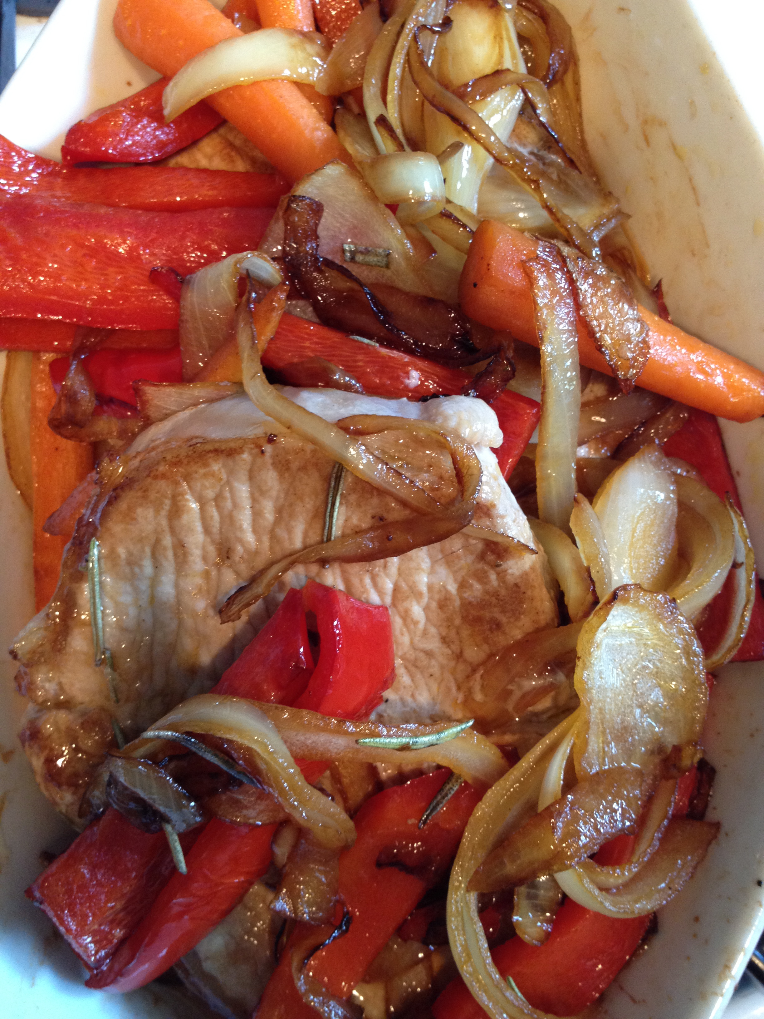 Ingredients (for 4 small servings): 1 yellow onion, a couple large carrots sliced in half and then lengthwise, 1 or 2 red or yellow bell peppers cut into strips, 2 pork loins (tenderloin or other loin), olive oil, a dash of fresh rosemary (or a smaller dash of dried rosemary), salt and pepper