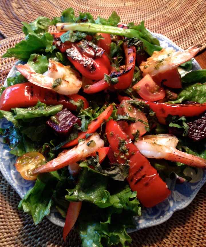 Grilled shrimp, red bell peppers, and eggplant. Accompanied by roasted beets, yellow and red tomatoes, and fresh organic romaine