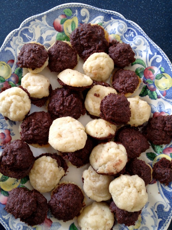 Good in a bad way, since they’re not the healthiest of my baking repertoire. I became madly addicted to a bite-sized version of these during my stay in Santa Monica. The local Whole Foods on Montana Ave always had a well-stocked supply of Brutti e Buoni, and I rationalized that because they were the size of 3 Hershey kisses, a couple a day wouldn’t kill me. I did notice, however, that the Whole Foods version did not incorporate almond in the buoni side, a flavor I missed dearly after making a batch pre-Santa Monica with almond extract. Adapted from my Baking Bible Volume I, ‘One Sweet Cookie’ by fellow cookie lover Tracey Zabar (who calls them dreamy ‘Romeo’s Sighs and Juliet’s Kisses),’ these two-sided treats are a slightly less perfect version with slightly less butter, but plenty of goodness all the same.