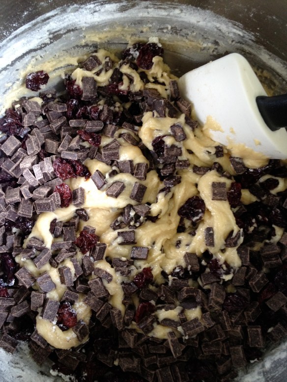 Ingredients: 2 1/4 cup all purpose flour, 2 1/4 cup dark chocolate chunks, 1 stick butter at room temperature, 3/4 cup sunflower oil (or other vegetable oil), 2/3 cup organic light brown sugar, 1/4 cup granulated sugar, 1/4 cup organic sugar, 2 tsp pure vanilla extract, 2 eggs (cracked into a bowl before adding to mixture), 2 tsp baking soda, 1 1/4 cup dried cherries, pinch of salt.