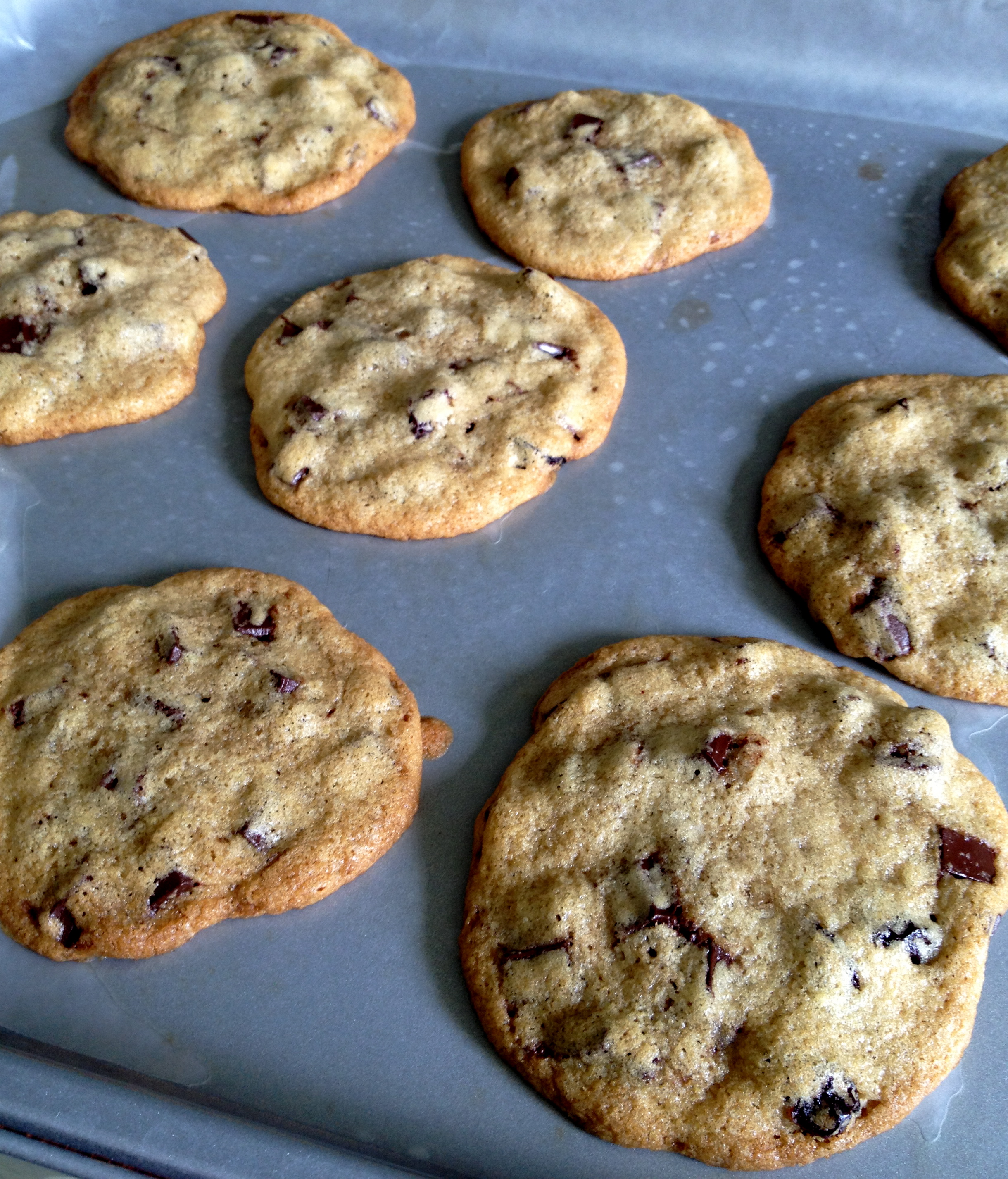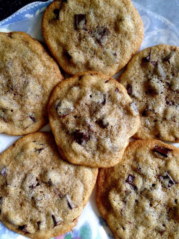 I cleverly replaced one stick of butter (that’s right: one whole stick) with 3/4 cup sunflower oil. The cookies came out crisp, moist, and ironically, buttery. Using more light brown sugar than regular sugar also eliminates calories. I used equal parts organic fair trade sugar and regular granulated sugar, simply because that is what my pantry had on hand. Feel free to use 1/2 cup organic fair trade sugar or 1/2 cup granulate sugar, although I find that the organic sugar offers a less obviously sweet flavor to my baked goods.