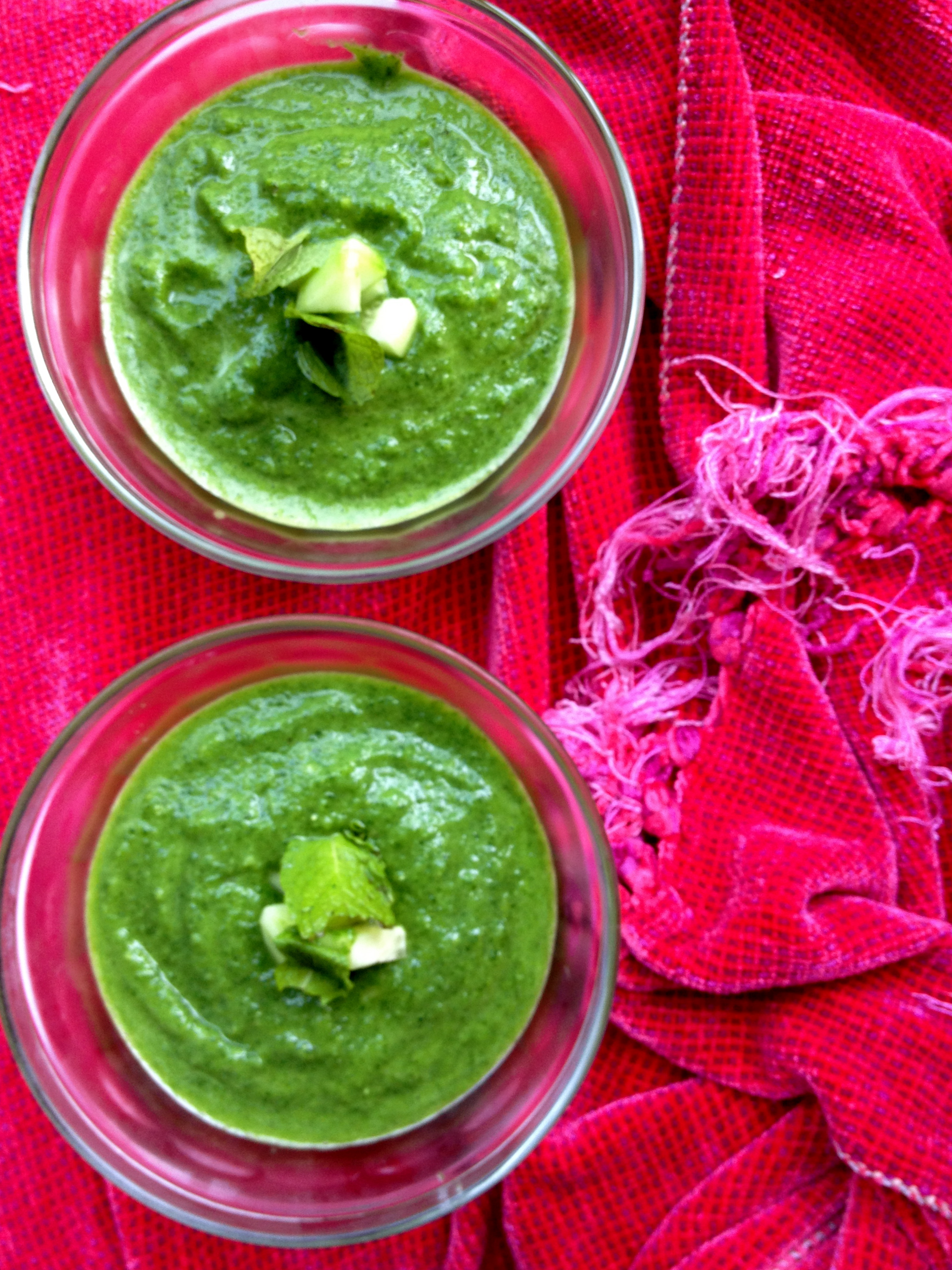 Recipe: Puree cucumber, asparagus, spinach, mint, basil, and 1/2 cup water in a blender until smooth. Add avocado, lemon juice, and 1/2 cup water. Blend until smooth, adding remaining water periodically and as needed. Add white pepper and salt, give a final blend, and chill for 1 hour before serving.