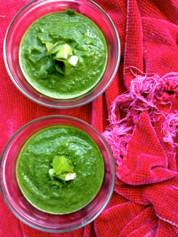 Ingredients: 1 bunch asparagus stalks trimmed and cut into thirds, 1 ripe avocado, 4 cups spinach leaves, 1/2 large cucumber peeled and diced, 2 cups cold water, 1/3 cup mint leaves, 1/4 cup basil leaves, 1 tablespoon white pepper, pinch of salt, juice of 1/2 lemon.