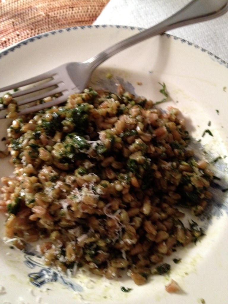 Ingredients: 8 cups low sodium organic chicken broth, 2.5 cups farro, 2 cups flat leaf parsley,1/4 cup basil, 2 tbsp fresh thyme, 2 garlic cloves, 1/3 cup olive oil, 3/4 tsp salt, 1/2 tsp pepper, grated Parmigiano Reggiano