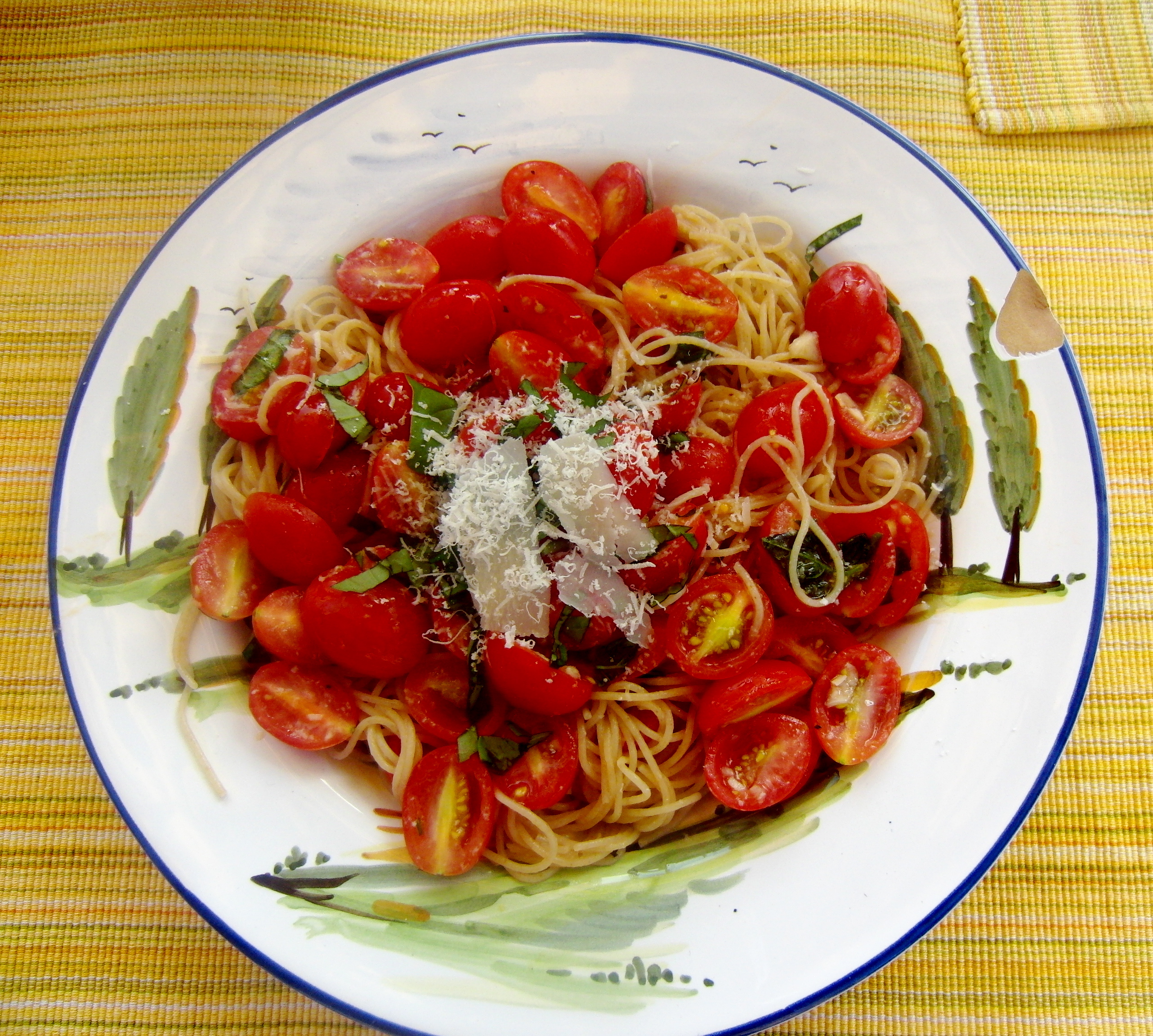 Cook the pasta according to the directions. I like my pasta al dente. Skim about a cup of the foamy white pasta water off of the top. This has a great deal of starch in it and you will want to add it to the pasta at the end to give it more moisture and body. Drain the pasta without shaking all of the water out, thus leaving the pasta too dry. Dump the pasta into the bowl with the tomatoes and quickly stir it in before the pasta sticks to itself. Add the pasta water by the spoonful if necessary as well as extra olive oil. Now comes the Parmigiano Reggiano. Mix it in batches, coating the pasta and the tomatoes. Serve with extra grated Parmigiano and a few extra basil sprinklings on top.
