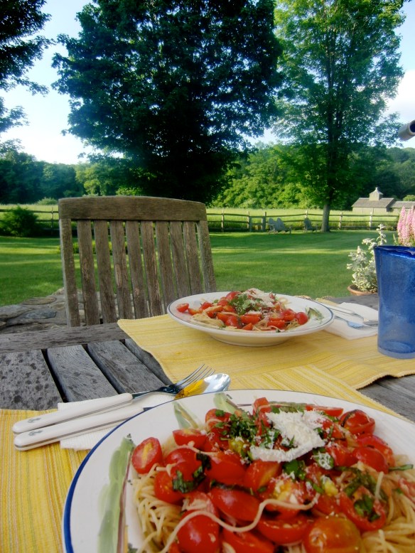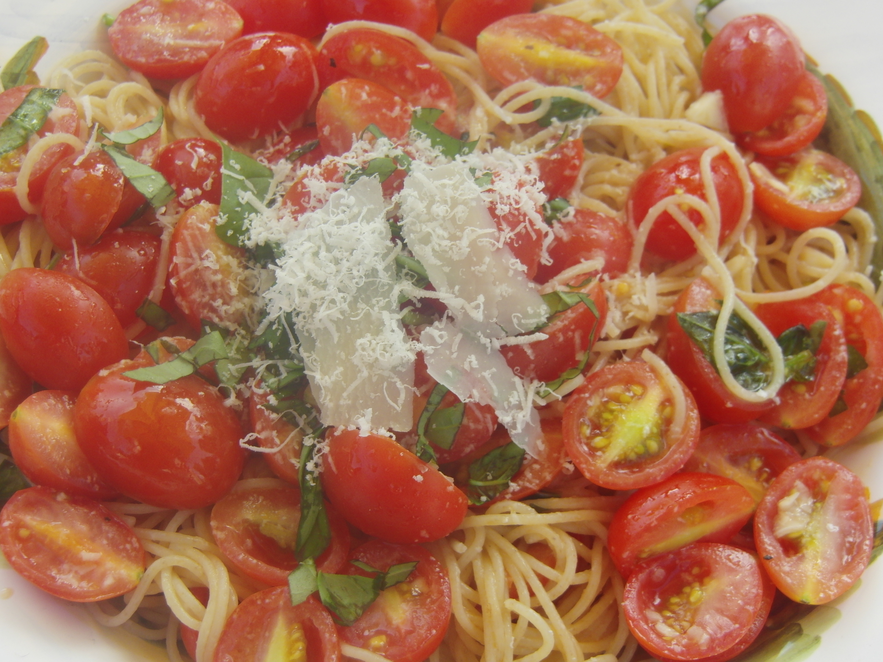Whole wheat cappellini, 2 pints organic cherry tomatoes, 1 cup fresh basil leaves from the garden, 1 head of garlic, 1/4 cup olive oil, plus more at the end, 1 cup grated parmigiano reggiano, salt, and pepper.
