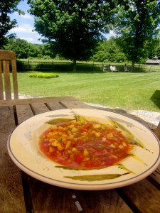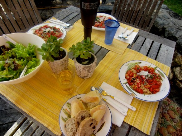 Summer garden pasta with fresh lettuce from the farmstand and Howard’s Bread: a renowned and heavenly treat found only in the Lyme, Connecticut area.