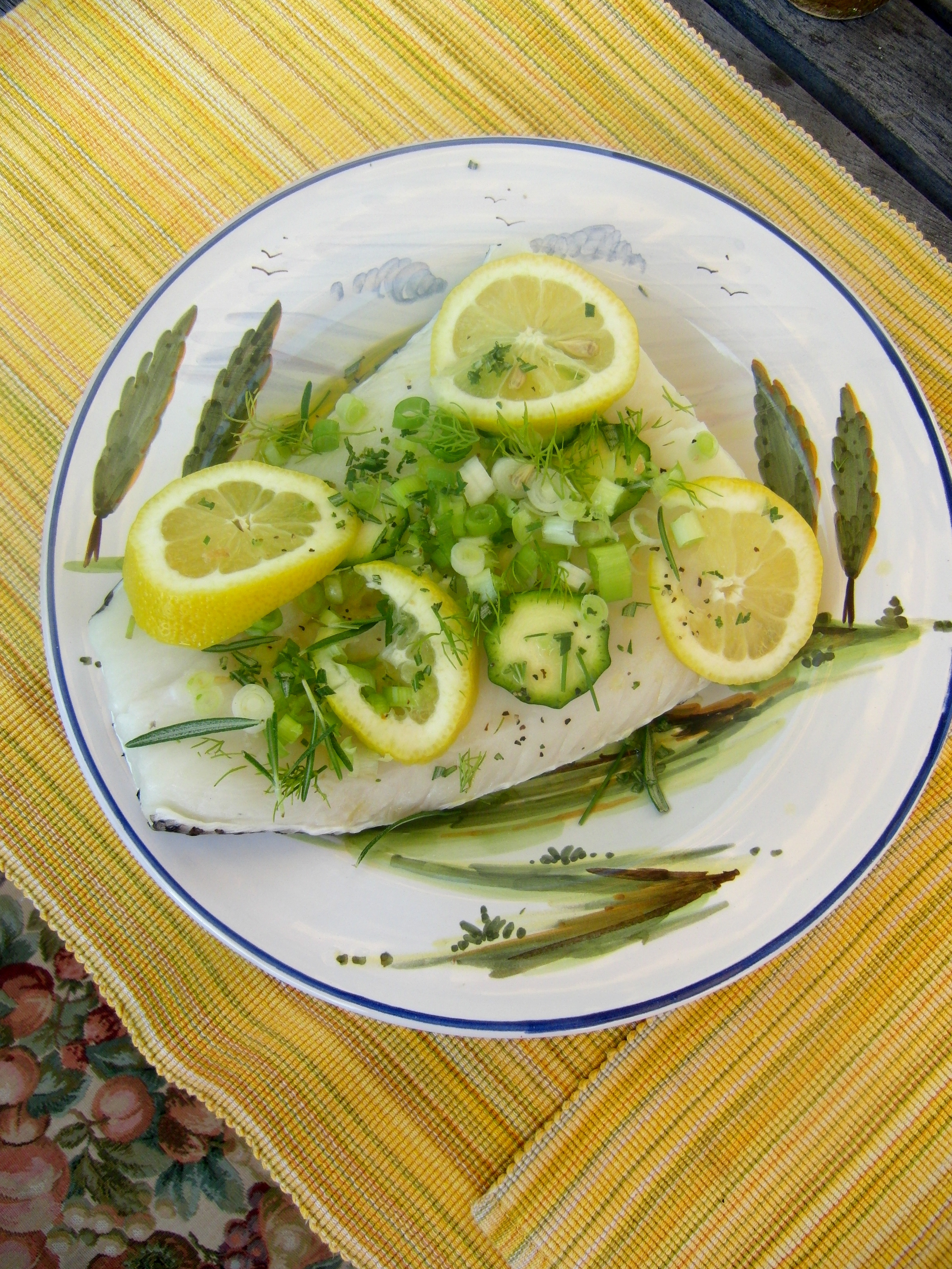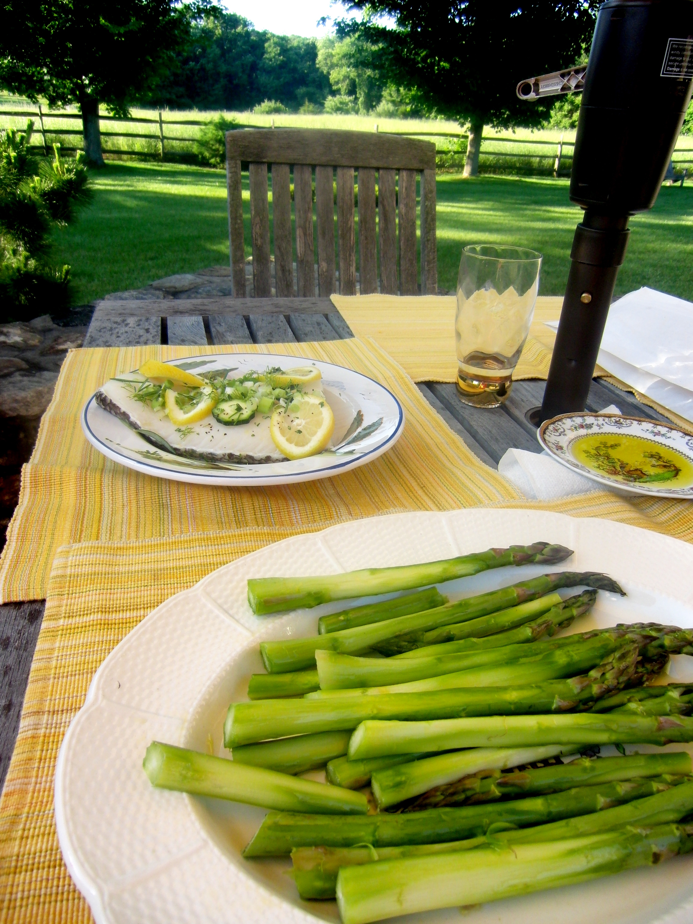 Pre-grill: trimmed asparagus drizzled with extra virgin olive oil. Branzino prepared with a sprinkling of fresh herbs from the garden, chopped scallions, lemon slices, olive oil, salt, and pepper