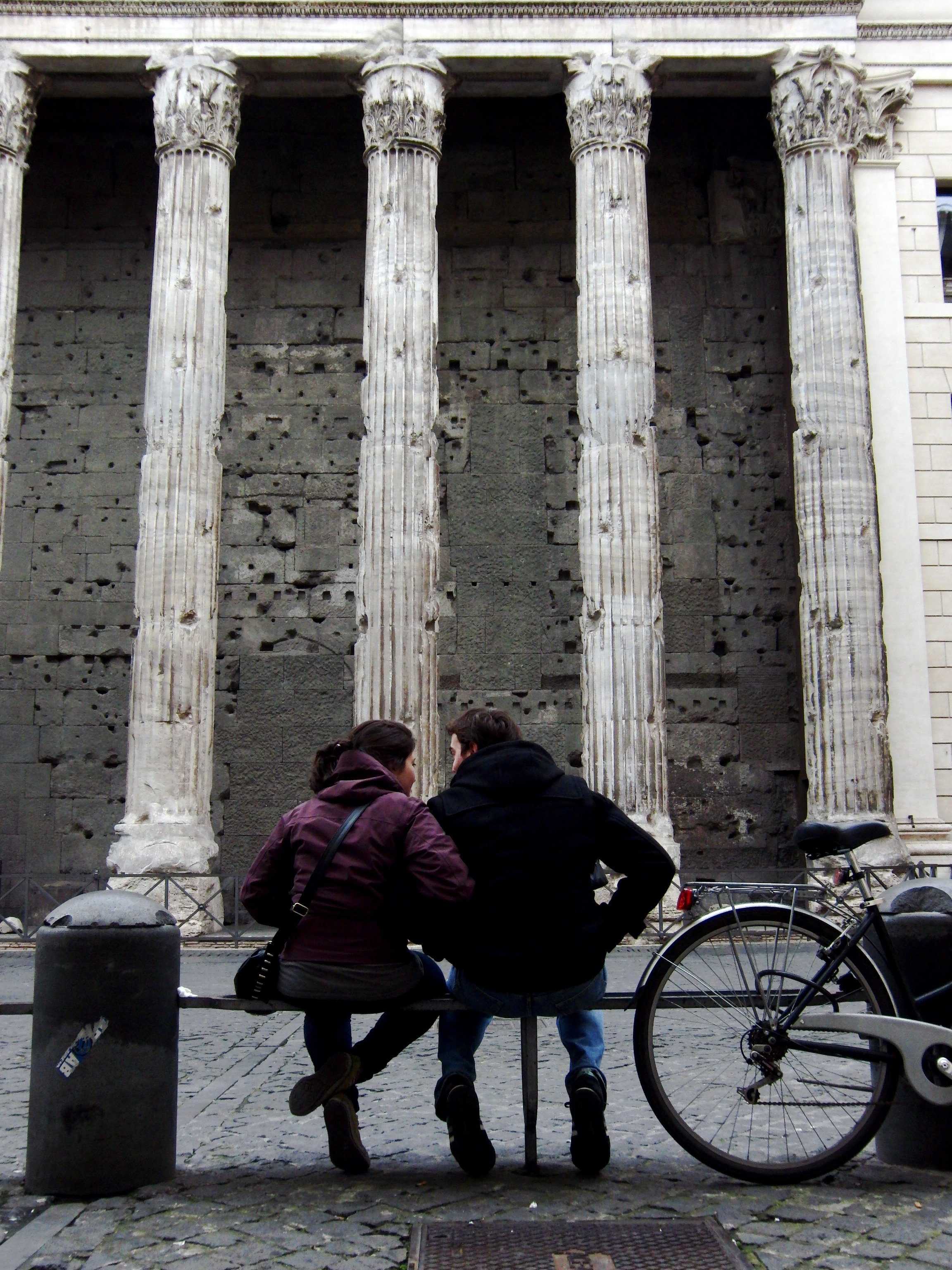 A casual bicycle stop for a young couple who enjoy a bit of conversazione in front of an ancient Roman building, most likely not even noticing the colossal history before their eyes as Romans are so used to their everyday surroundings.