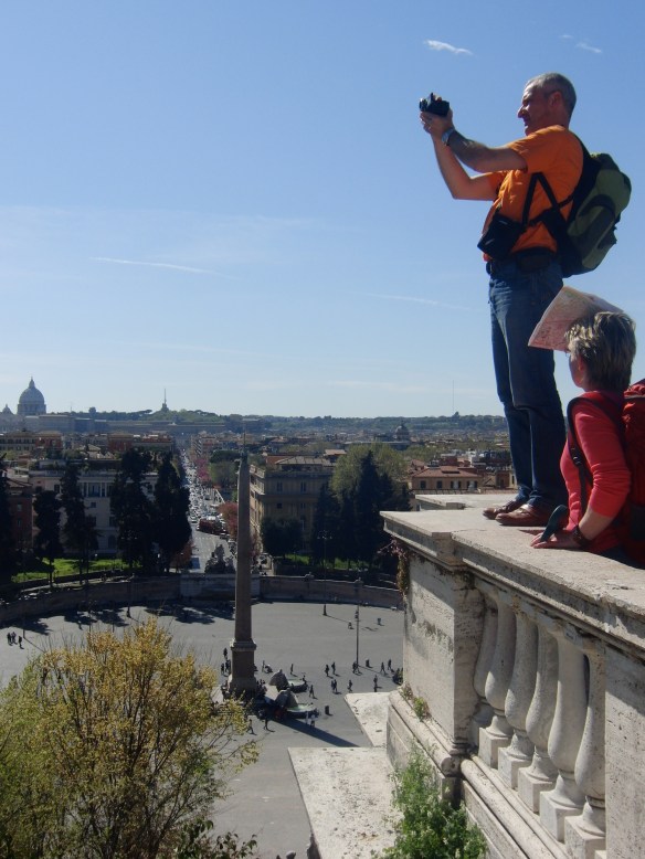 A tourist risks his life to take a photo from atop the terrace of the Borghese Gardens, overlooking Piazza del Popolo below.