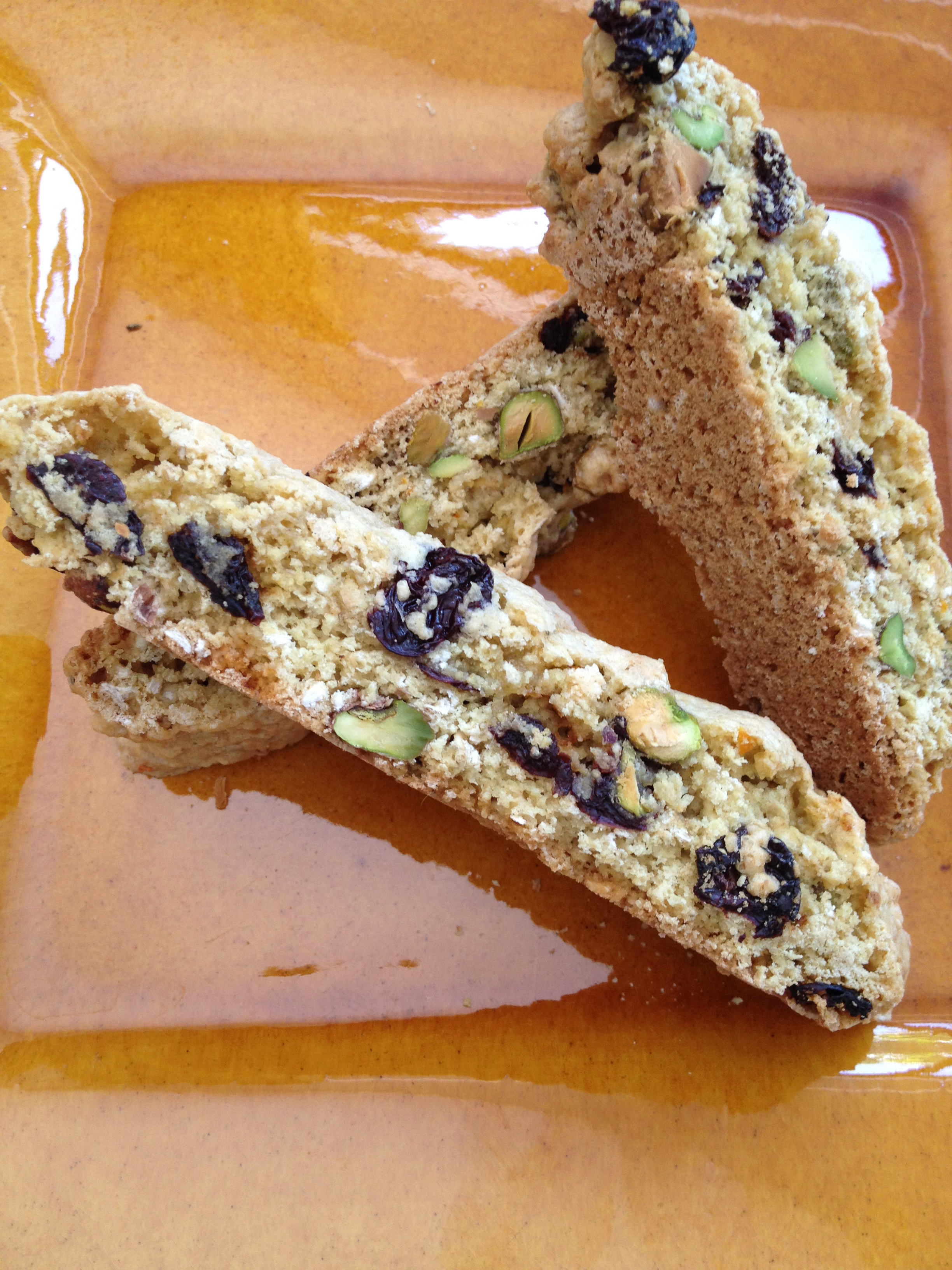Ingredients (Makes about 2 dozen biscotti): 2 cups unbleached all-purpose flour, a scant 1 cup organic sugar, 1/2 cup old-fashioned slow-cooking oats, 2 large eggs, 3 tbsp grape seed oil (or other vegetable oil), zest from 3/4 of an orange finely diced, 1.5 tsp pure vanilla extract, 1/2 tsp almond extract, 1 tsp baking powder, 1/2 tsp baking soda, a scant 1/2 tsp kosher salt, 1 cup dried cherries, 1 cup shelled unsalted pistachios