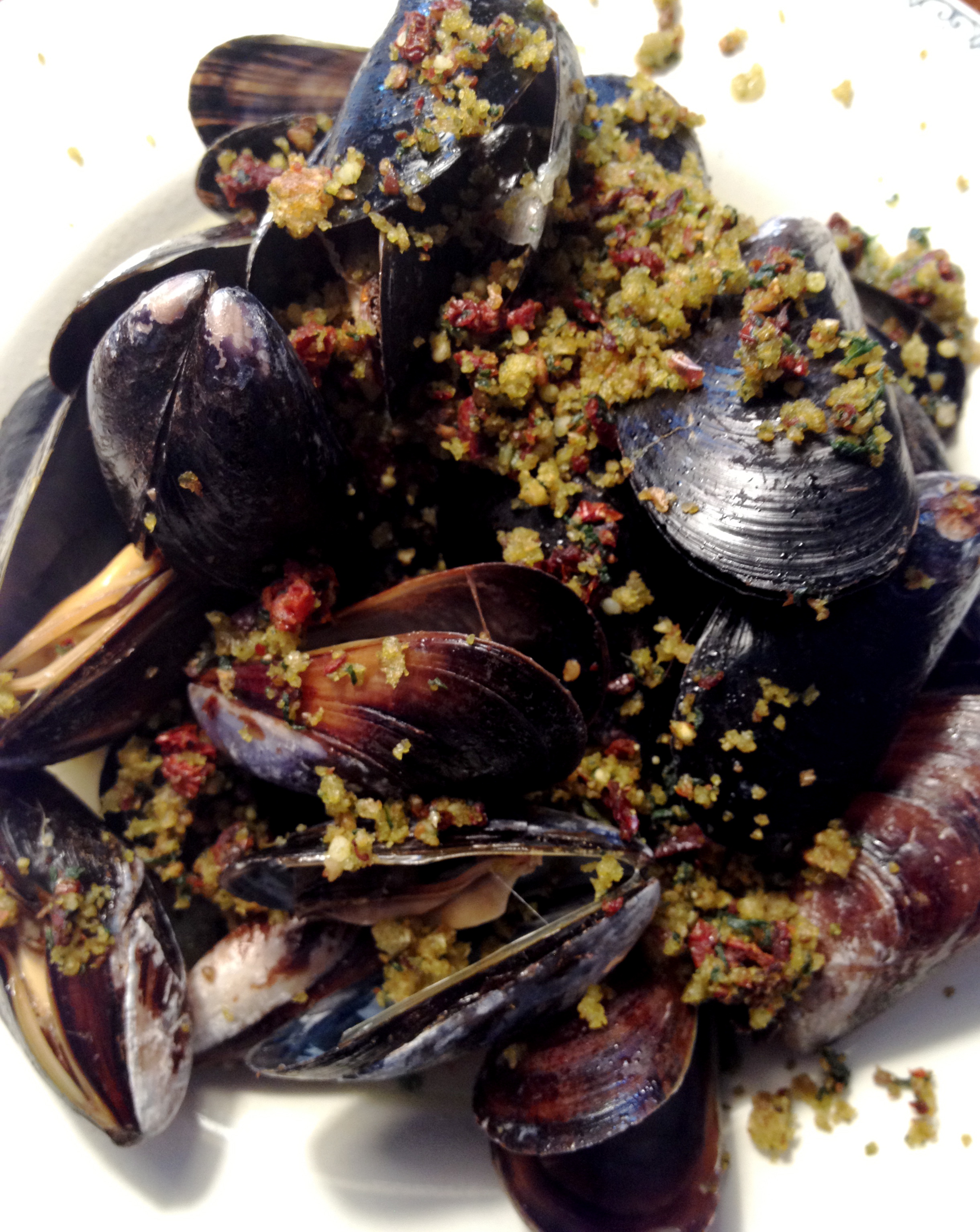 Mussels mixed with a basil bread crumb mixture: toasted bread crumbs, fresh basil, sun dried tomatoes, garlic, and the best quality extra virgin olive oil available. Buon ‘appetito.