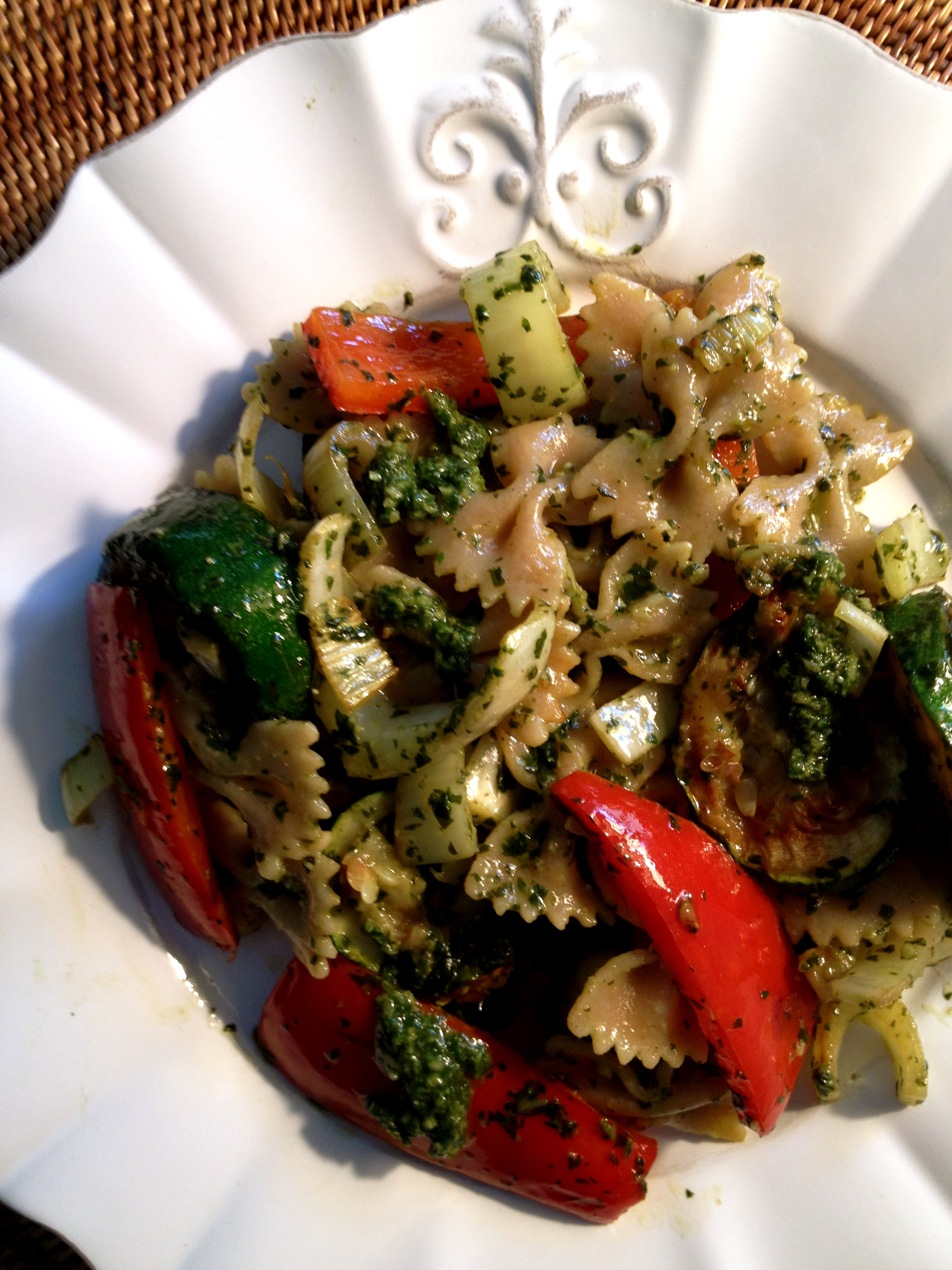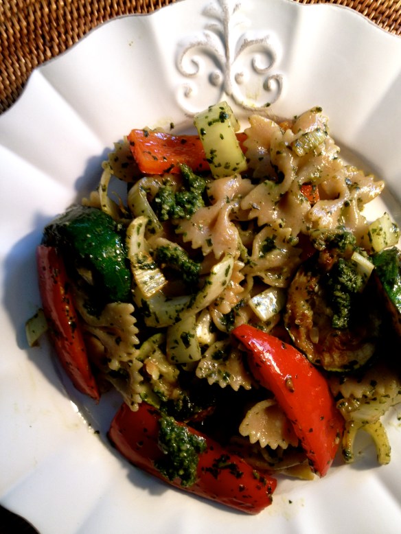 Ingredients (For about 3 good-sized servings): One pesto recipe, 8 oz whole wheat bow tie pasta, 2 large red bell peppers, 1 large zucchini, 1 small fennel bulb