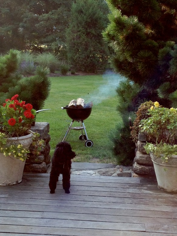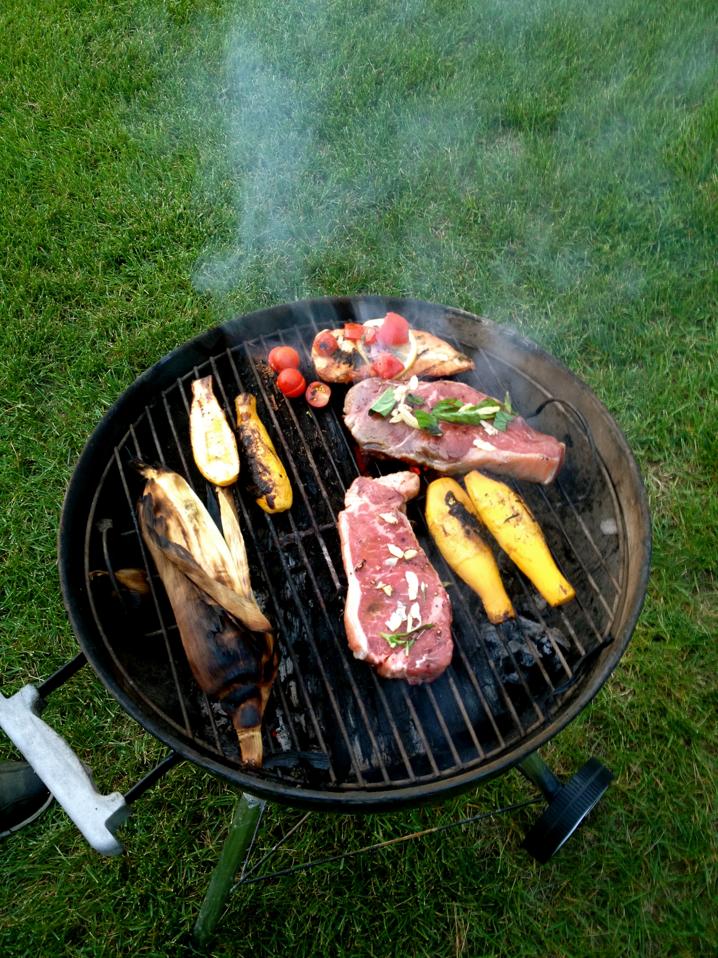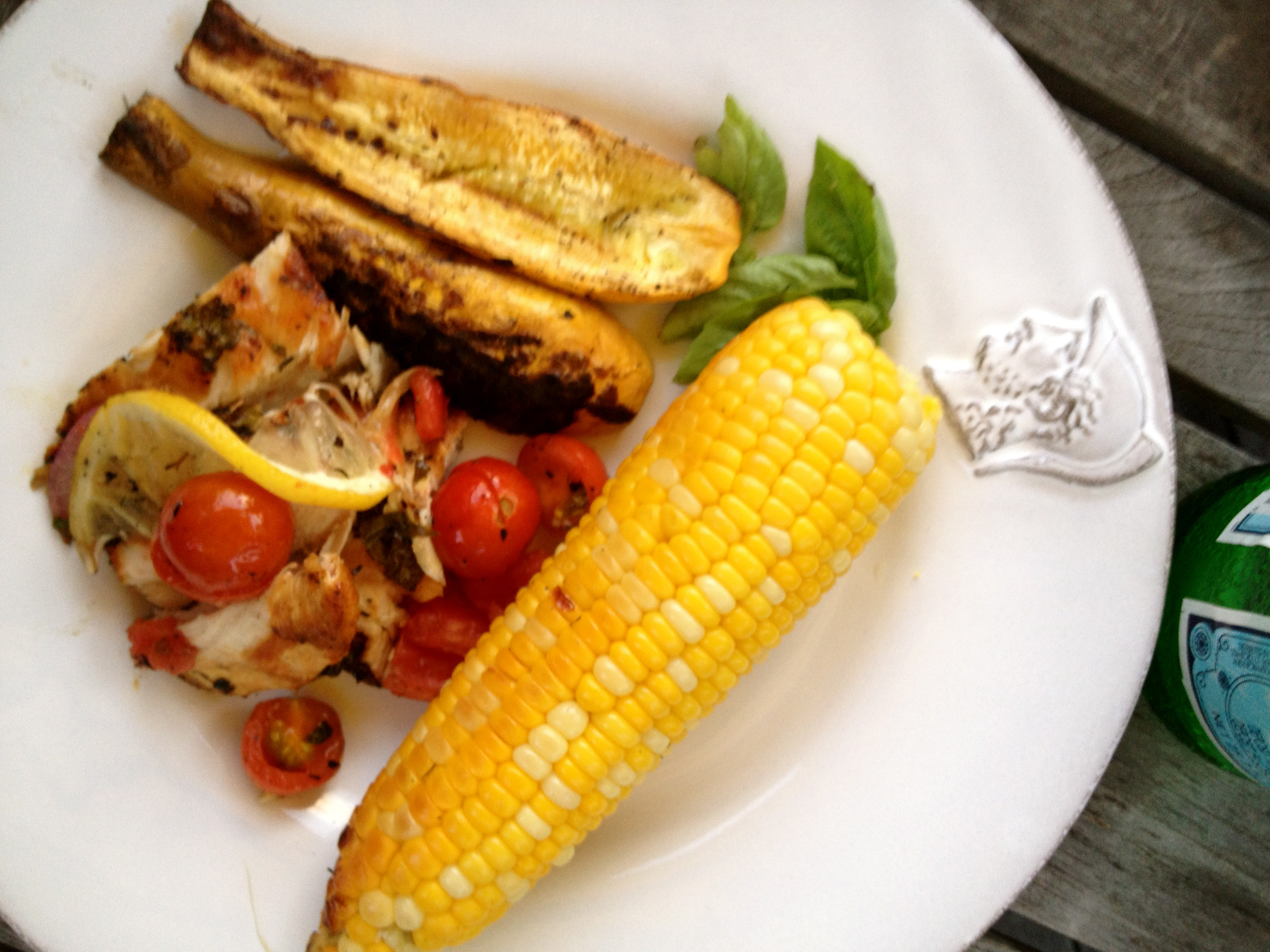 The countdown is officially on when the end of August approaches. I look forward to Fall’s bounty of vegetables and the season’s unique beauty and charm, but parting with those sweet, summer outdoor-grill nights is always such sweet sorrow. After doing simple prep work in the kitchen, I sit out on the deck while the coals heat up, and I let my eyes wander the property, grazing my surroundings just as the horses do in the distance. Maggie the poodle prods back and forth, following on everyone’s heels, eager to be a part of the action (especially the part when the meat travels from the kitchen counter to the grill, to the plate, and quite often, to her mouth). For this simple meal: steak seasoned with fresh herbs, garlic, and ground pepper, a chicken breast seasoned with a dash of olive oil, basil, and cherry tomatoes, corn grilled in the shuck, summer squash drizzled with olive oil, and a beautiful big salad with fresh lettuce from the farm stand and home-grown tomatoes. We finish our plates while listening to the leaves sway and bristle against one another in the summer breeze. As the western sun hesitantly sets behind the barn in the grass fields, the coals are finally just right.