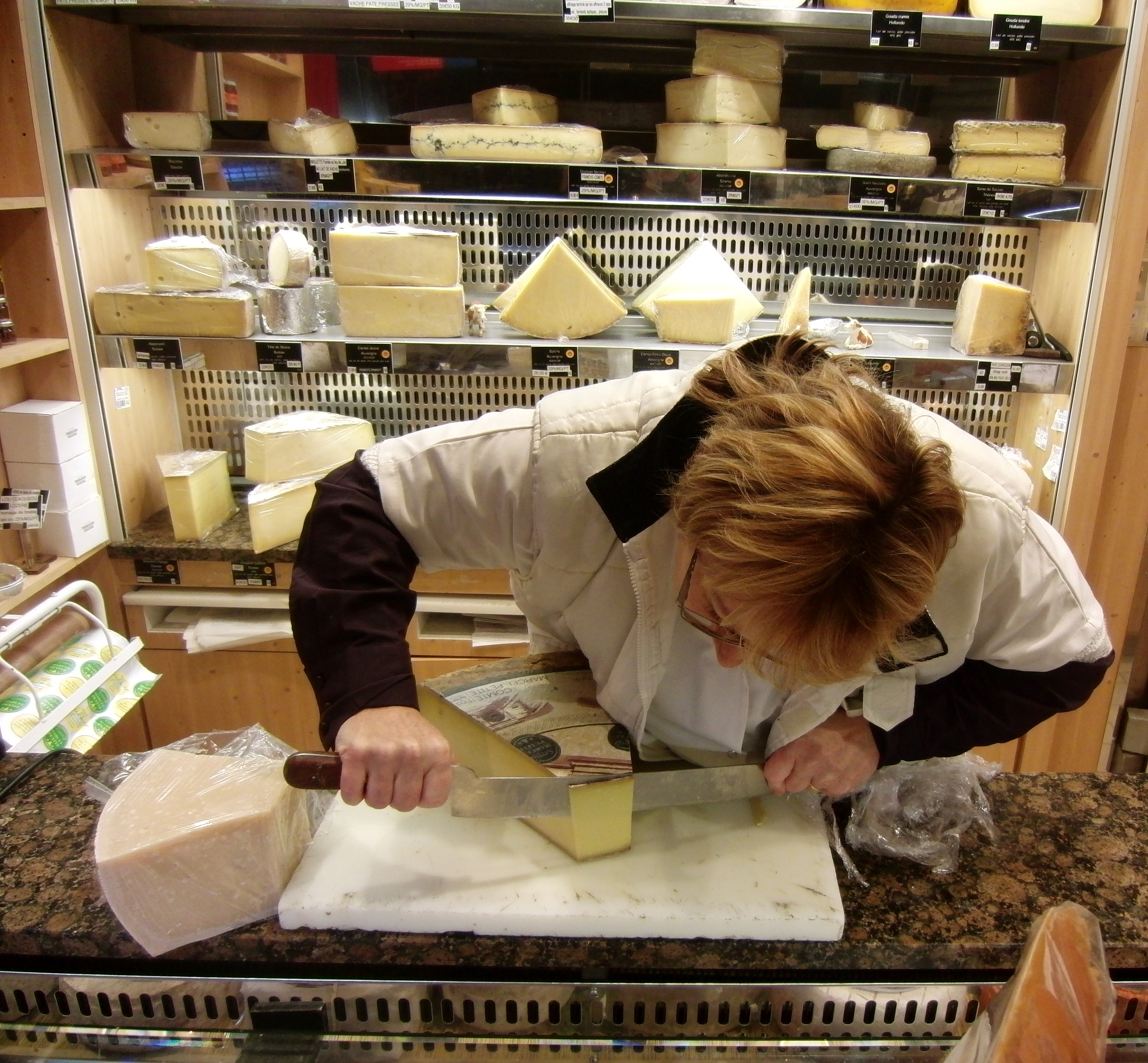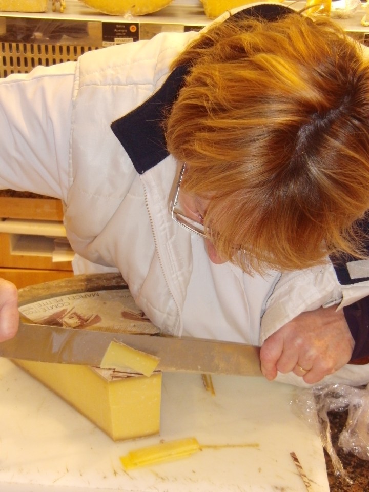 Un femme ever so carefully slicing Comte cheese in Versailles