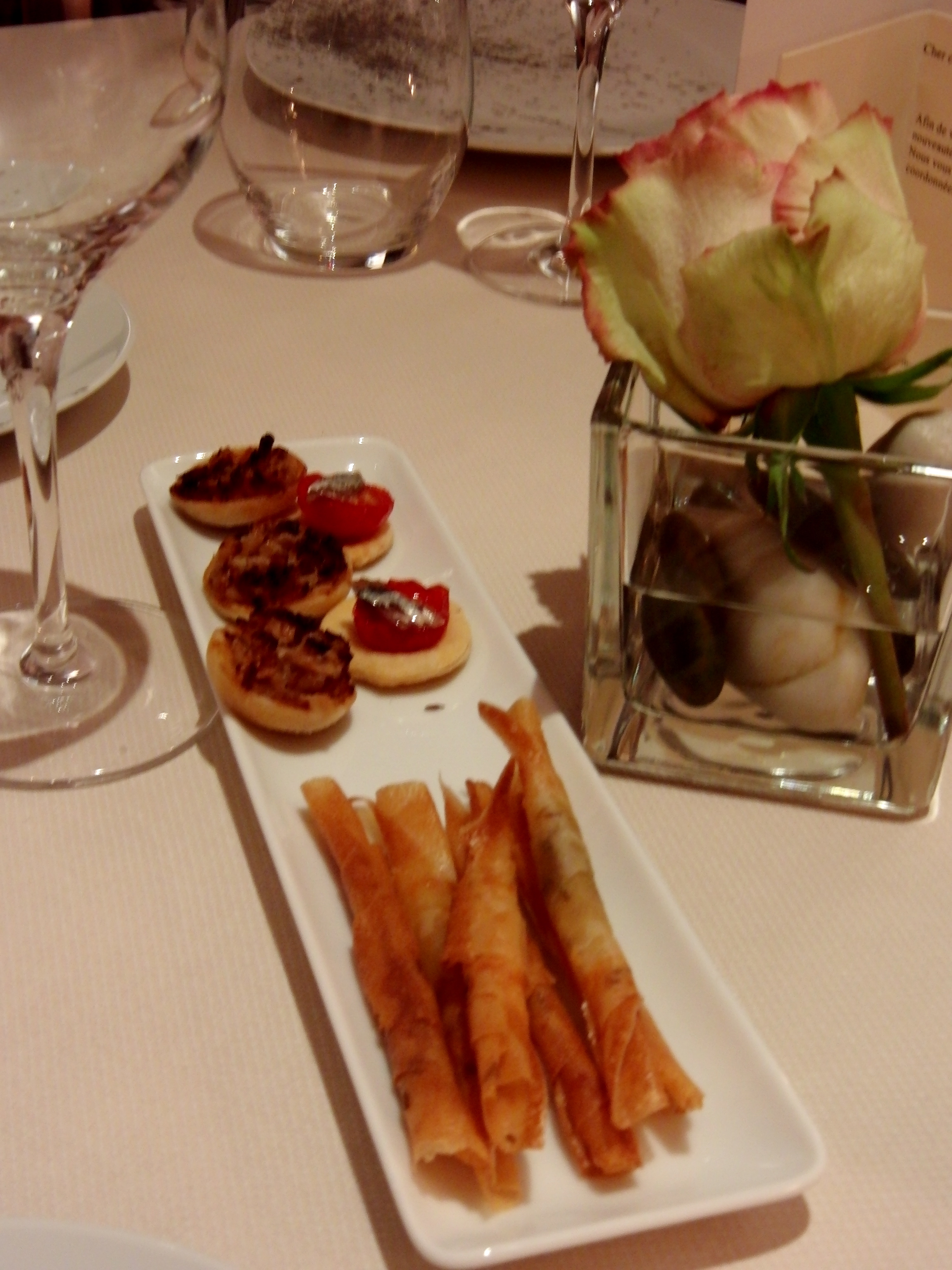 Table setting at L’Escarbille. Note that in addition to these amuse bouche, a fresh bread basket was delivered with each dish.