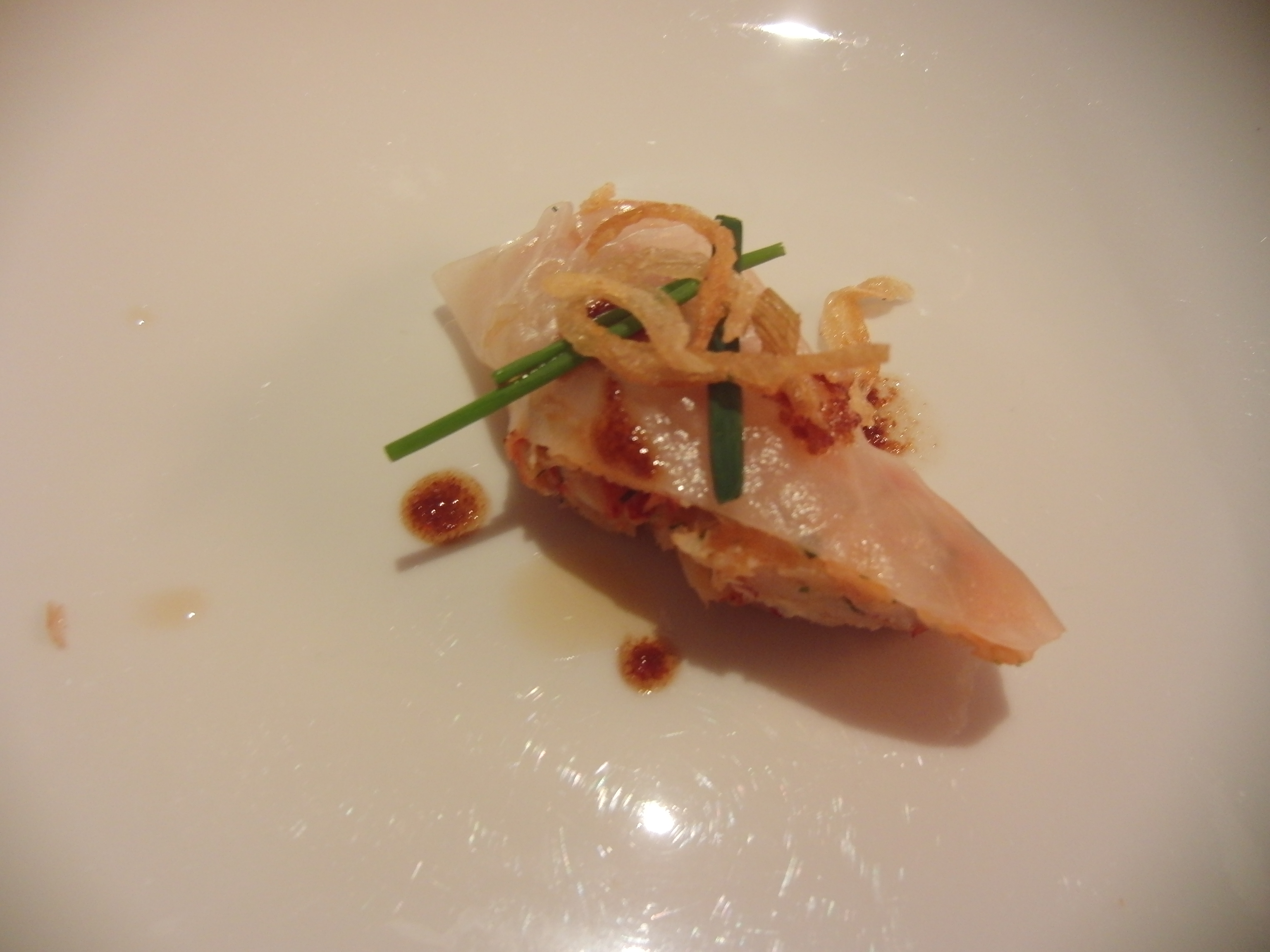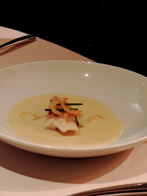 Veloute d’artichauts, raviole de homard, vinaigrette de corail (lobster ravioli before vinaigrette was poured)