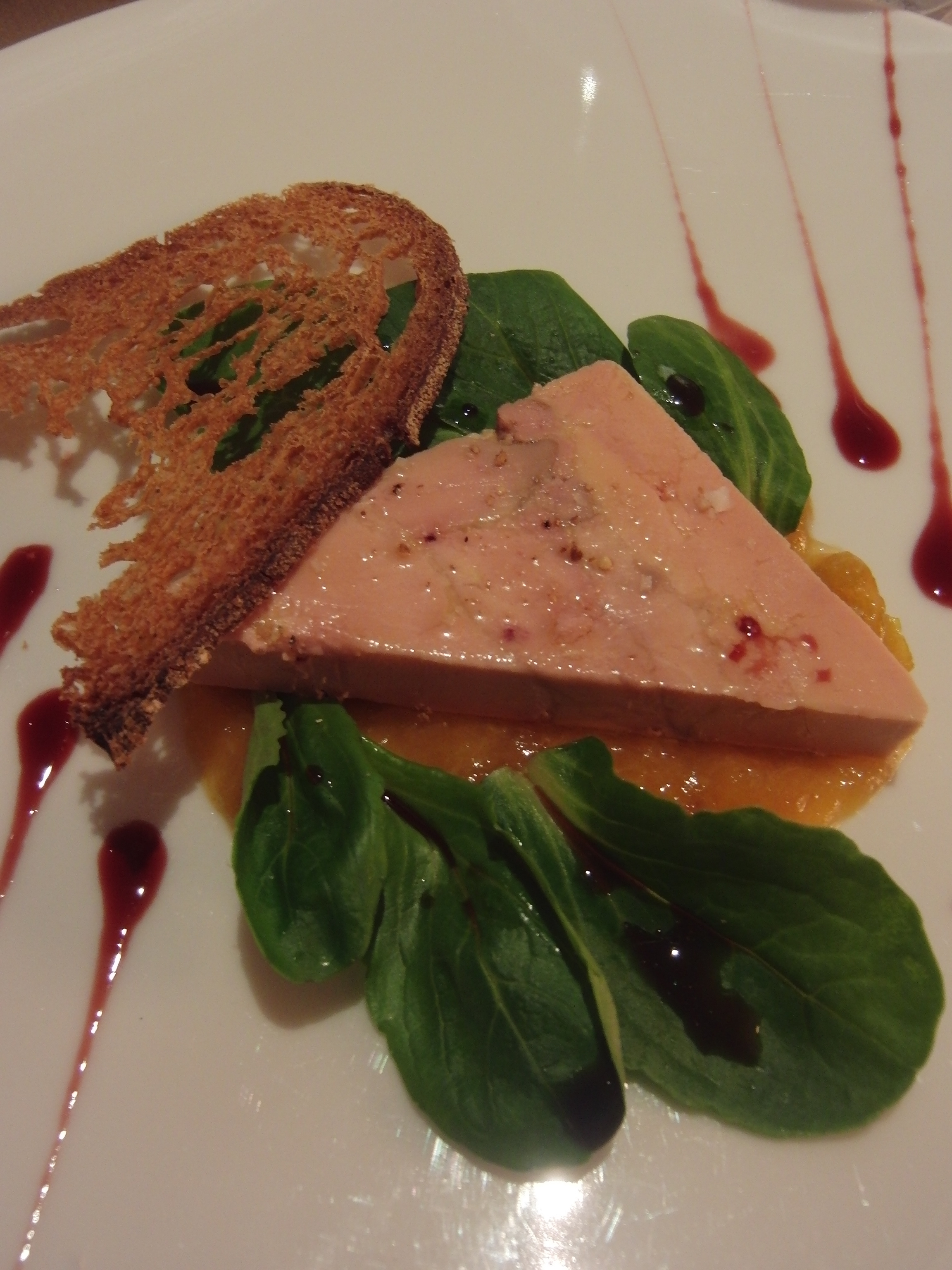 Presse de foi gras fume, confiture acidulee de mirabelles. (foi gras, spinach leaves, and a sweet mirabelle sauce)