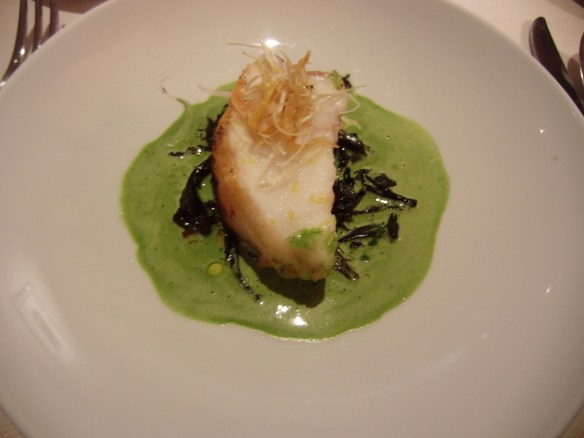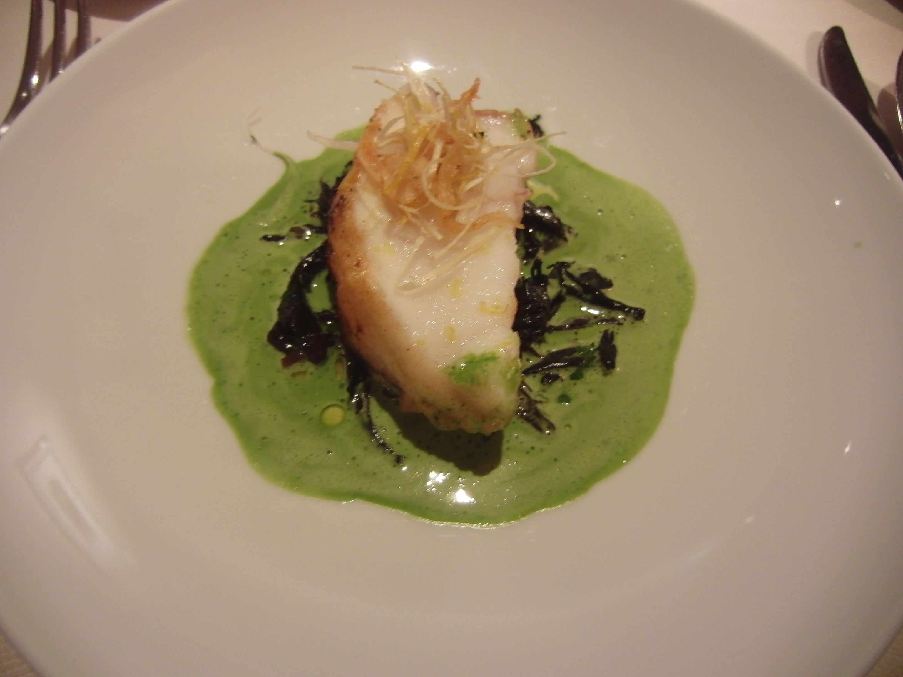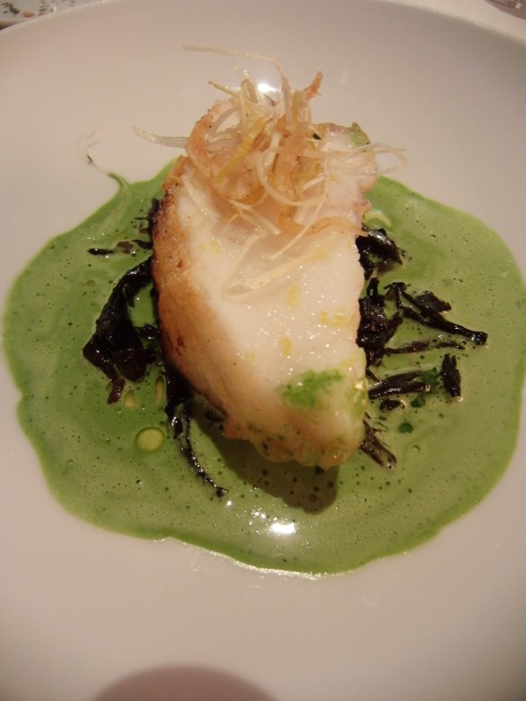 Saint Pierre roti, girolles, cebettes et parfum d’agrumes. The darker green under the fish are the most delicious mushrooms. This plate was my favorite of the evening.
