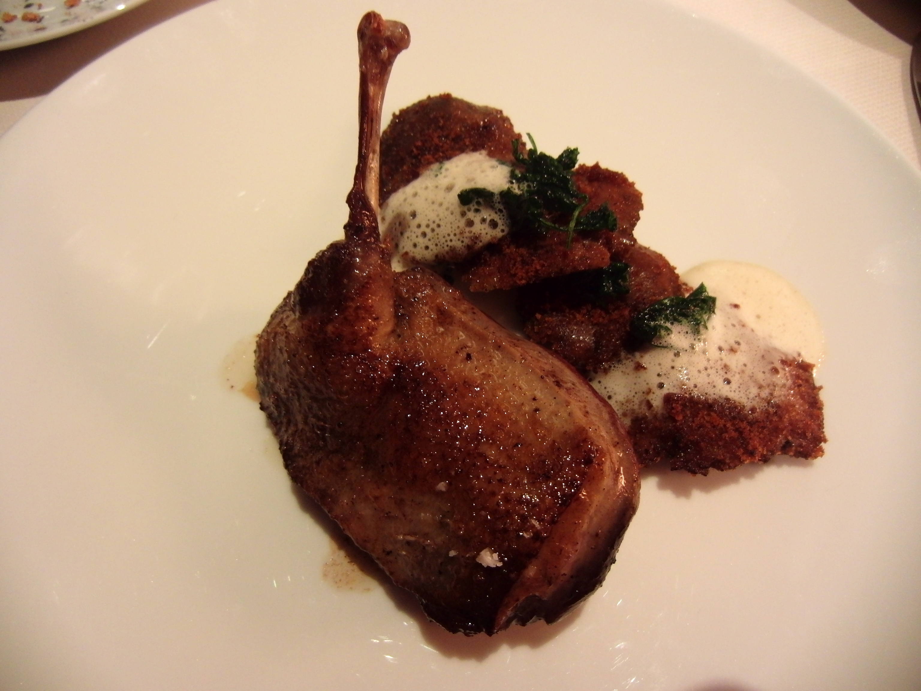 I admit that I was praying for the lamb. Each course was a surprise, however, and I held my composure when a pigeon was placed before me. Corinne, who lives by the expression crème de la crème, was kissing her fingers and in gastronomic heaven as she picked up her carving knife. I found my pigeon to be a little on the rare side, so I tasted the breaded mushrooms and held steady for the next course.