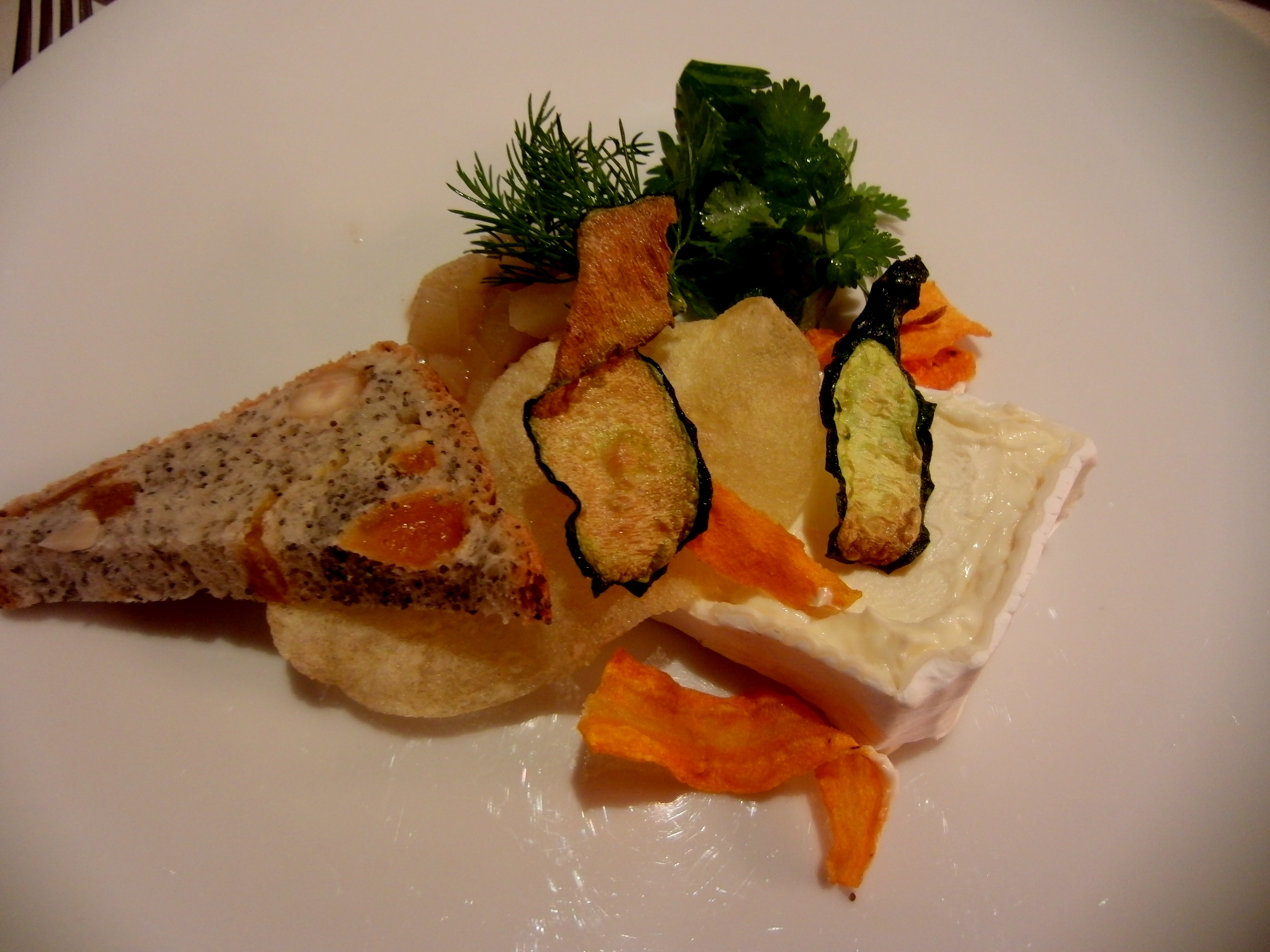 Creamy Brillat-Savarin, served with nuts, dry apricots, poppy seed bread, vegetables chips, and an aromatic herbs salad.