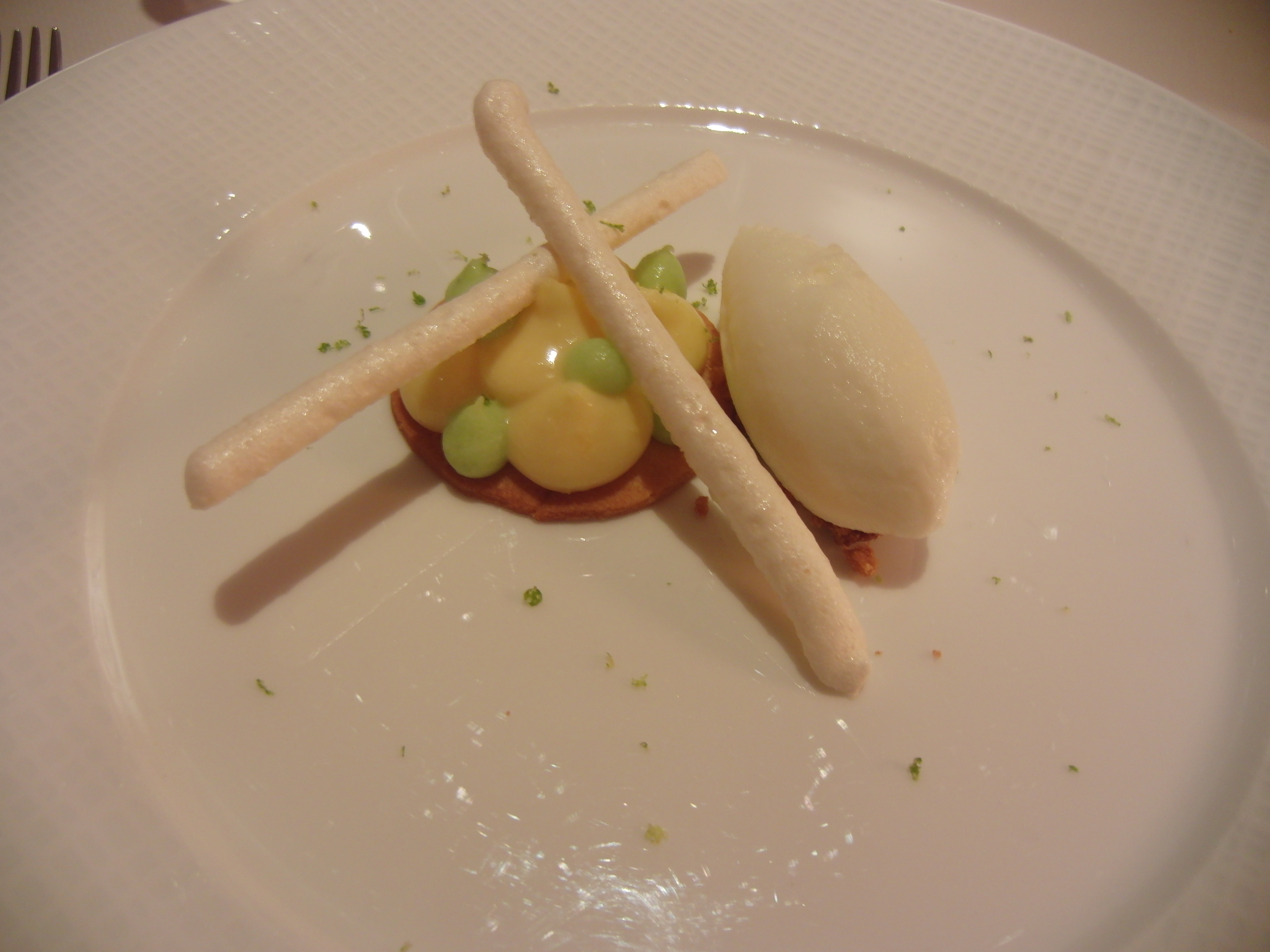 Lemon custard with lime cream balls on a shortcrust biscuit and coconut-flavored meringue sticks. A refreshing lemon sorbet dessert, although I had serious order envy when the Opera arrived at the table next to me (creme glacee au cafe)