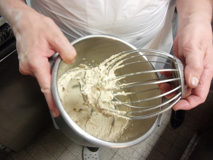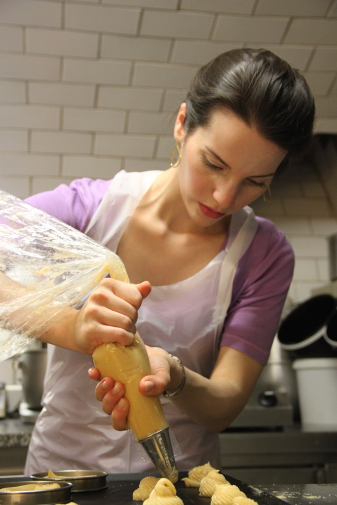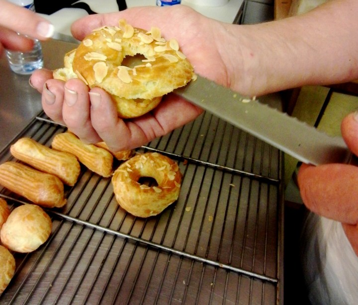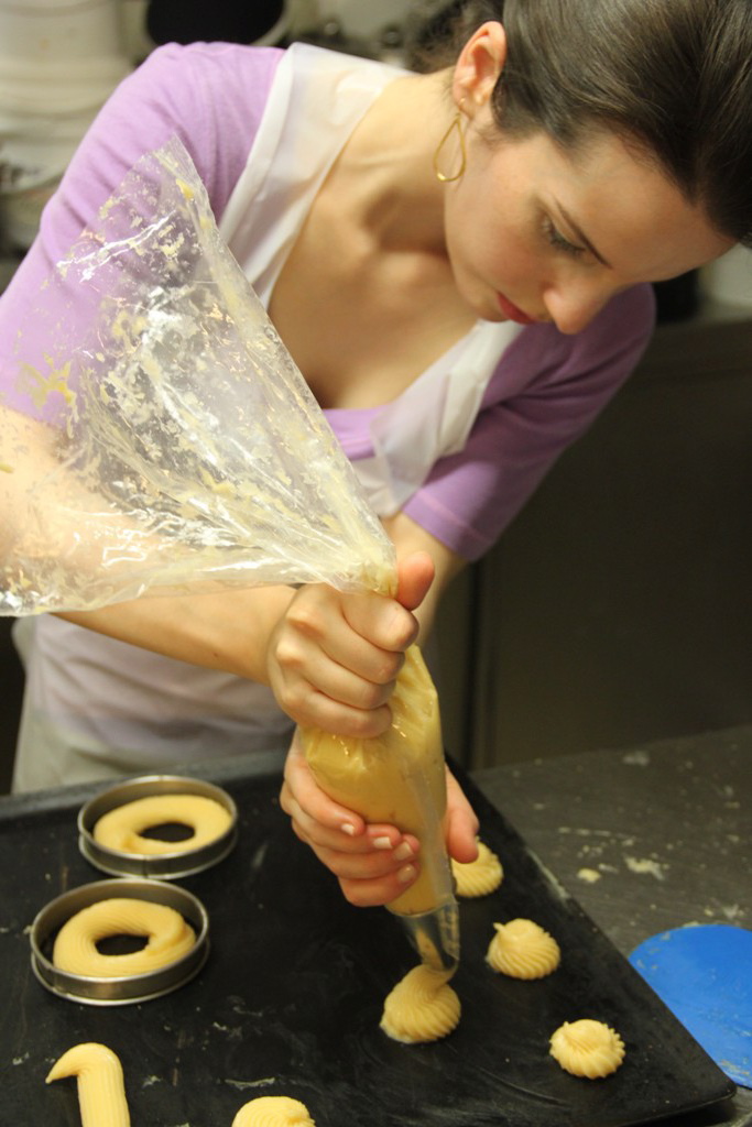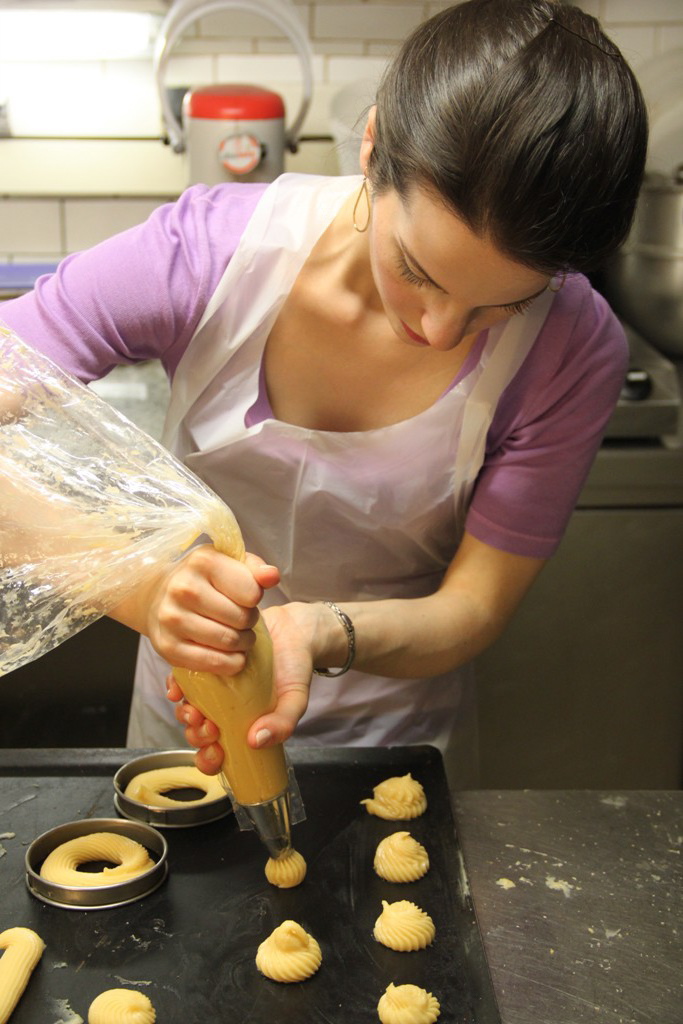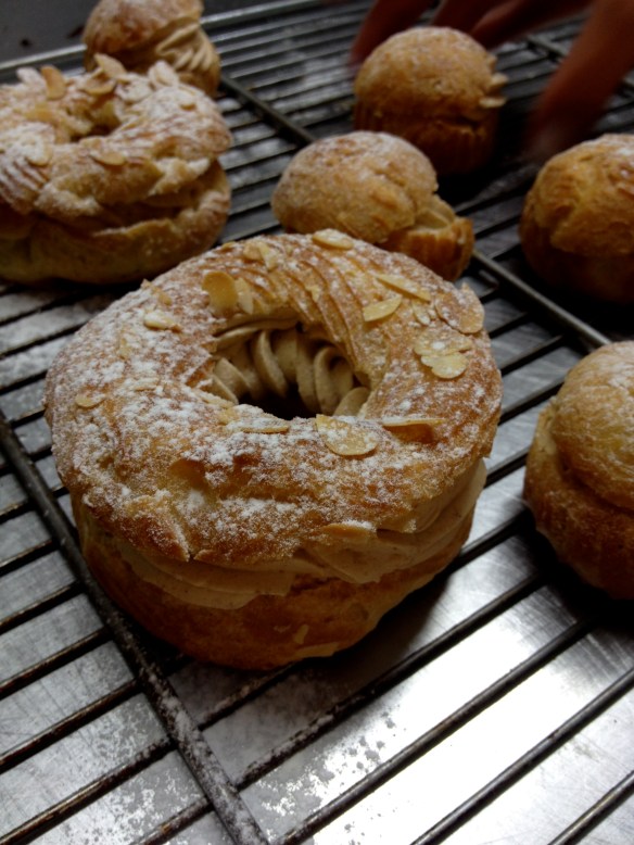 Venture deux in Pastry Chef Patrick’s kitchen at La Grenier a Pain in Sevres, France. On the menu: Paris Brest with pistachio or praline filling. Corinne informed us that this classic French dessert was invented in 1891 to celebrate the Paris-Brest bicycle race, hence it’s circular, wheel-like shape. Even the French bicyclists are chic: they energize with pastry instead of gatorade and Power Bars.