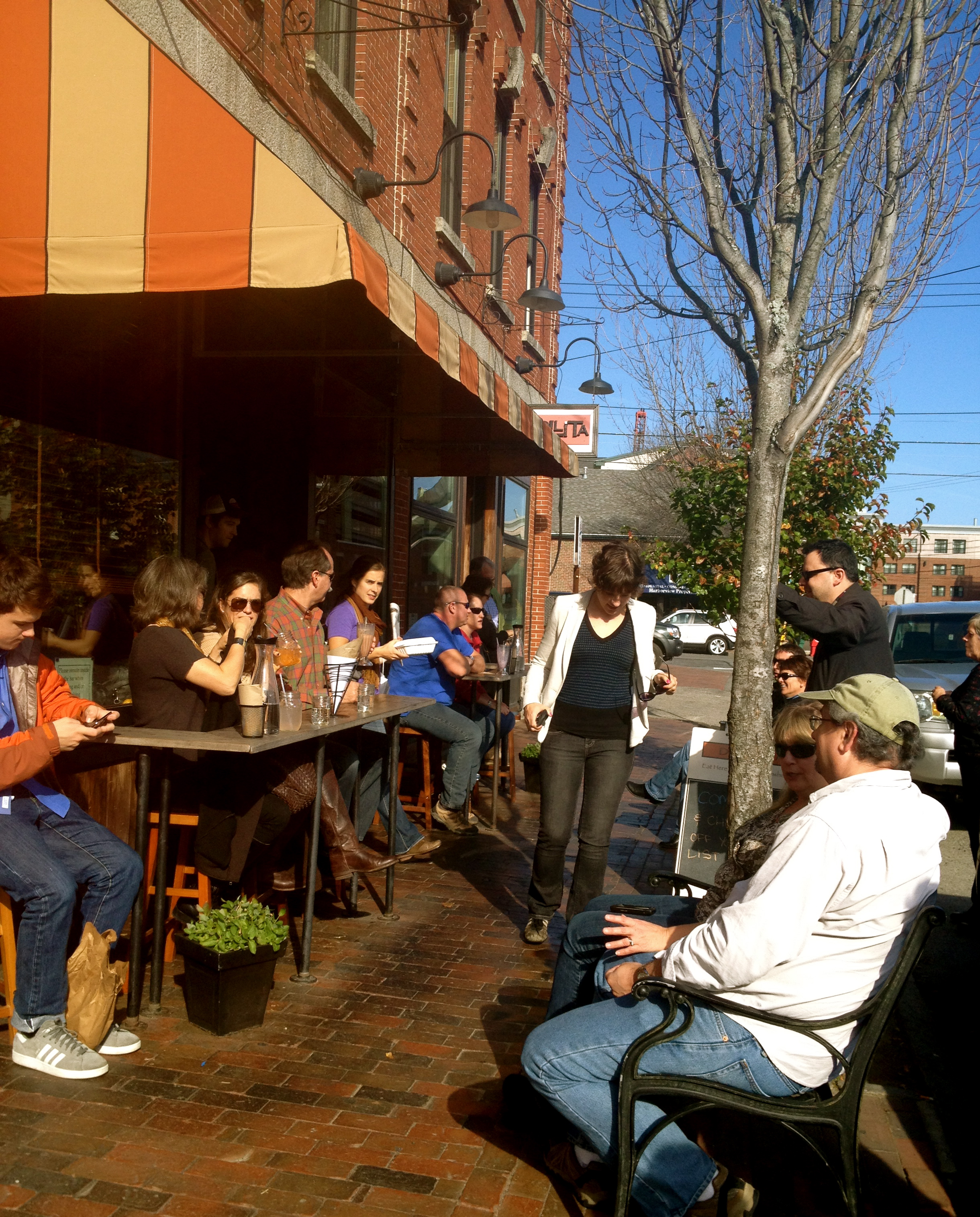 Outdoor seating and fries-eaters in waiting at Duck Fat