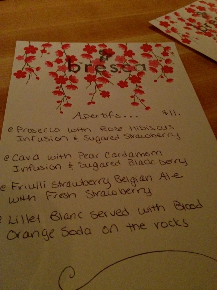 Bresca just in time for our 5:30 reservation. The first seating was already under way, and the 6 table restaurant was as cozy as can be. Someone had a keen eye for romantic lighting, color, and flower arrangements. Jack Johnson and similarly mellow music was playing at just the right decibel, and autumn sunflowers were displayed around the small, narrow room. The noise level never rose above a hospitable, steady hum. Bresca has achieved an intimacy and coziness factor unrivaled by many, many restaurants. The menu was small but no bigger than it should be for a restaurant of its size. The options were clearly a labor of love. It was the perfect setting, mood, and meal for an eerie October night before a big storm.