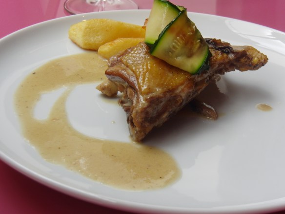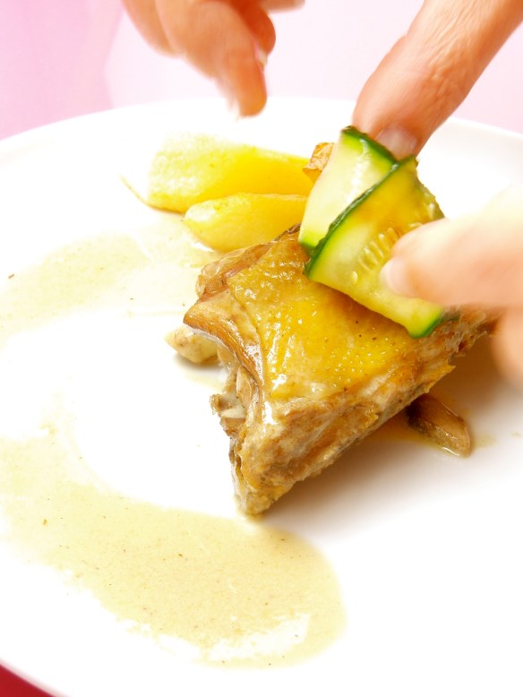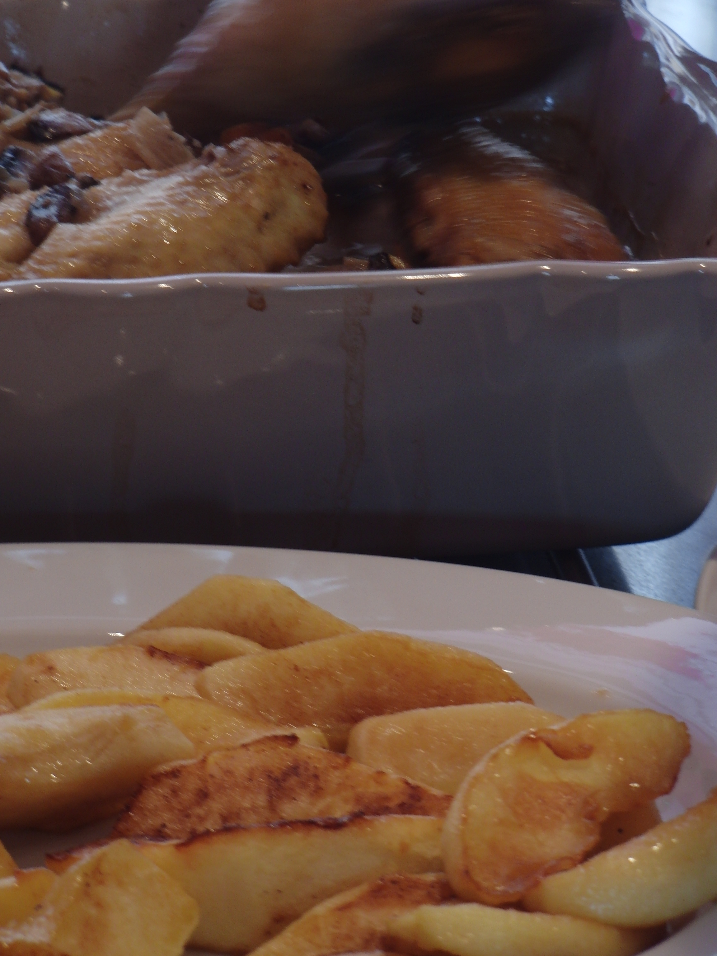 Now that the temperature outside is dropping, I am on the hunt for more warm-blooded recipes; a cozy Sunday afternoon by the fire with a Leo Tolstoy book, or maybe just a Bon Appetit. While I would regard this brandied Normandy style chicken as a weekend meal, it was just another weekday lunch in Paris at Noemie’s cooking school on Rue Nollet. The Parisians nary skimp on any meal, no matter what day of the week. There is always time to sit down amongst friends and family and relish the soft comforting apples, the tender mushrooms, and the delectable brandied sauce that accompany this warm, homely chicken dish.