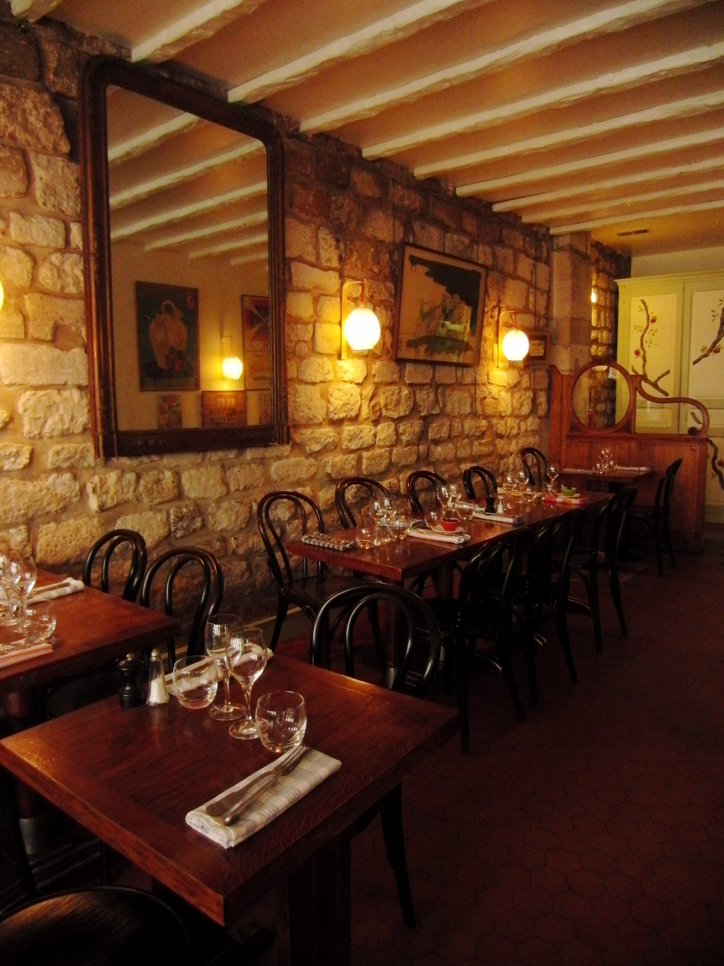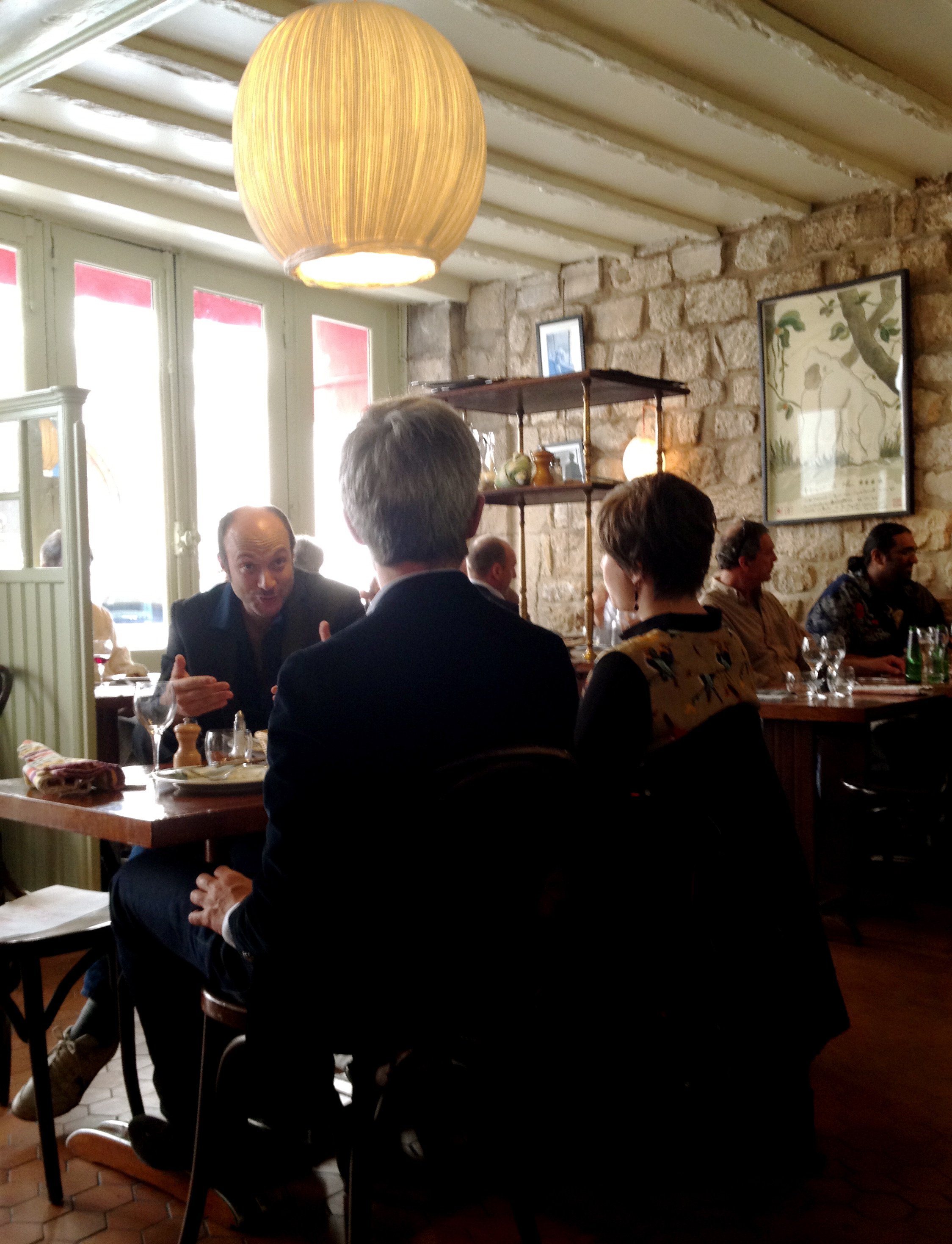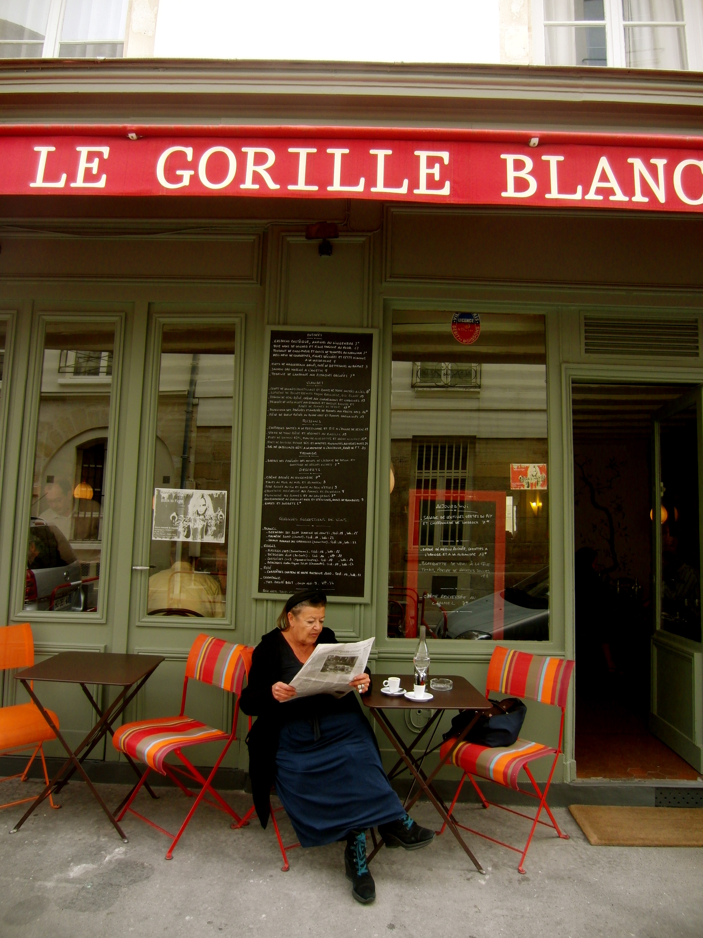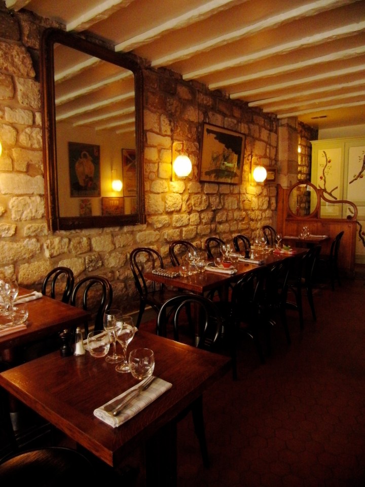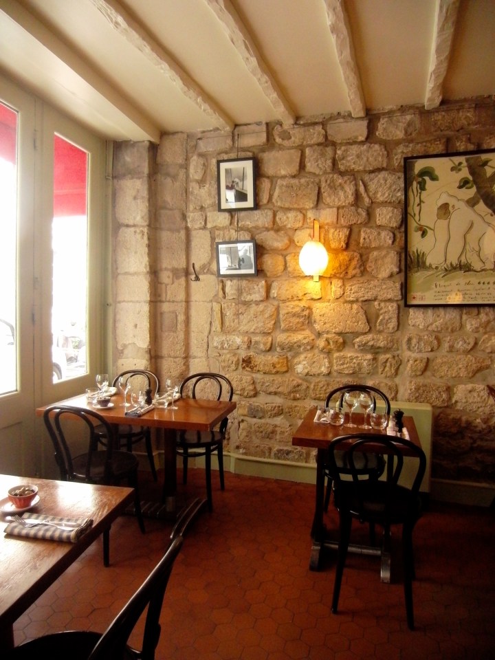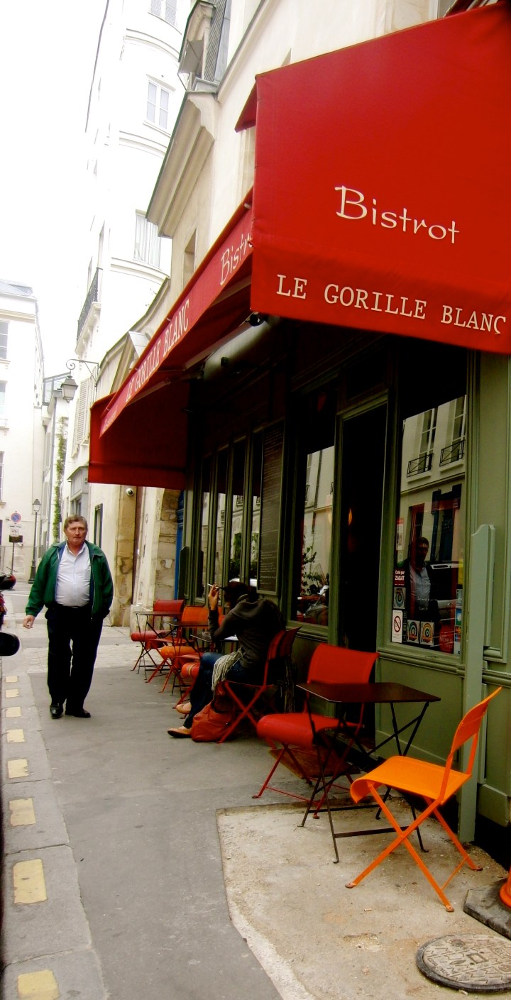 Corinne promised us an authentic French restaurant after our walking tour of the Marais and Place des Vosges. I was beginning to lose trust as we walked past endless postcard stores and tchotchke shops on Rue St. Antoine. Faith was duly restored as we turned down a quiet, dead-end street and came upon a red awning with the restaurant’s name in 1940’s cinema-noir font. A character of a woman was perched outside, reading the newspaper, sipping her espresso, and smoking a cigarette. She was not in the market for knick-knacks or postcards, so I rest assured that we had ventured into local-dom.