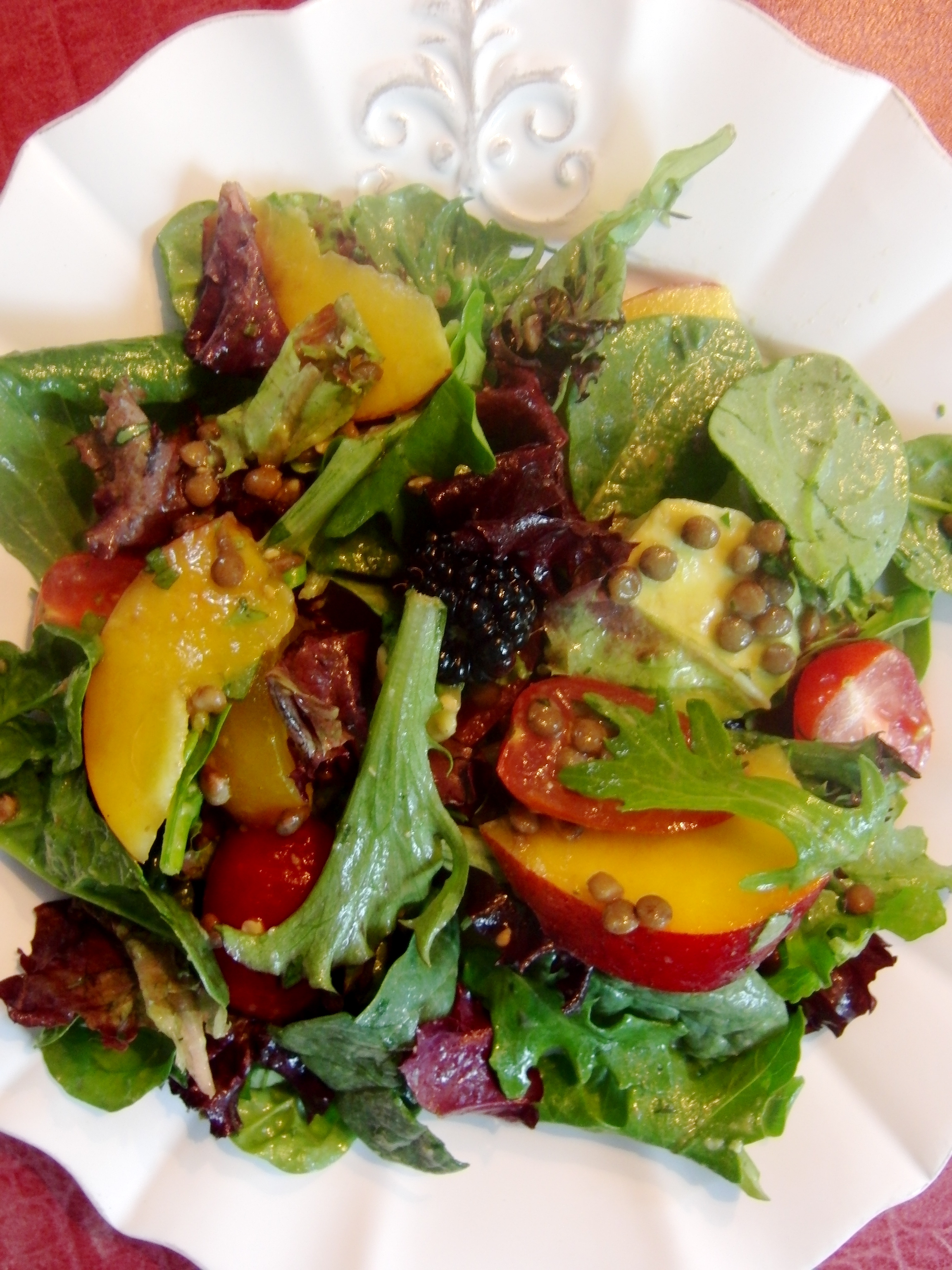 This is a ‘whatever-is-on-my-countertop’ salad. Granted this photo has been sitting in my docket since a time when beautiful Connecticut peaches were in season, perhaps it can be a bit of inspiration for those of us getting cold and cranky in the pre-winter weather. Don’t let the time change get you down; even though it’s dark at 4:30, there is no need to crawl under the blanket with a microwaved dinner when you get home. Make a bright and cheerful salad to lighten your day. Lentils are satisfying, hearty, and chock full of nutrients, while walnuts, renowned for their satiating quality and powerful antioxidants, help boost your mood. Avocados are also known to elevate spirits. Substitute beautiful acorn squash or apple wedges for the peaches. Dress with a simple lemon juice, olive oil, and Dijon mustard vinaigrette, and you’re back under the blanket. Rely on winter thermals from Patagonia to keep you warm, not pesky layers of skin.