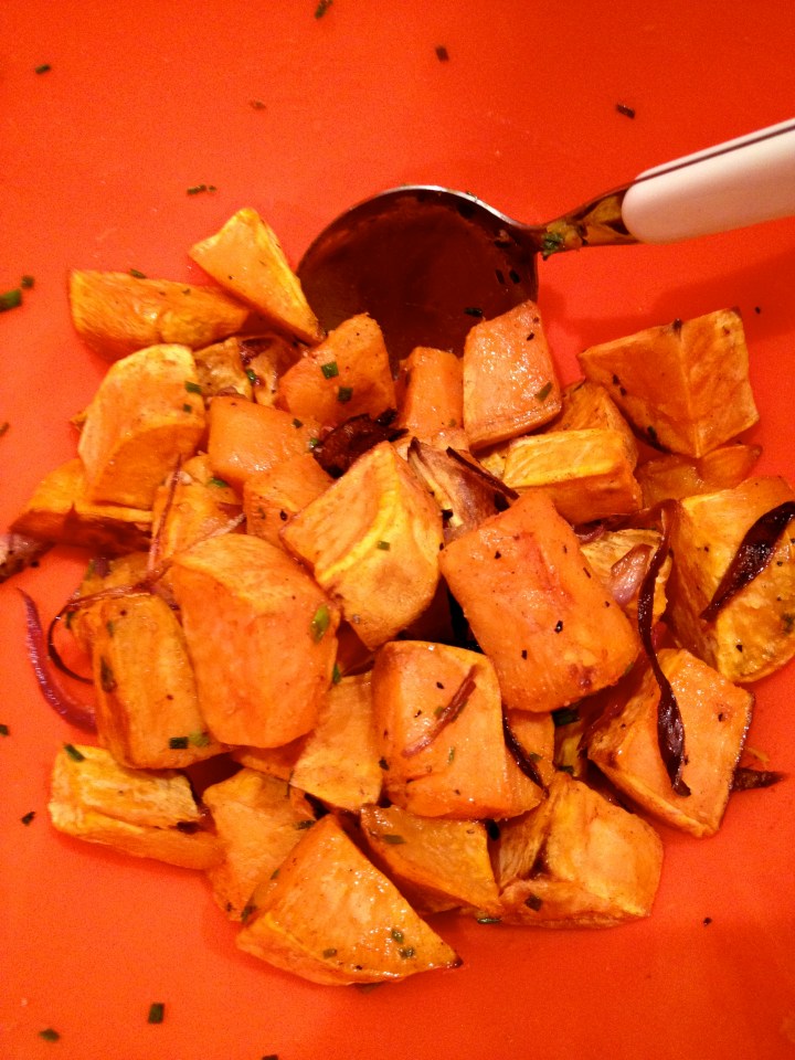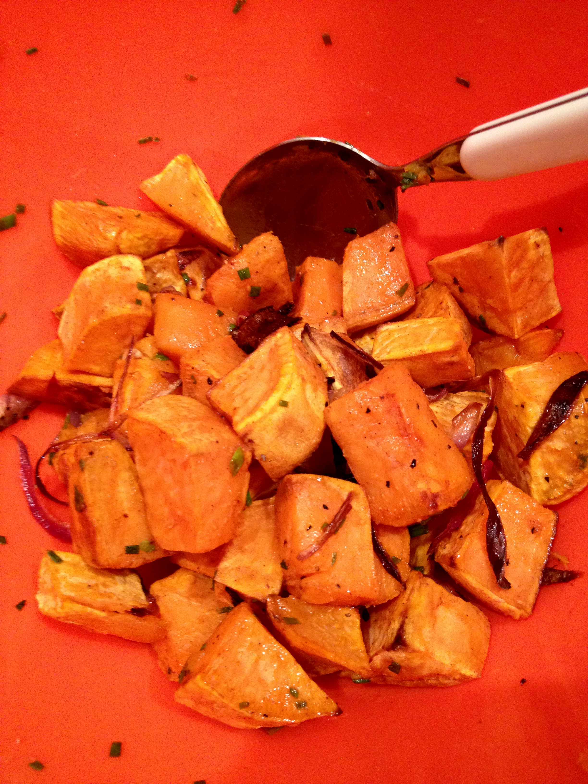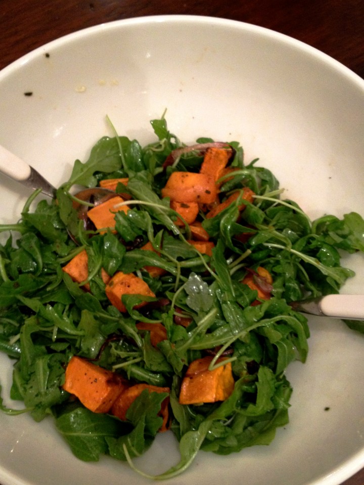 Ingredients: 2 sweet potatoes, peeled and cut into small cubes, 1/2 red onion thinly sliced, ground black pepper, 1/2-1 tsp ground cinnamon, 1/4 cup white wine vinegar (or balsamic if you prefer), 1 tablespoon honey, 2 tablespoons chopped chives, baby arugula, drizzle of good olive oil