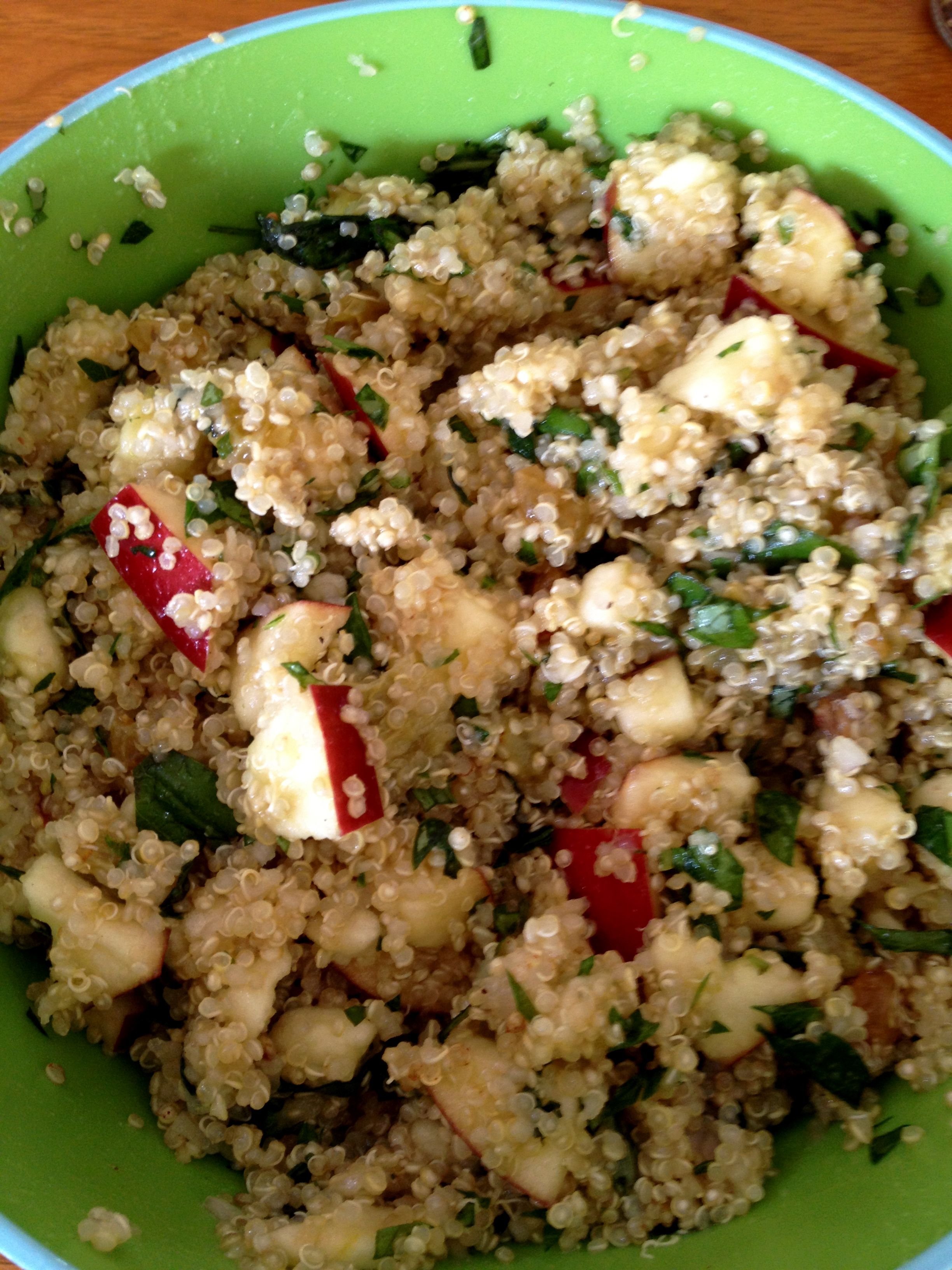 Ingredients: 1 cup quinoa, 1 Red Delicious Apple cored and chopped, 2 tablespoons extra virgin olive oil, 2 tablespoons golden raisins, 1 tablespoon white wine vinegar, 1 teaspoon honey, 1 shallot minced, 1 garlic clove minced, 2 tablespoons chopped parsley, 2 tablespoons chopped basil, a pinch of cinnamon and nutmeg (optional)