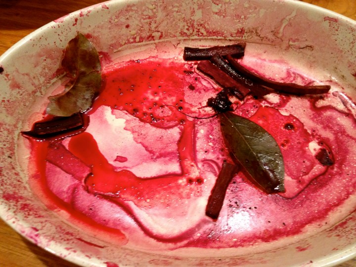 Preheat the oven to 375 degrees F. Place the beets in a baking dish, such as the one below, along with the cinnamon, bay leaves, and water. Cover tightly with foil and bake for 1.5 hours, or until the beets are tender when you gently squeeze them. Discard the water, but keep the spices.