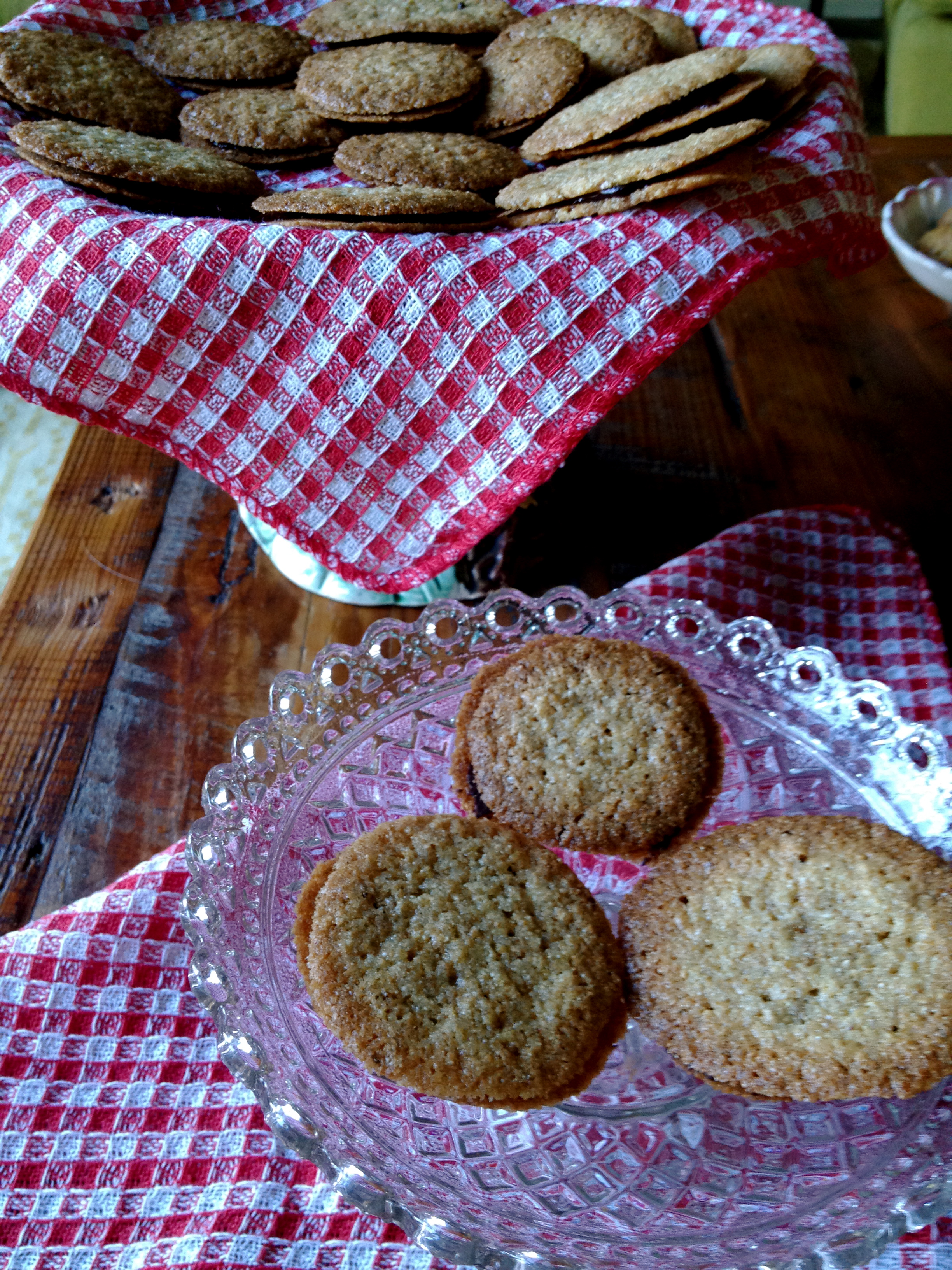 Let them cool on the sheet pan for 1-2 minutes before very gently peeling them off and placing them on a drying rack. This is an important step or the cookies won’t dry evenly. Once dry, use a butter knife or small flat spreading spatula to spread a dollop of chocolate onto one cookie. Sandwich it with another cookie (this is why it is nice to try to make all the cookies the same size). Place the sandwich cookie back on the drying rack so that the chocolate center dries and hardens. Bake the next batch and repeat until there is no more batter.