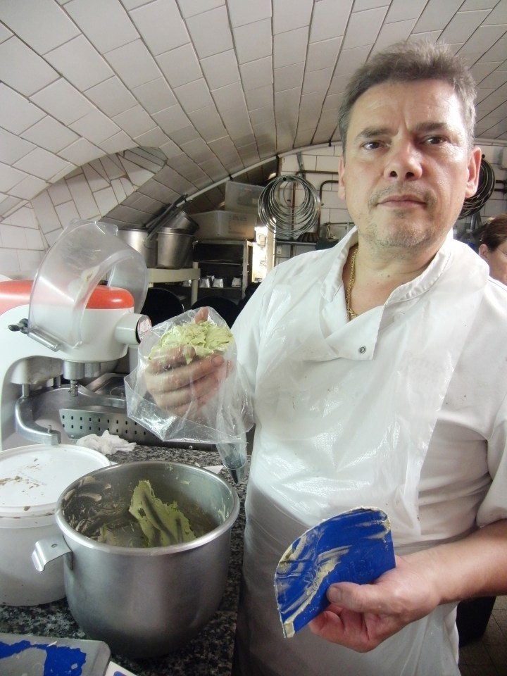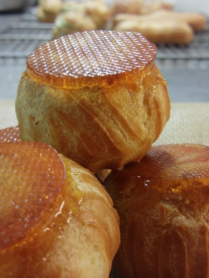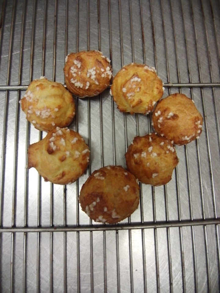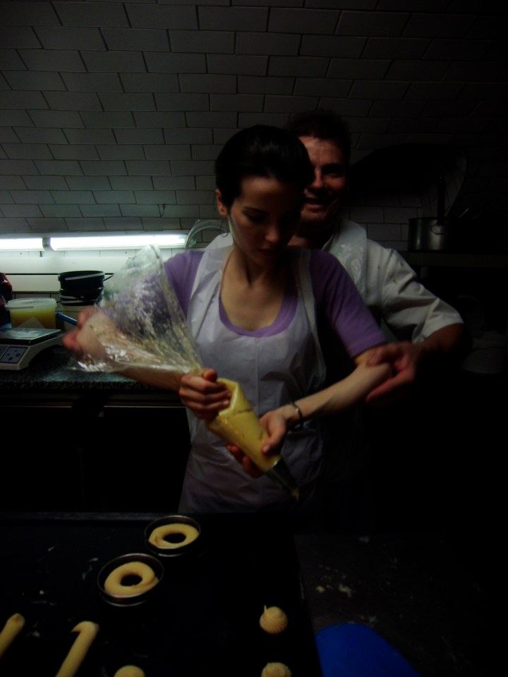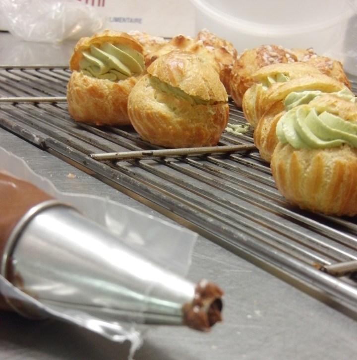 We made these little choux pastries during a French pastry class designed by bon vivant Corinne Preteur. The trick to their perfectly adorable shape is in the piping, as is the artful cream filling. If you prefer to leave them unfilled, dust them with sugar crystals or dip them in caramel and have a cafe while they dry and harden. The recipes for choux pastry dough and pastry cream can be found on a recent post for eclairs and Paris Brest, also made in Les Grenier a Pain’s delightful kitchen beneath their neighborhood boulangerie, as famous for their fruit tarts as they are for their spiced breads and traditional loaves. Fill the little choux with the flavored cream of your choice. My personal preference is pistachio and/or praline, but I never met a pastry cream I didn’t fancy.