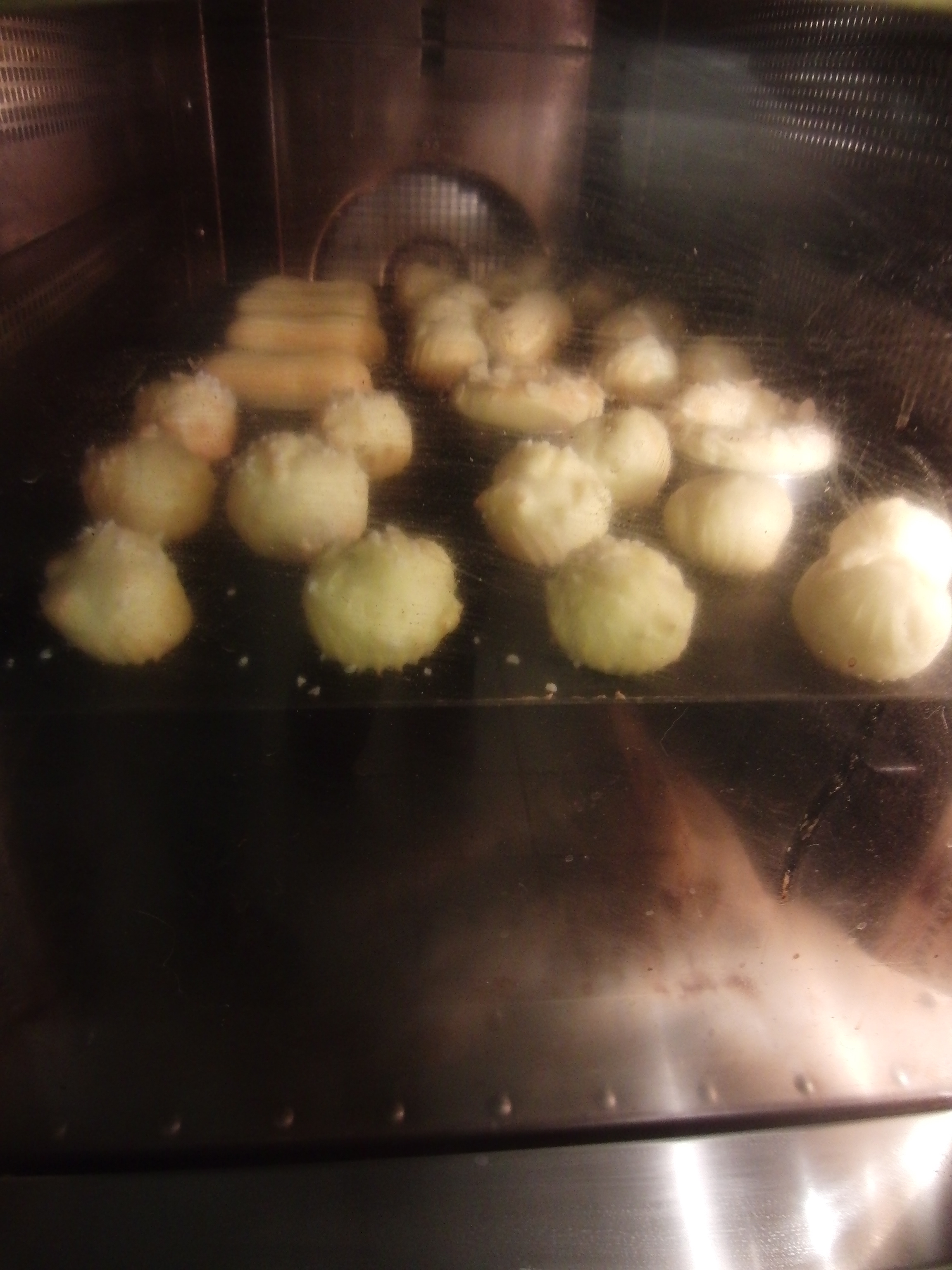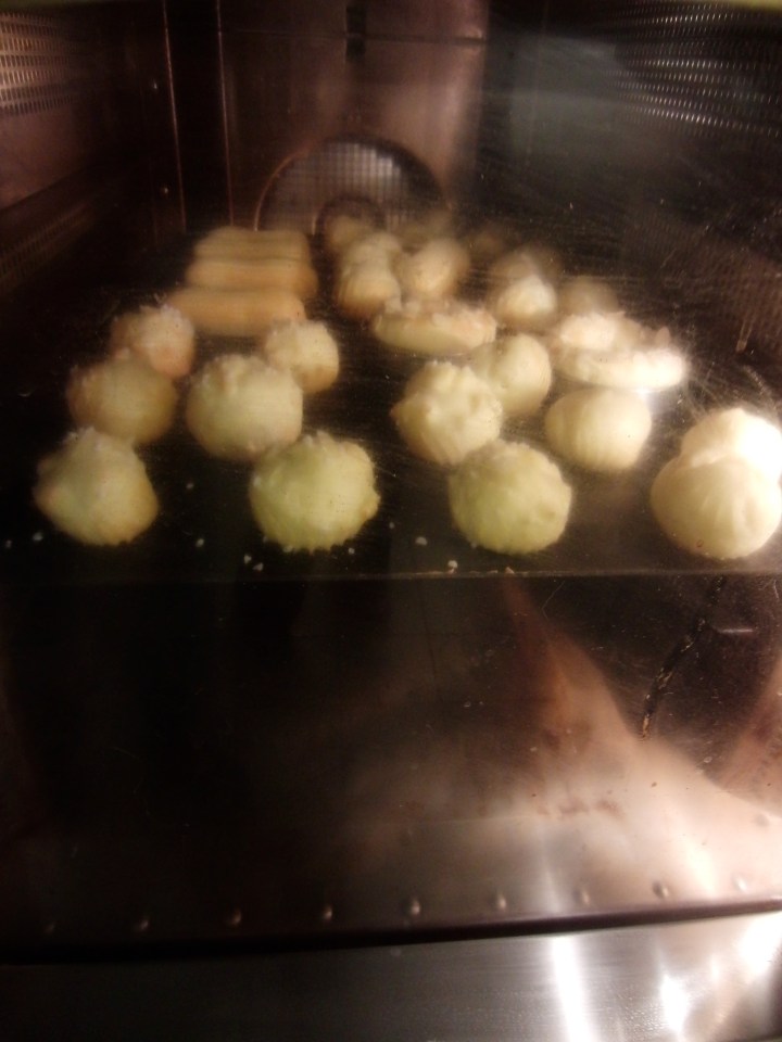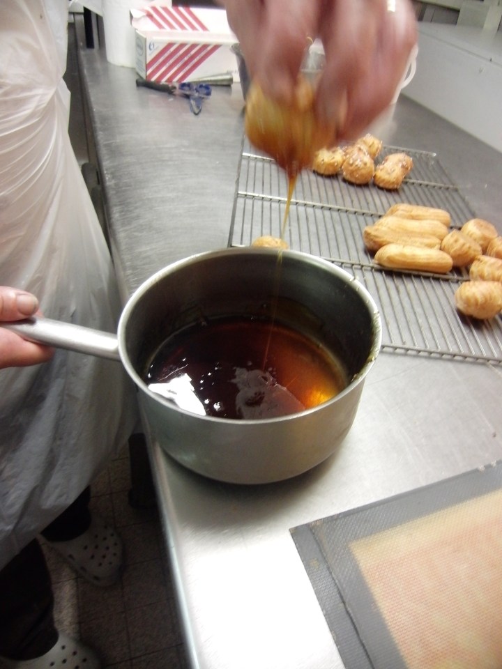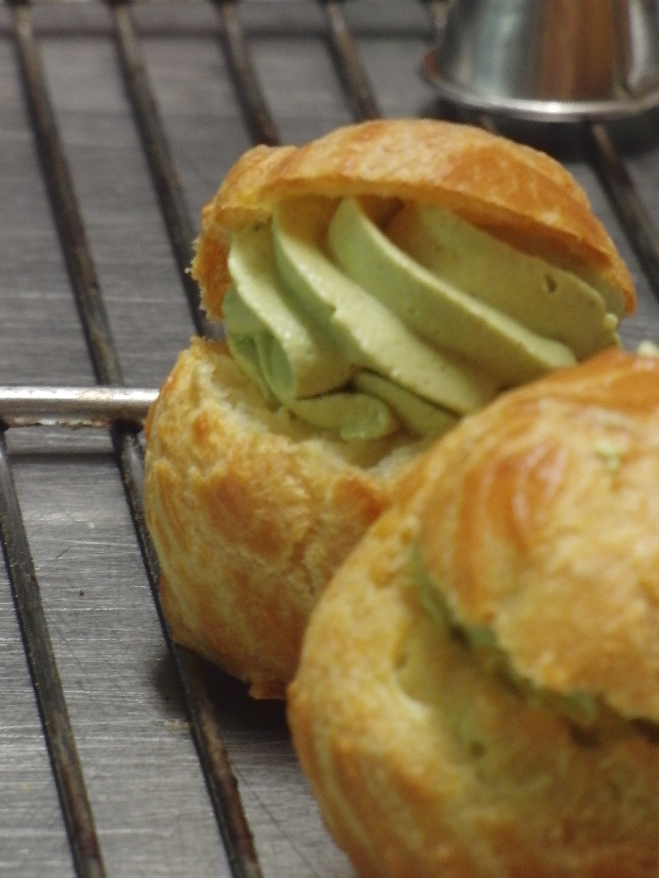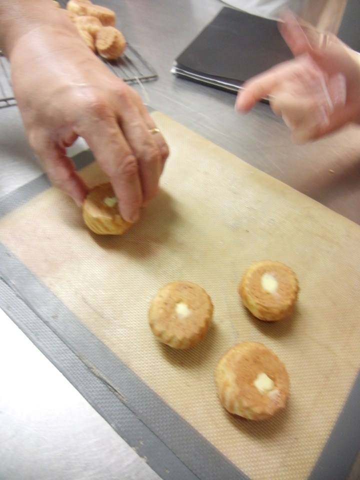 Poke a hole in the bottom of the choux and insert the tip of the pastry bag to fill the choux up with pastry, like a little balloon.