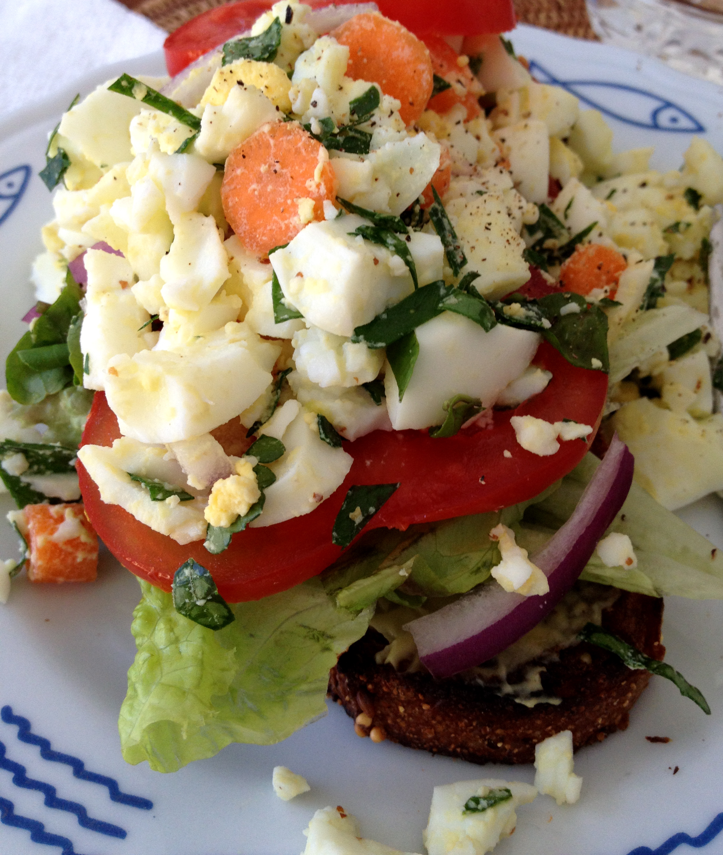 In a medium bowl, mix a couple chopped, hardboiled eggs with a few spoonfuls of chopped parsley and basil, 1 carrot chopped into rounds, 1 chopped vine tomato, 1/4 thinly sliced red onion, salt, pepper, lemon juice, and olive oil. Lightly toast whole wheat multi grain bread and smear with avocado. Top with butter leaf lettuce and a few slices of tomato, and then spoon the egg salad on top. Don’t kid yourself and try to pick this up like a tartine: you will most definitely require a fork (and a napkin).
