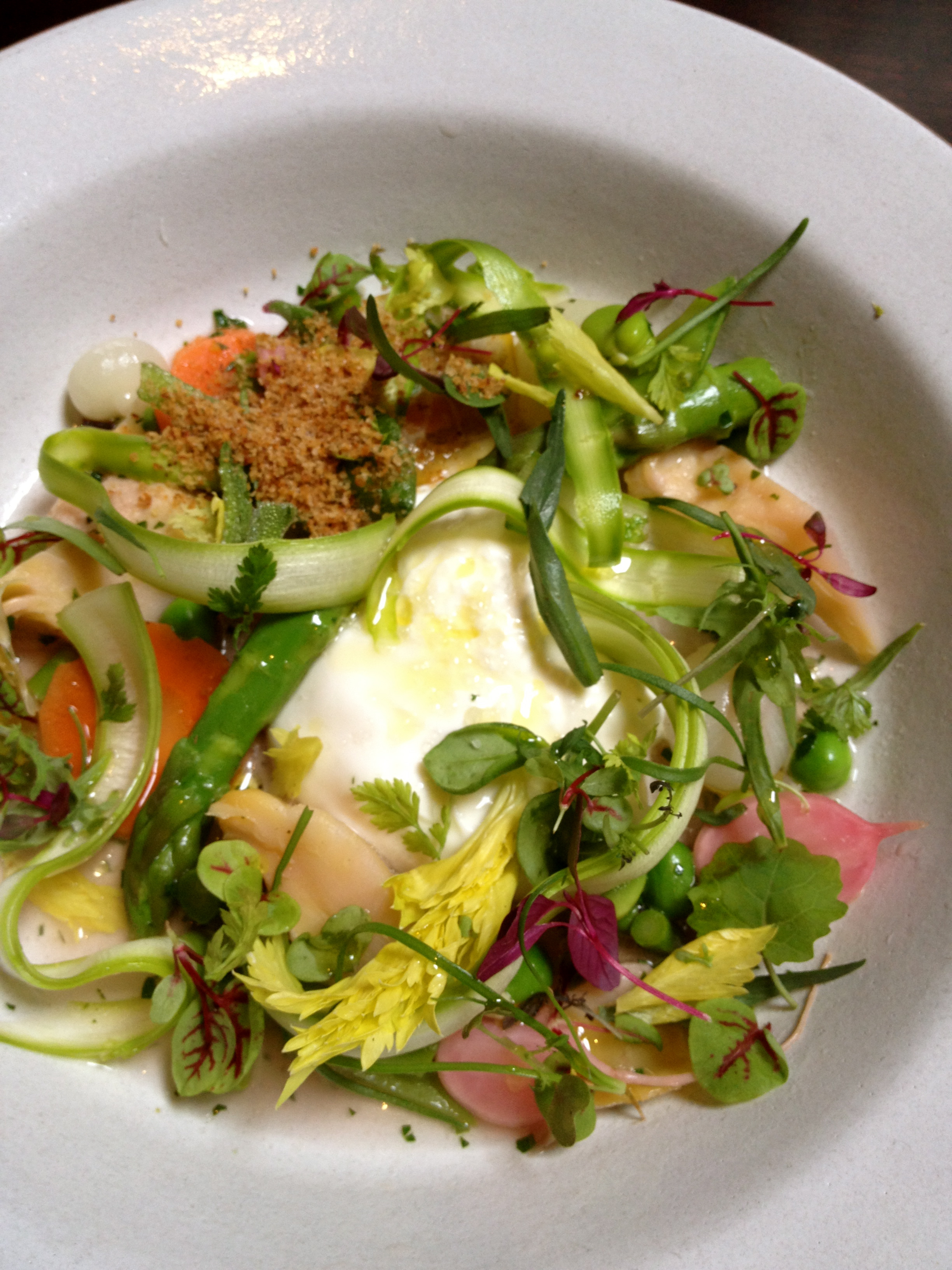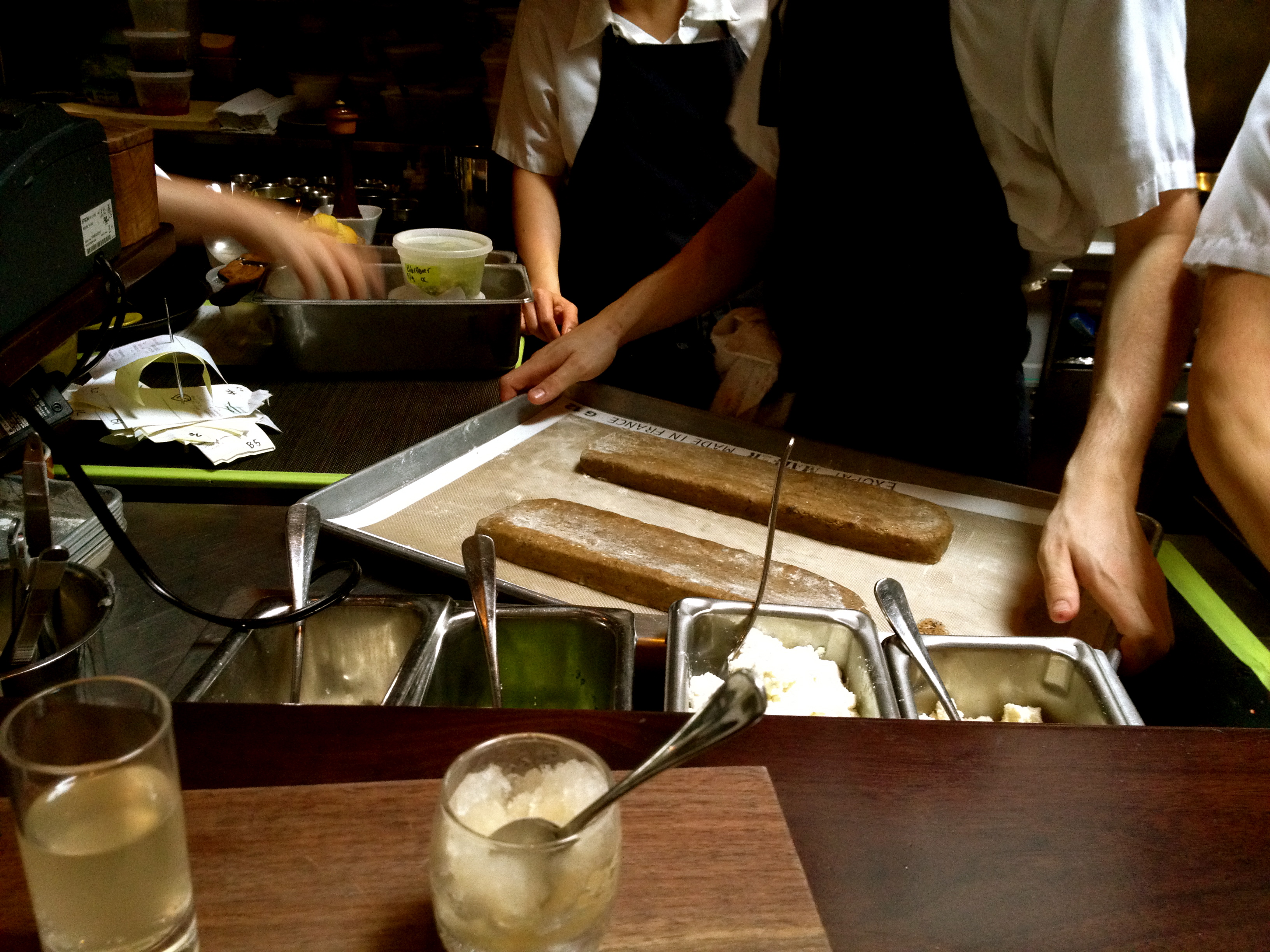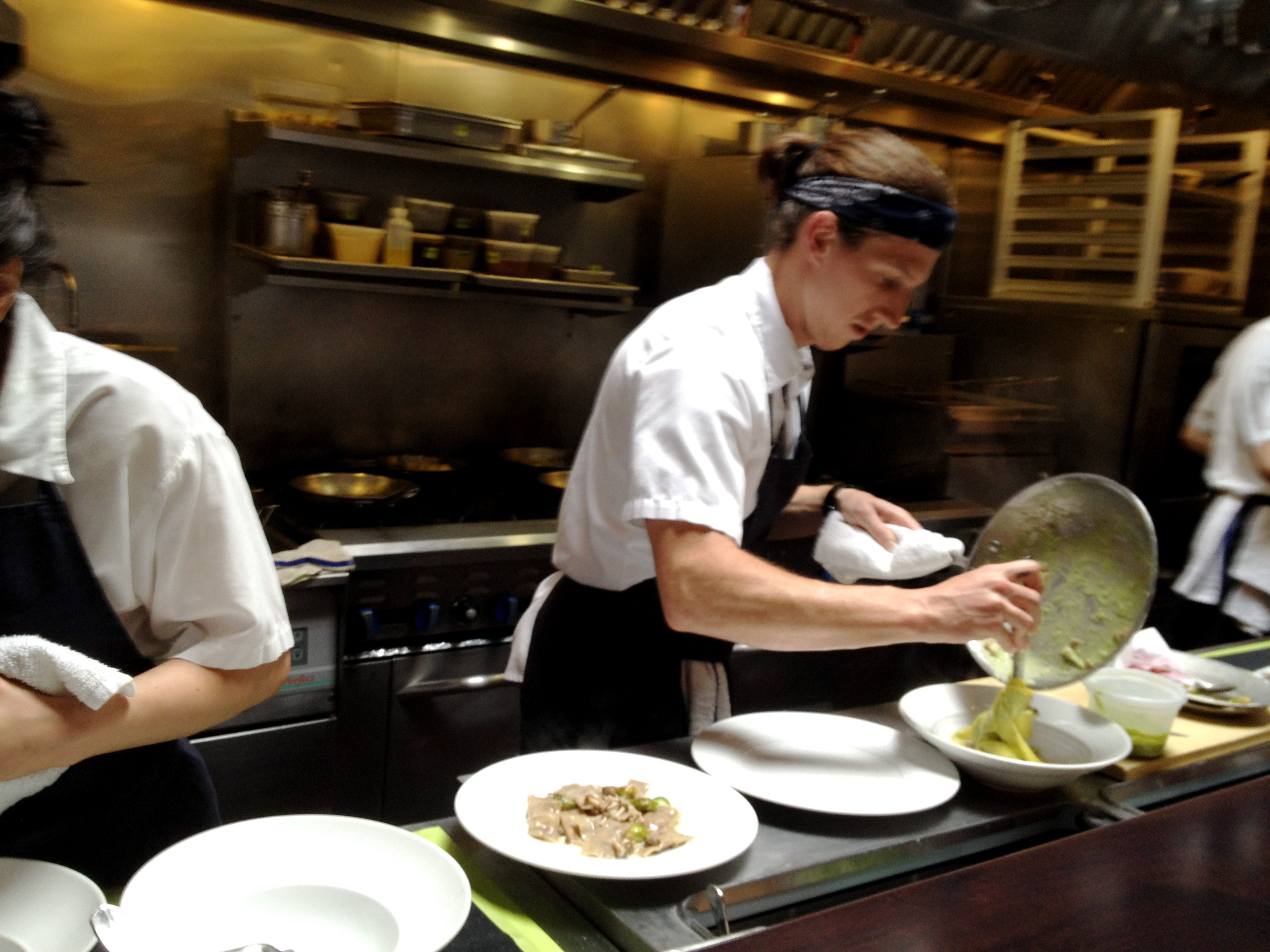 I arrived a few minutes before 5:30. Eager diners were already waiting for the restaurant to unlock its doors. Once the dark burgundy curtain was pushed aside and the door opened, I took my seat at the bar, otherwise known as the “Chef’s Table.” The relaxed restaurant went from fairly quiet to buzzing within twenty minutes. I watched the young cooks before me go from standing idly by to trained agility and expeditiousness. Executive chef Matthew Accarrino, who shared with me his culinary history (a short time in Italy included- certo!), remained outside of the cooktop area. He oversaw plating, added final elements to each dish, and periodically attended to the salumi-maker. Calm, professional, and composed, he was the opposite of Romans as I know them. Chef seemed like the unsuspecting ruler of the gladiators, rather than the chaotic aggressor. I did observe one resemblance: just as the Italians did, but with far smaller portions, he graciously shared amuse-bouches throughout my meal. Chef is a thoughtful, creative cook. The mulberries served alongside his white balsamic sorbet were actually picked from his own tree.