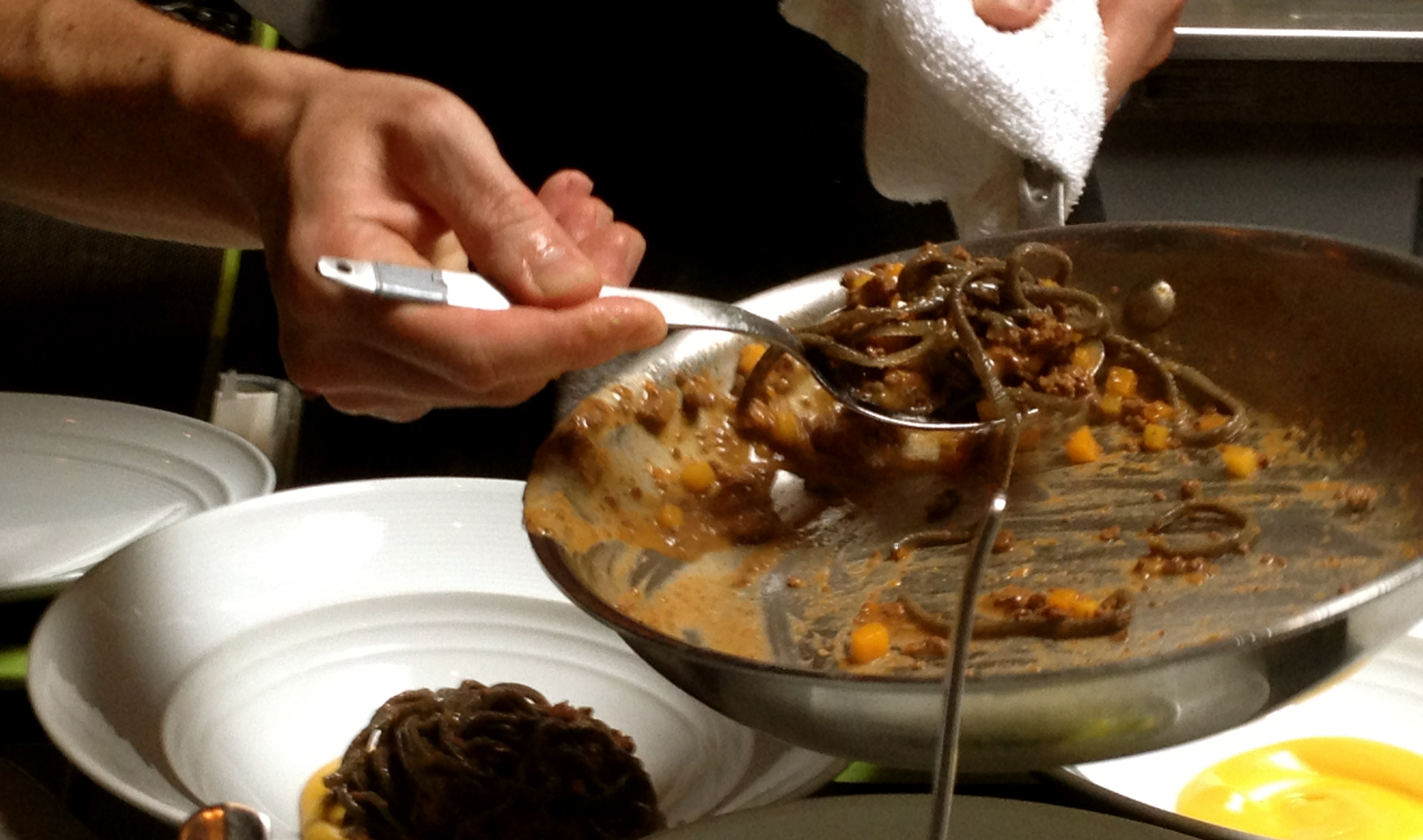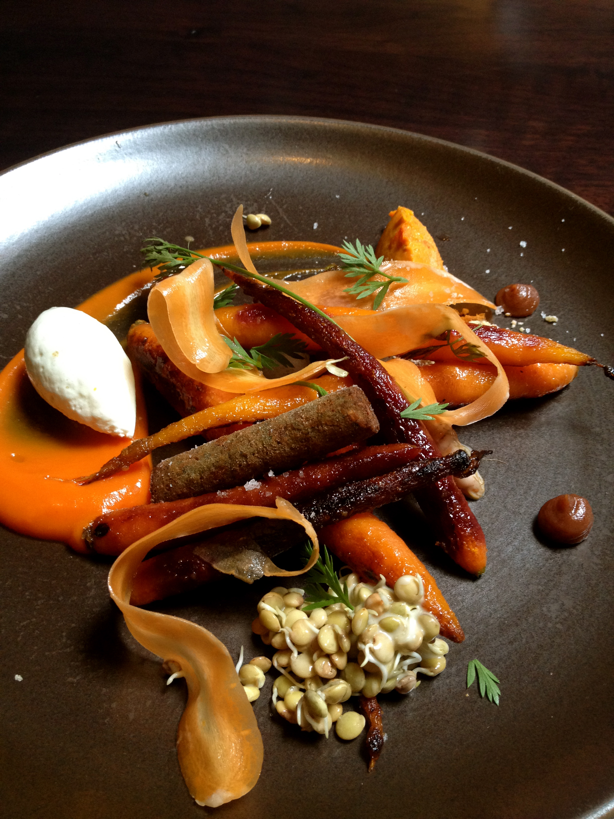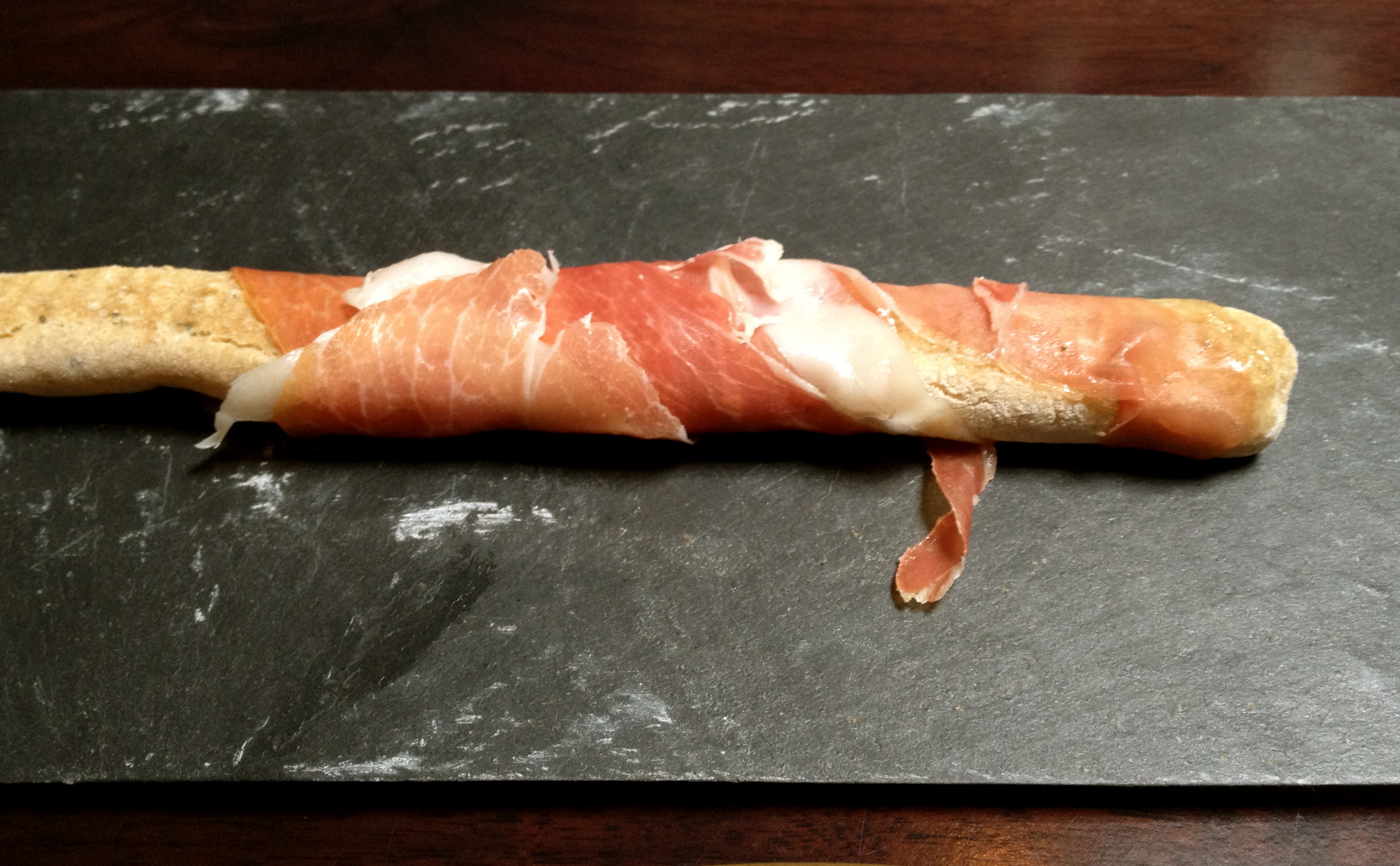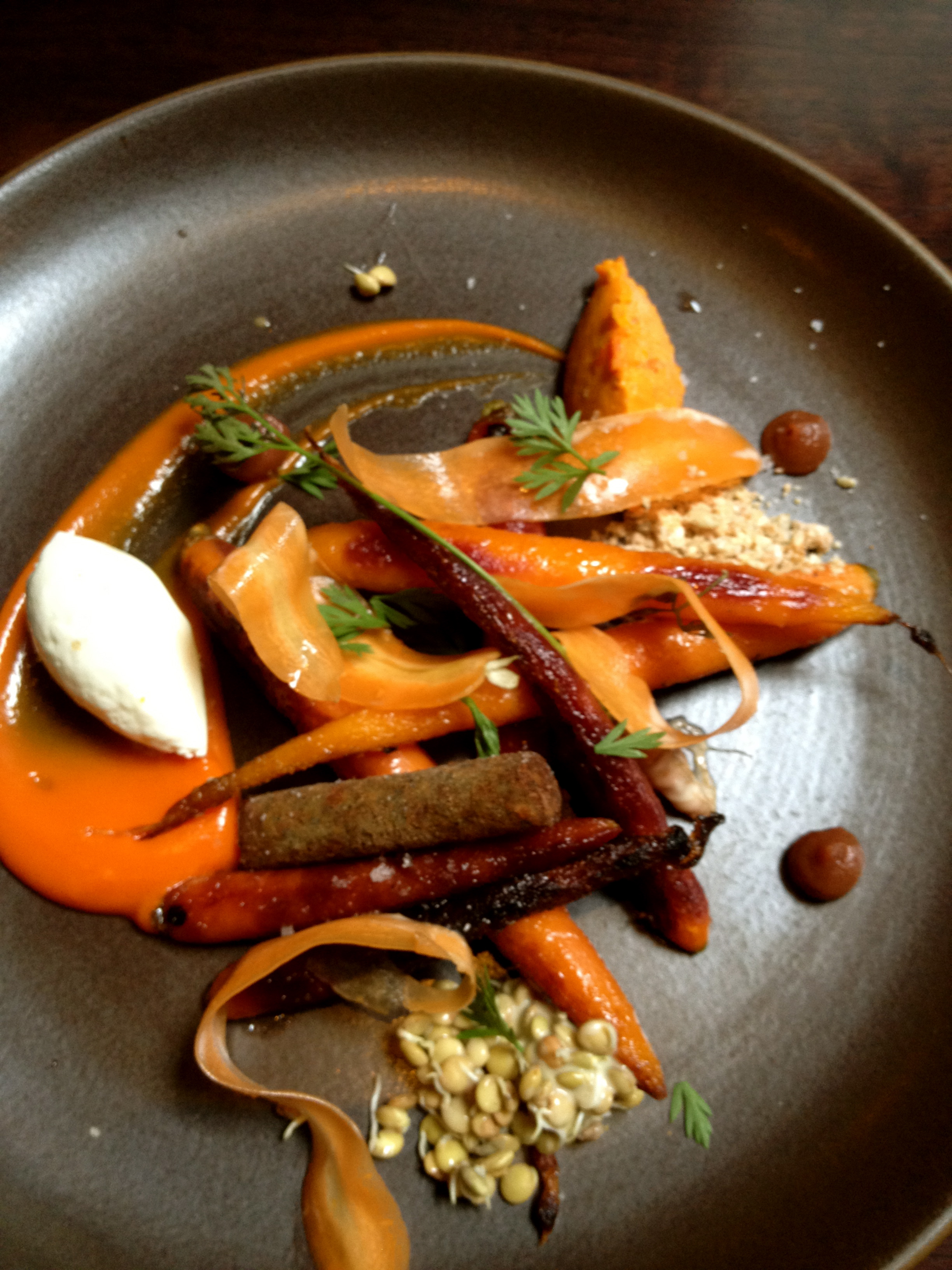 I arrived a few minutes before 5:30. Eager diners were already waiting for the restaurant to unlock its doors. Once the dark burgundy curtain was pushed aside and the door opened, I took my seat at the bar, otherwise known as the “Chef’s Table.” The relaxed restaurant went from fairly quiet to buzzing within twenty minutes. I watched the young cooks before me go from standing idly by to trained agility and expeditiousness. Executive chef Matthew Accarrino, who shared with me his culinary history (a short time in Italy included- certo!), remained outside of the cooktop area. He oversaw plating, added final elements to each dish, and periodically attended to the salumi-maker. Calm, professional, and composed, he was the opposite of Romans as I know them. Chef seemed like the unsuspecting ruler of the gladiators, rather than the chaotic aggressor. I did observe one resemblance: just as the Italians did, but with far smaller portions, he graciously shared amuse-bouches throughout my meal. Chef is a thoughtful, creative cook. The mulberries served alongside his white balsamic sorbet were actually picked from his own tree.