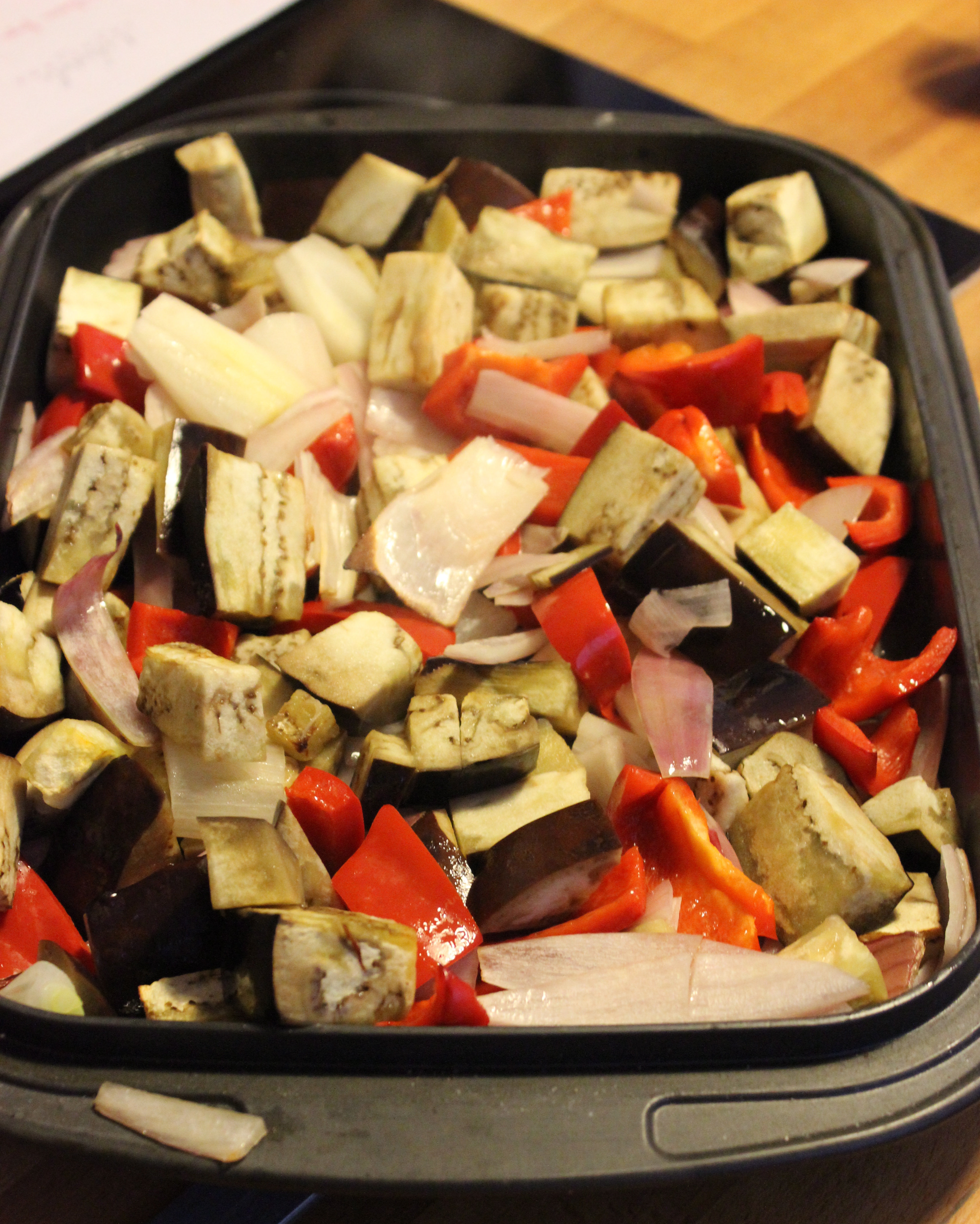 Cut the eggplant into large quarters. Slice the red peppers into strips and slice the onion into chunks. Toss the vegetables on a large baking sheet with olive oil, salt, and pepper. Bake for 40 minutes. Take them out to toss halfway through to ensure that they cook evenly. Drizzle the agave on the vegetables (optional) and bake for 10 more minutes, until the vegetables are very tender.