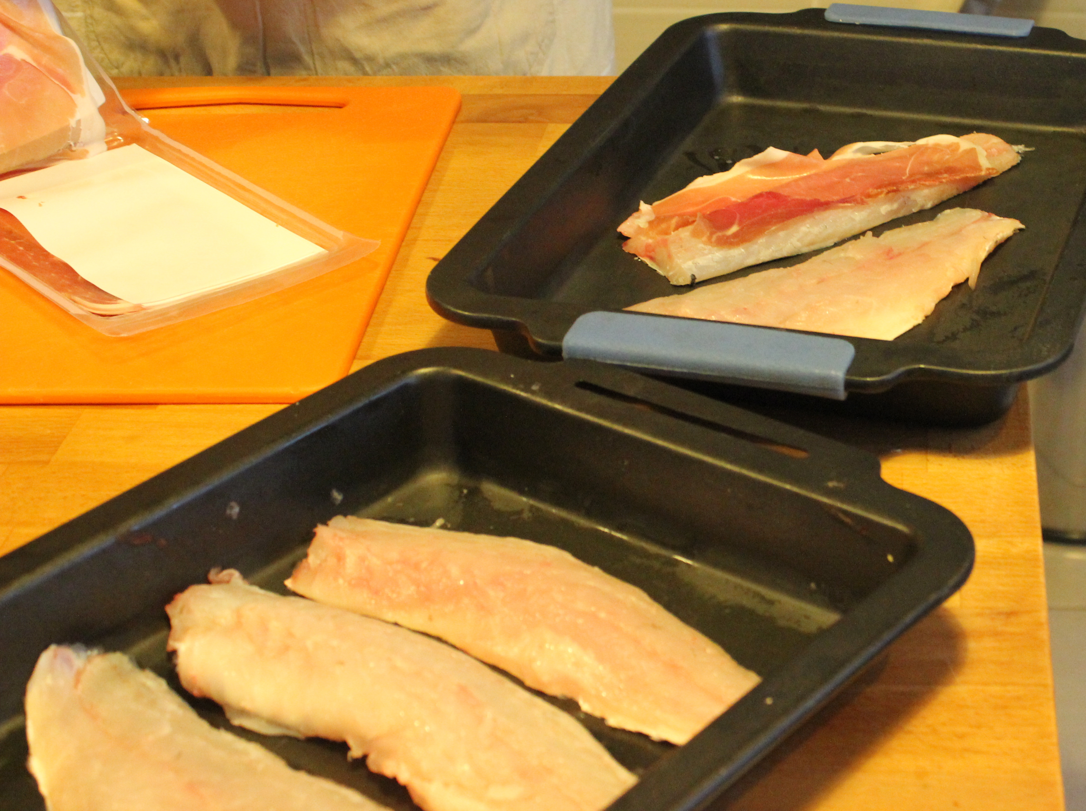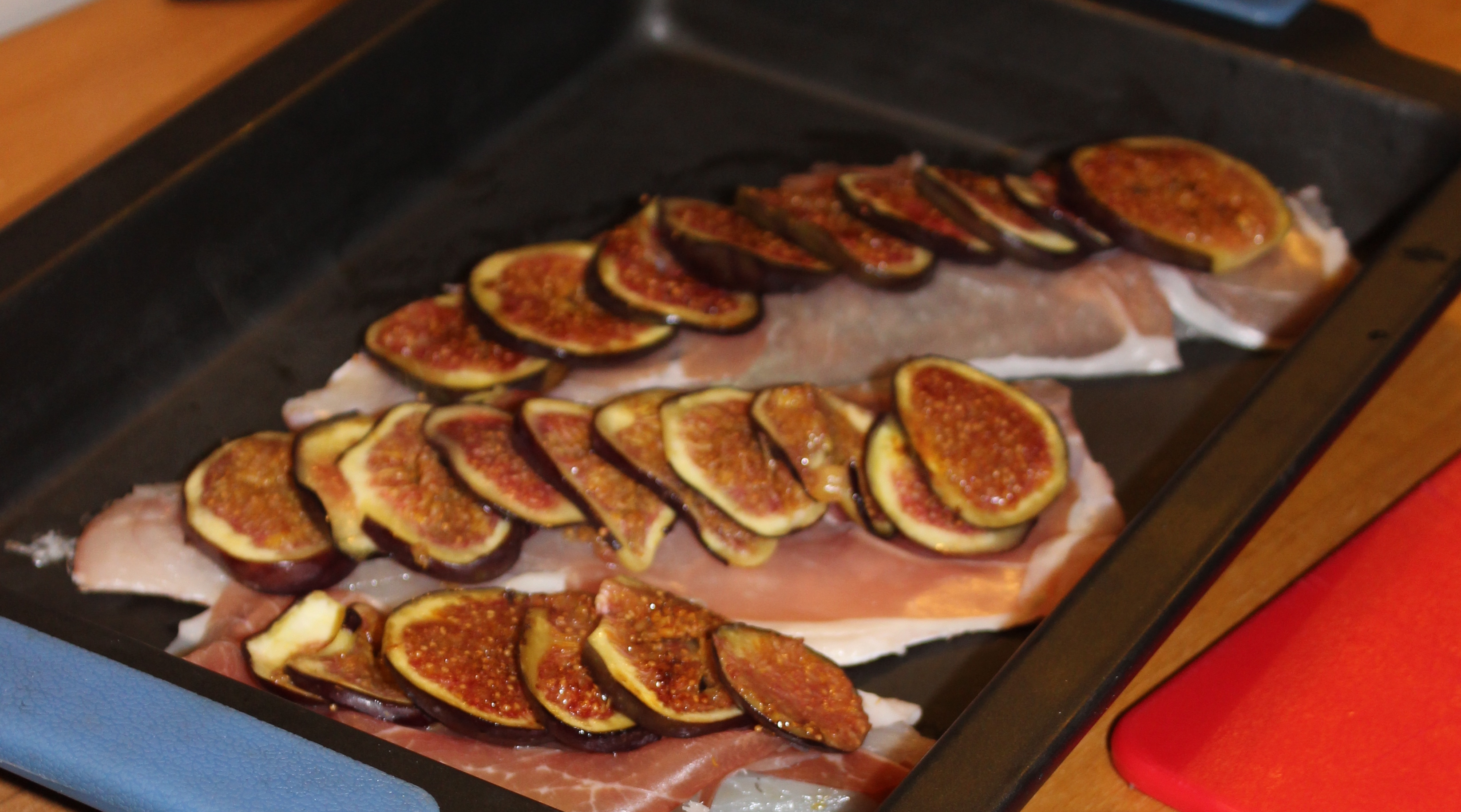 Drizzle a little olive oil in a large baking dish. Put the fish fillets in the dish and top each with a slice of prosciutto and layered figs. Cover with parchment paper and bake for 10 minutes at 500 degrees F.