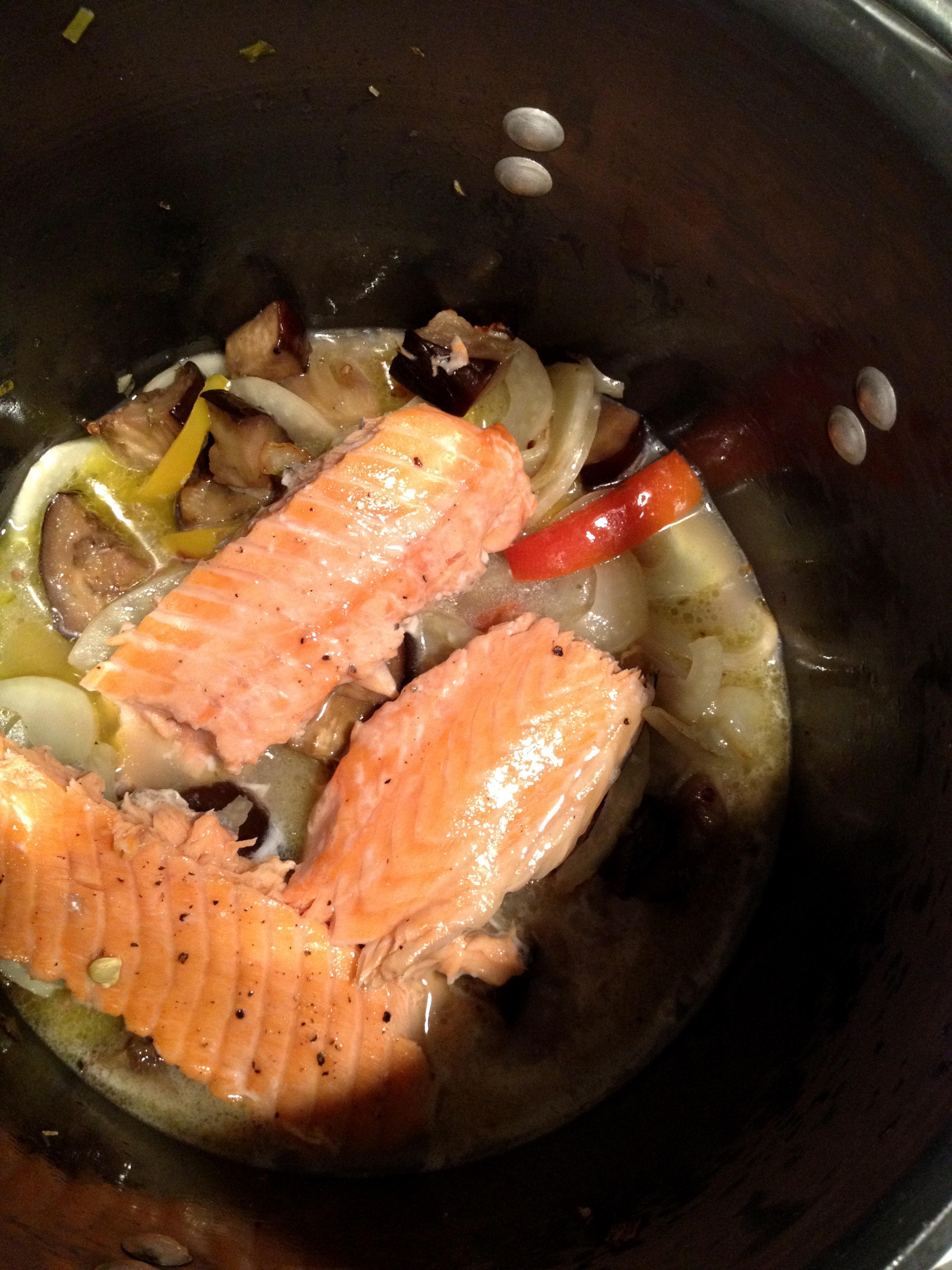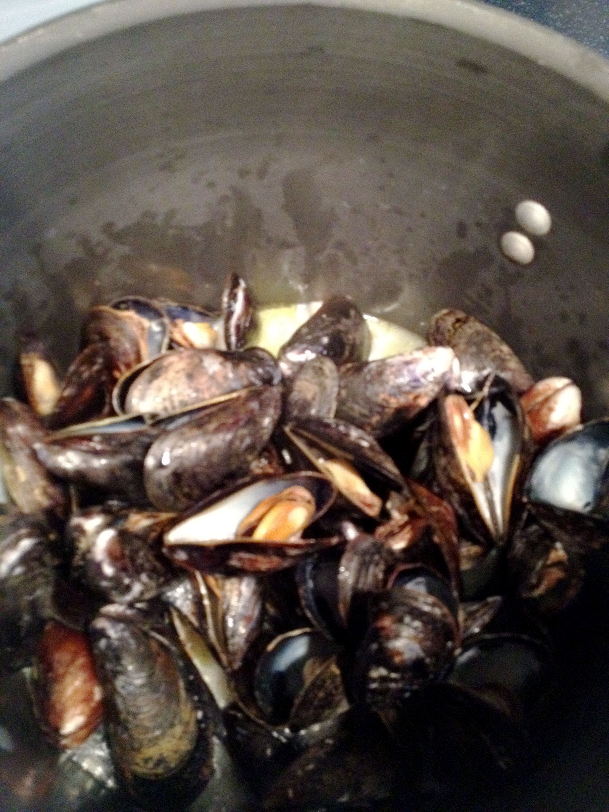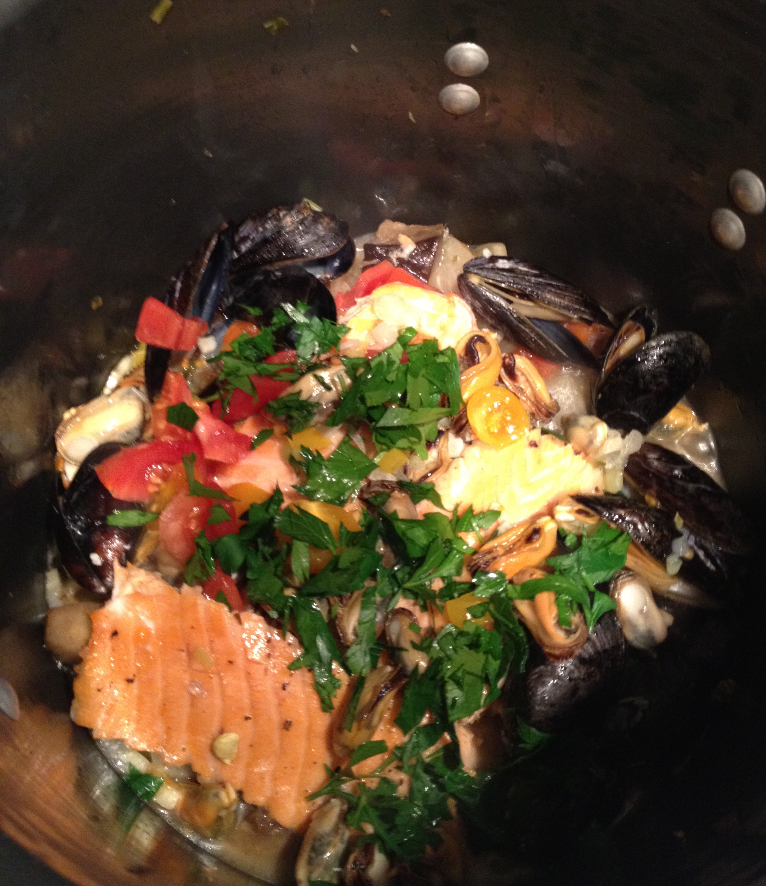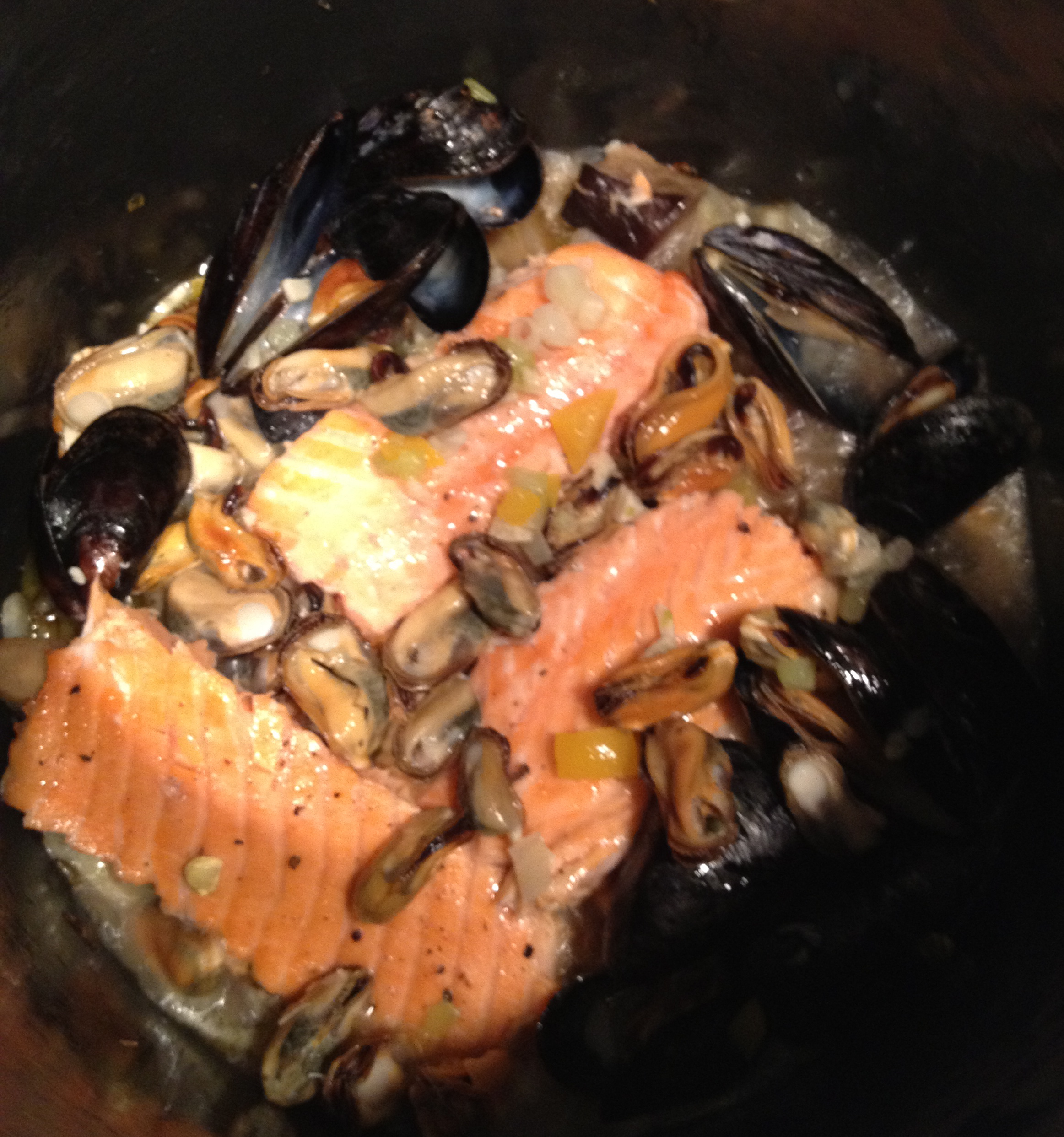 Kosta night. With a bottle of Greek white wine (Axia Malagouzia), I decided to follow a bit of a Greek theme. First I got the salmon going in the oven with sliced fennel, plenty of lemon juice, and a small amount of salt and pepper. Then I cooked the mussels in the pot with plenty of garlic, white wine, sliced bell pepper, and few other ingredients. Once the mussels opened, I removed most of them from their shell and returned them to the pot. I added a handful of chopped parsley, tomatoes, and finally the salmon. This dish, though very light, was full of flavor and texture, and the wine was the perfect accompaniment with its aromas and hint of rosemary. Kalí óreksi!