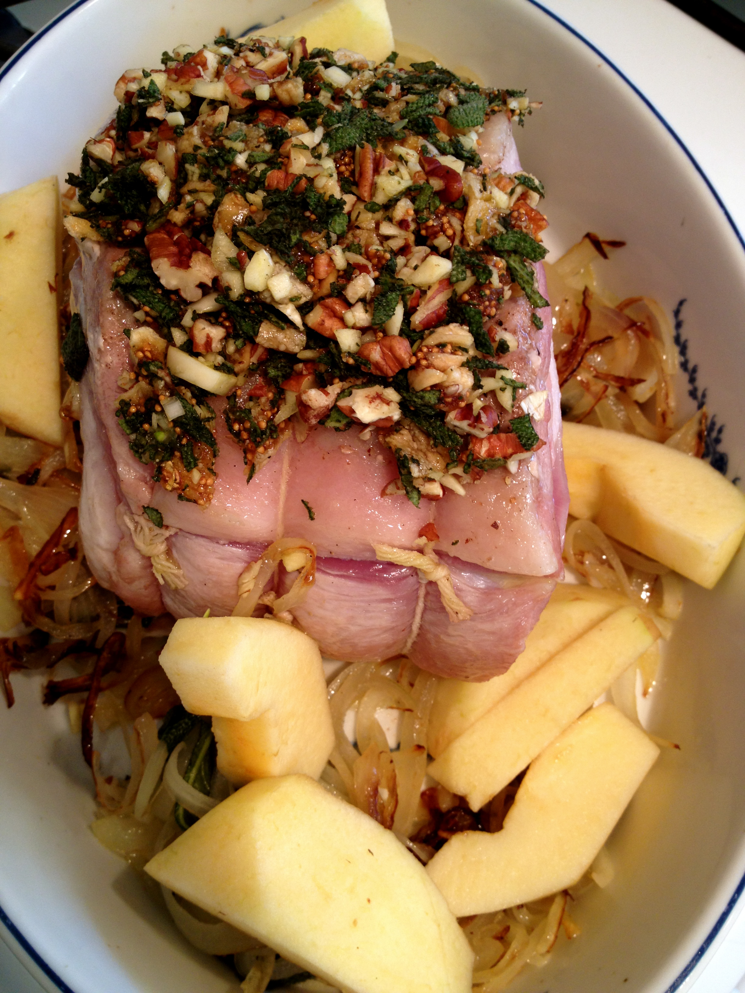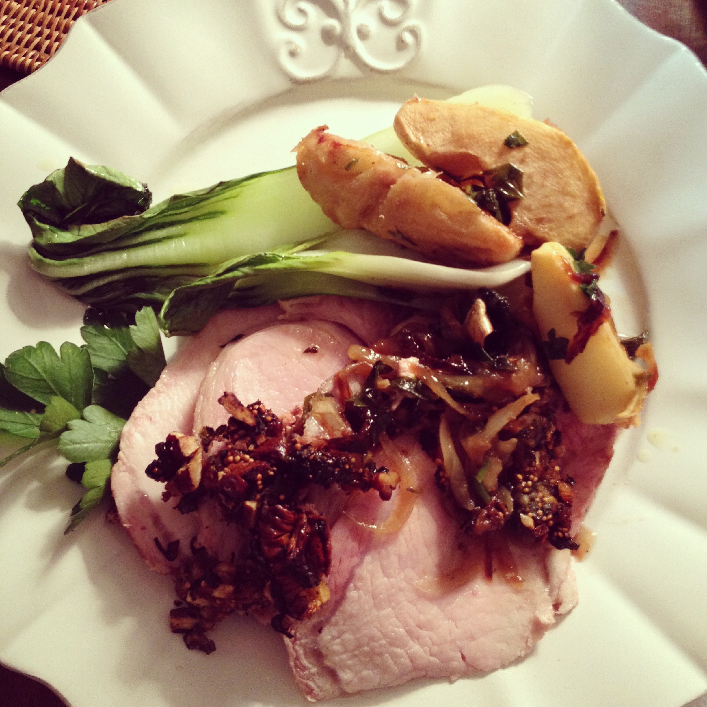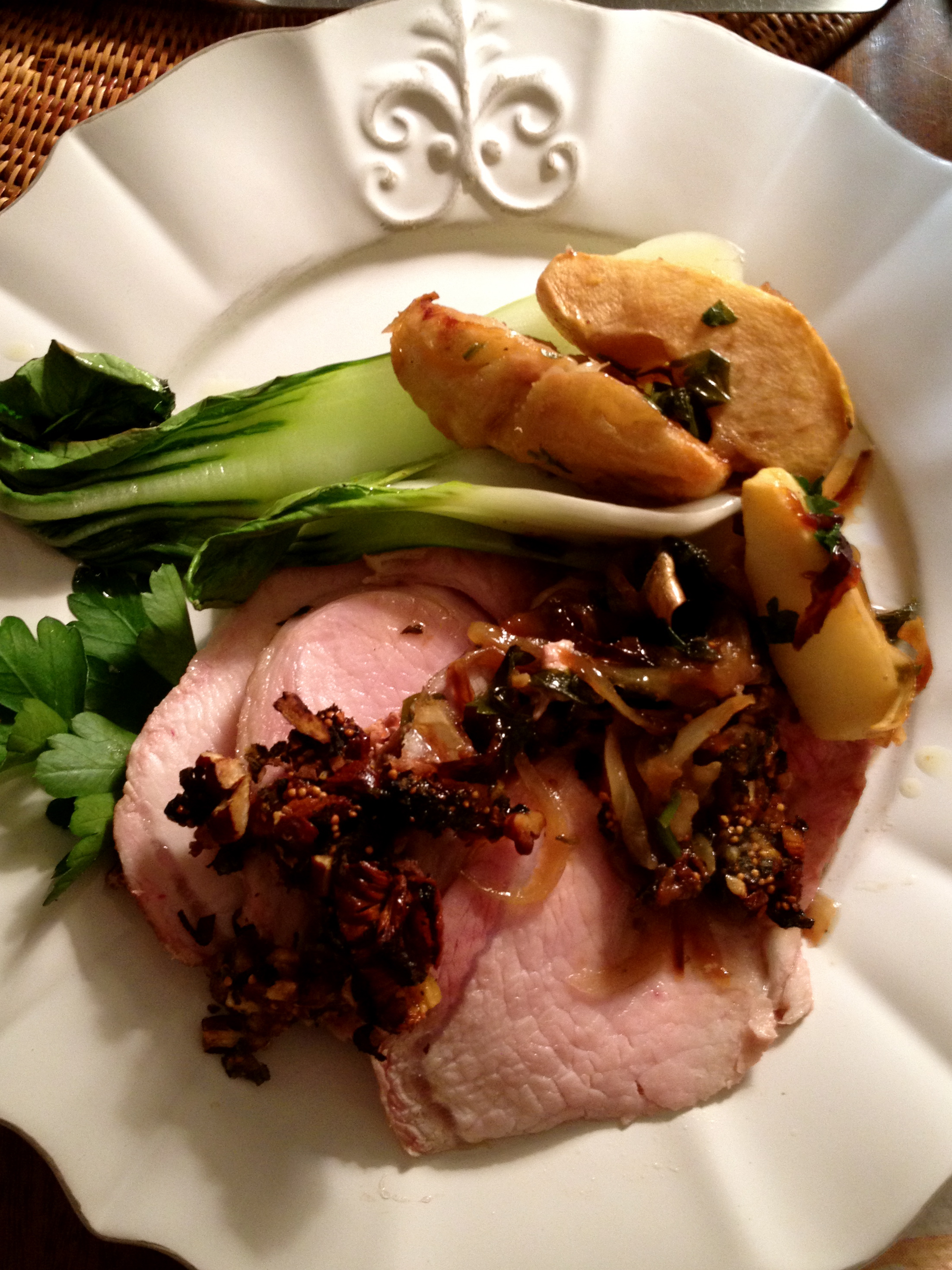 Mix the ingredients for the crust in a small bowl. (chopped pistachios, chopped figs, diced garlic, chopped sage leaves, chopped pecans, pinch of salt and pepper). Slice the onion and saute in a little olive oil until it is soft and tender and beginning to caramelize. Roast the pork on its own for about 20 minutes at 400 degrees F to get it going. Then take it out, pour the caramelized onion into the bottom of the roasting pan, sit the pork on top, surround with apple chunks, and affix the crust. Roast for about an hour and 45 minutes. Steam the bok choy while the pork is resting.