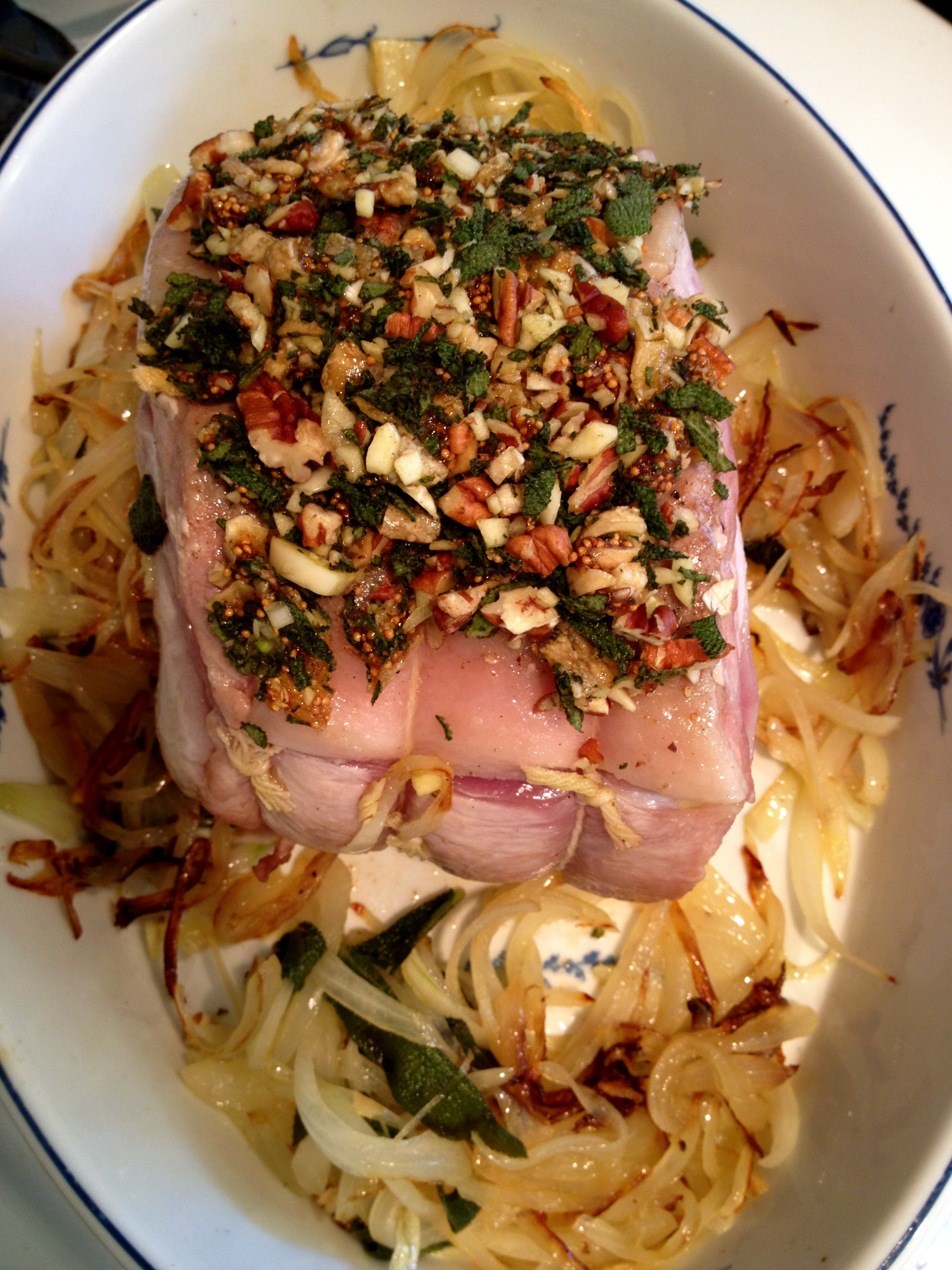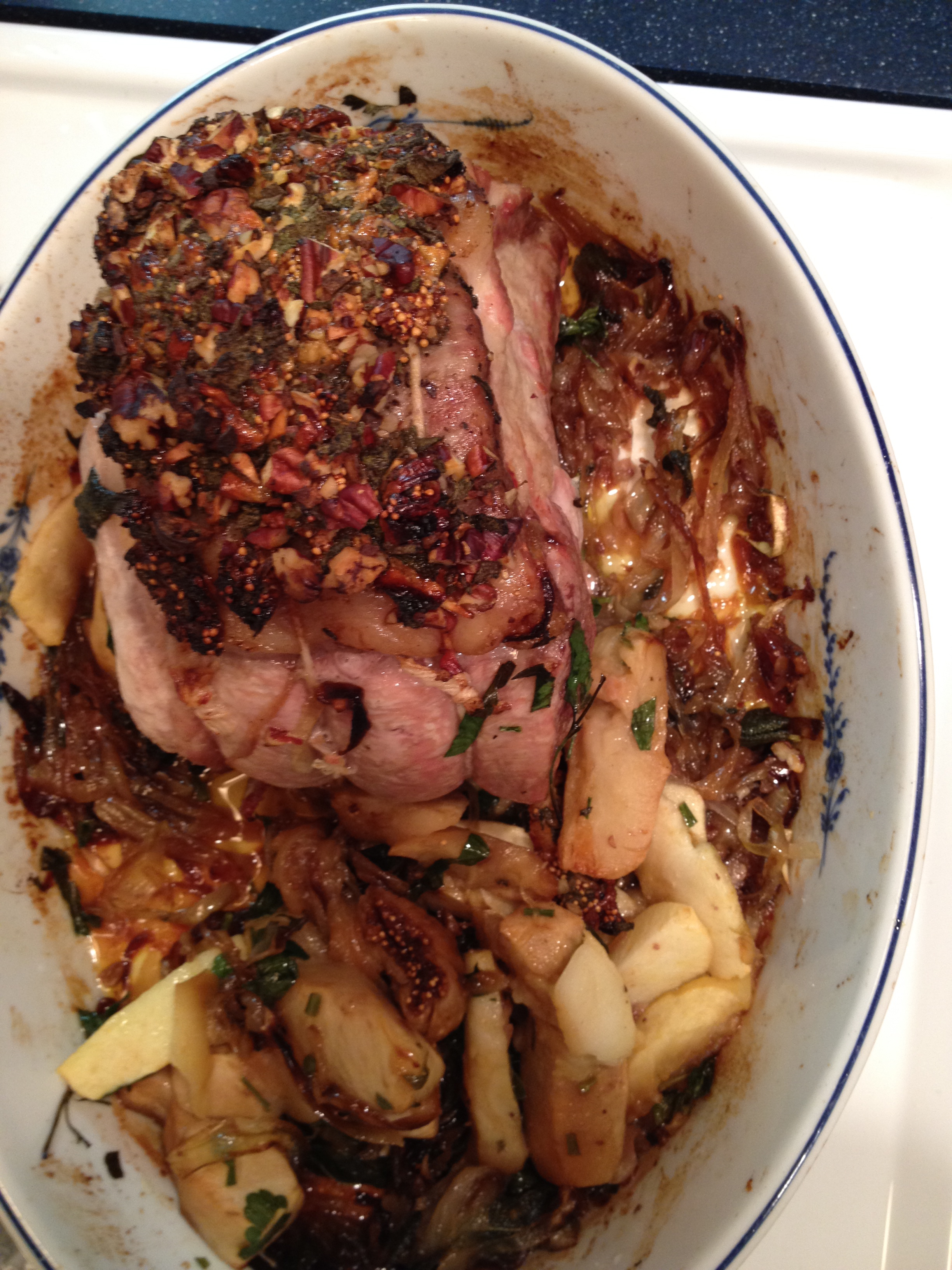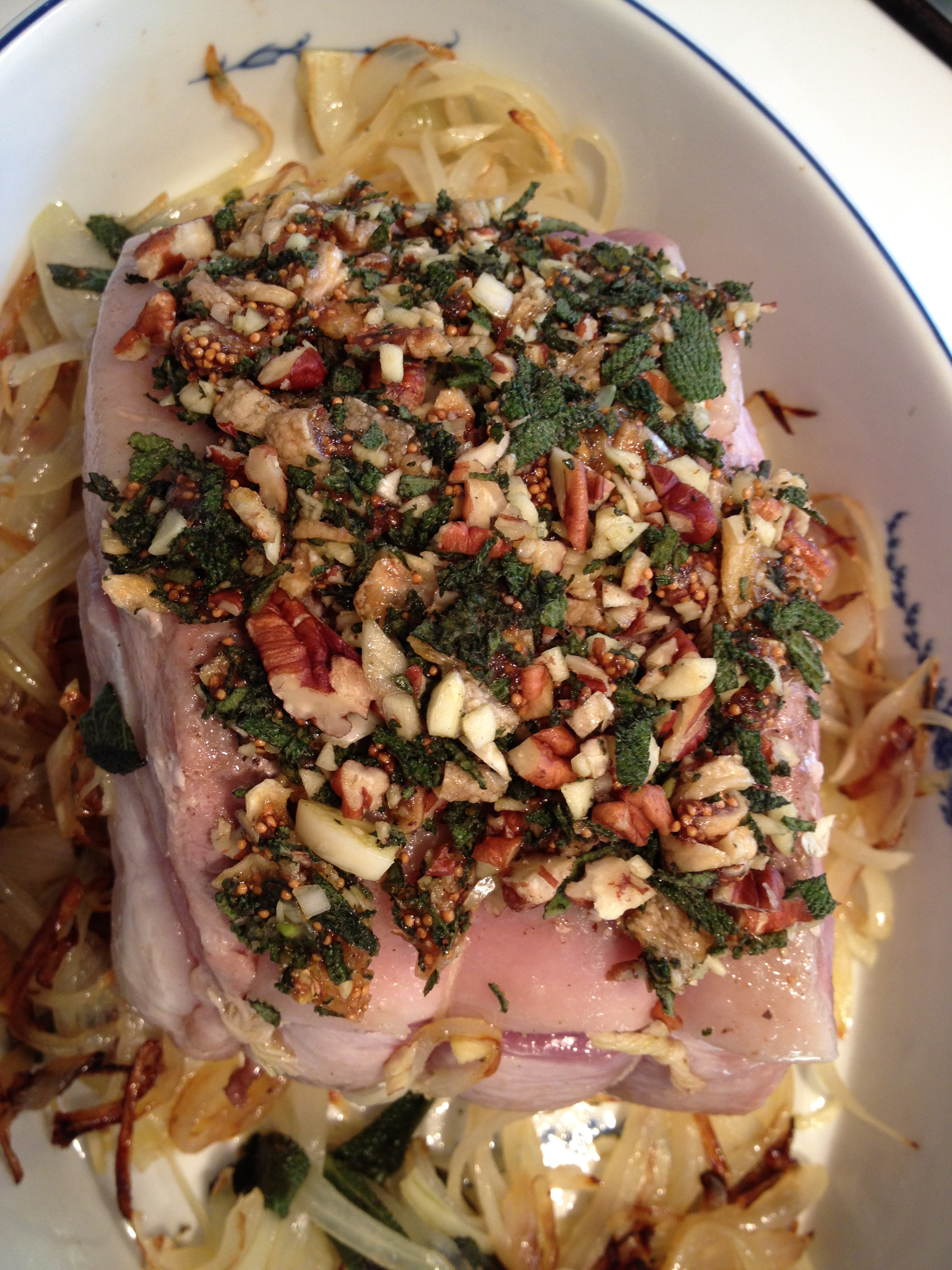 Mix the ingredients for the crust in a small bowl. (chopped pistachios, chopped figs, diced garlic, chopped sage leaves, chopped pecans, pinch of salt and pepper). Slice the onion and saute in a little olive oil until it is soft and tender and beginning to caramelize. Roast the pork on its own for about 20 minutes at 400 degrees F to get it going. Then take it out, pour the caramelized onion into the bottom of the roasting pan, sit the pork on top, surround with apple chunks, and affix the crust. Roast for about an hour and 45 minutes. Steam the bok choy while the pork is resting.